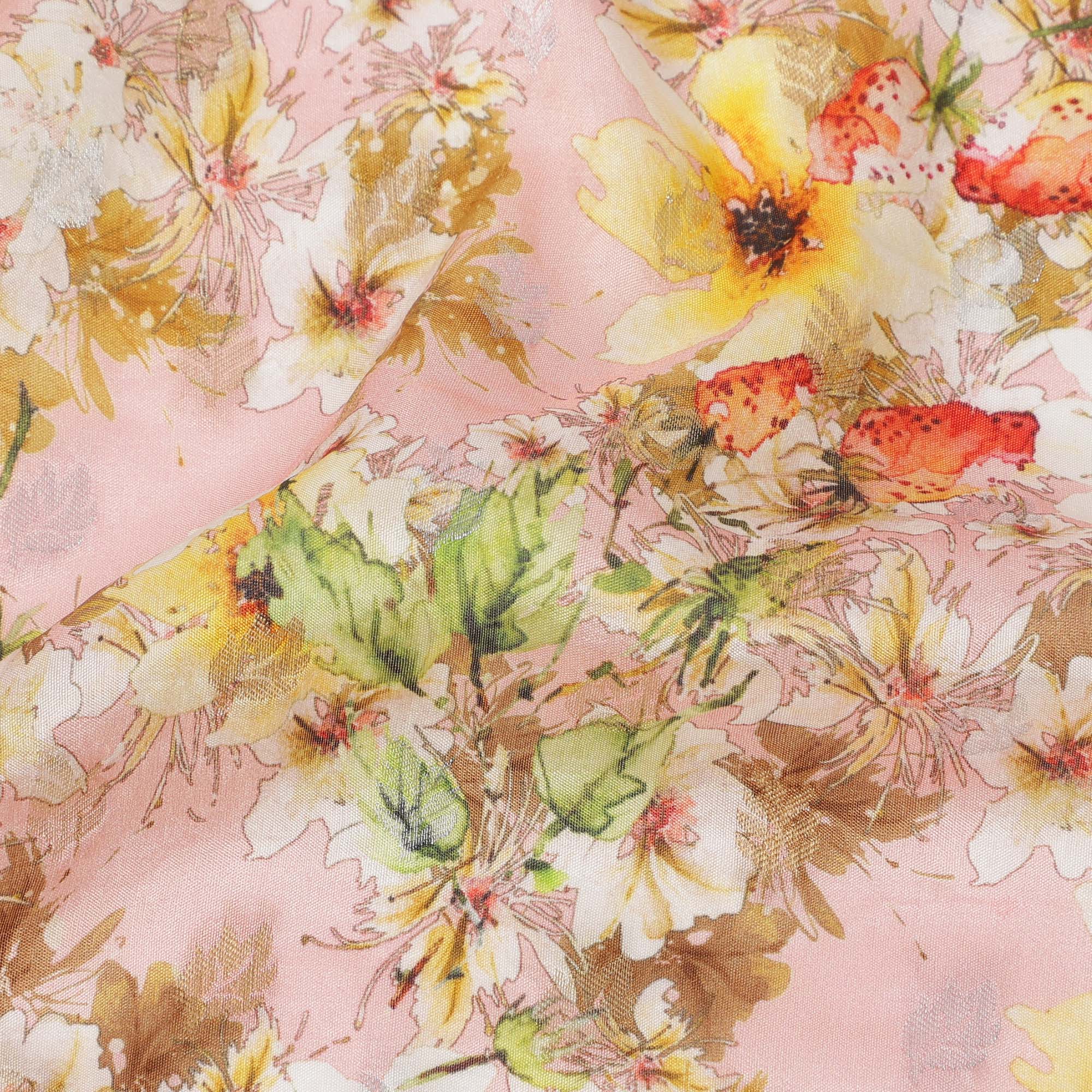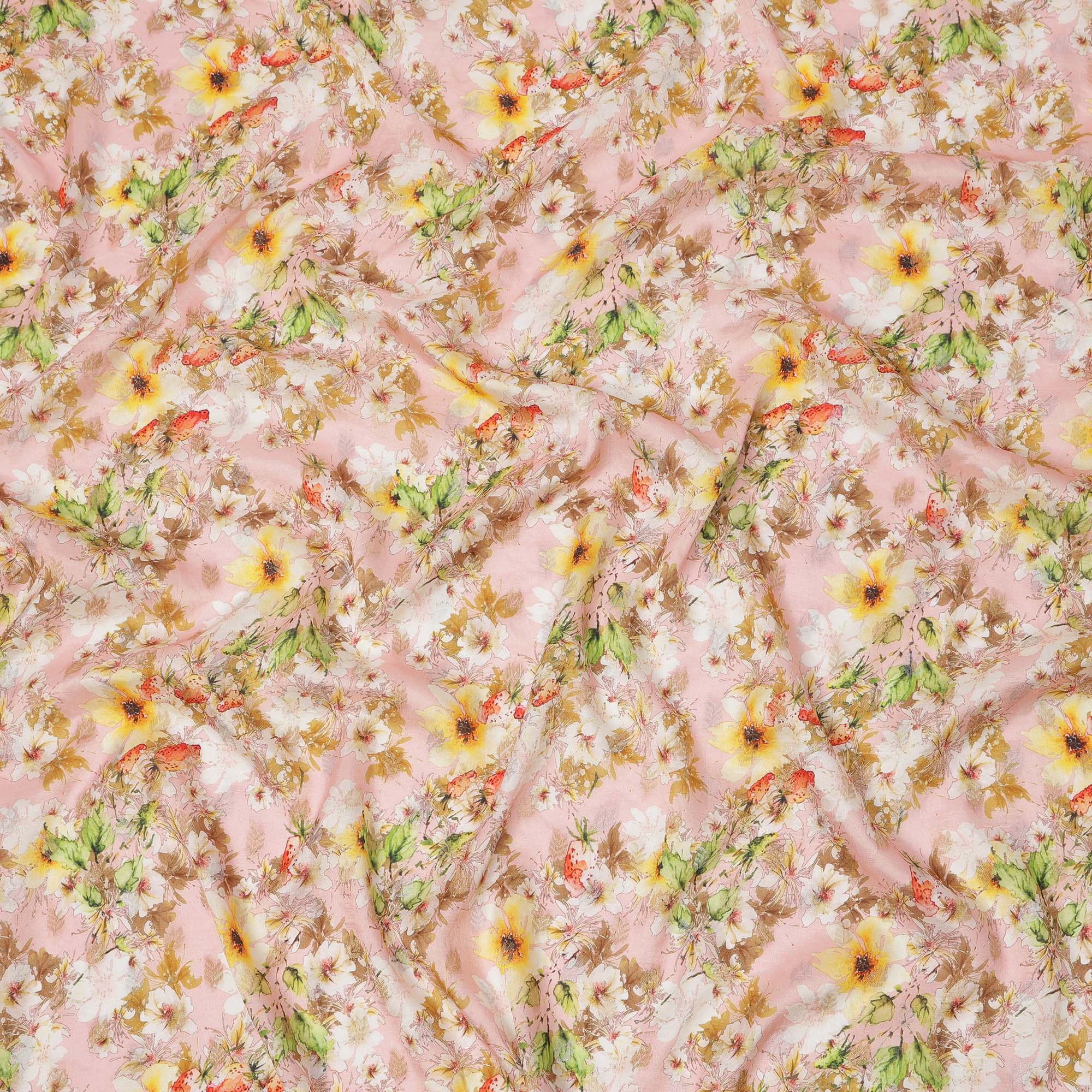 قماش كريب صناعي وردي فاتح مع طباعة رقمية لحديقة زهور صفراء