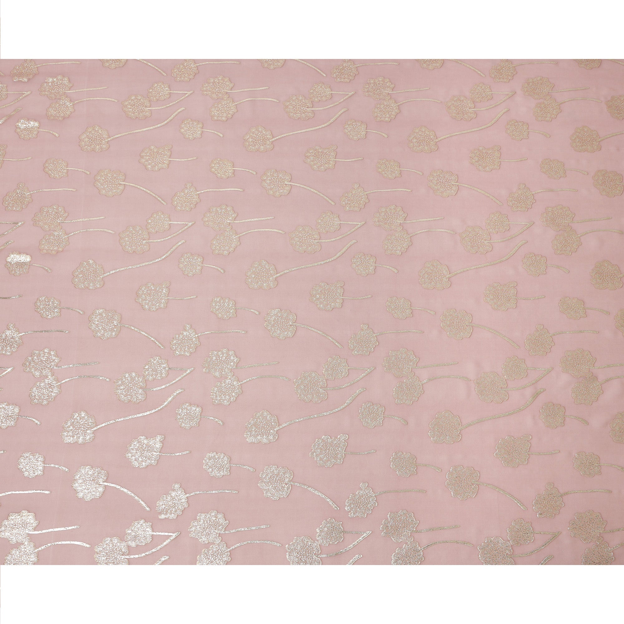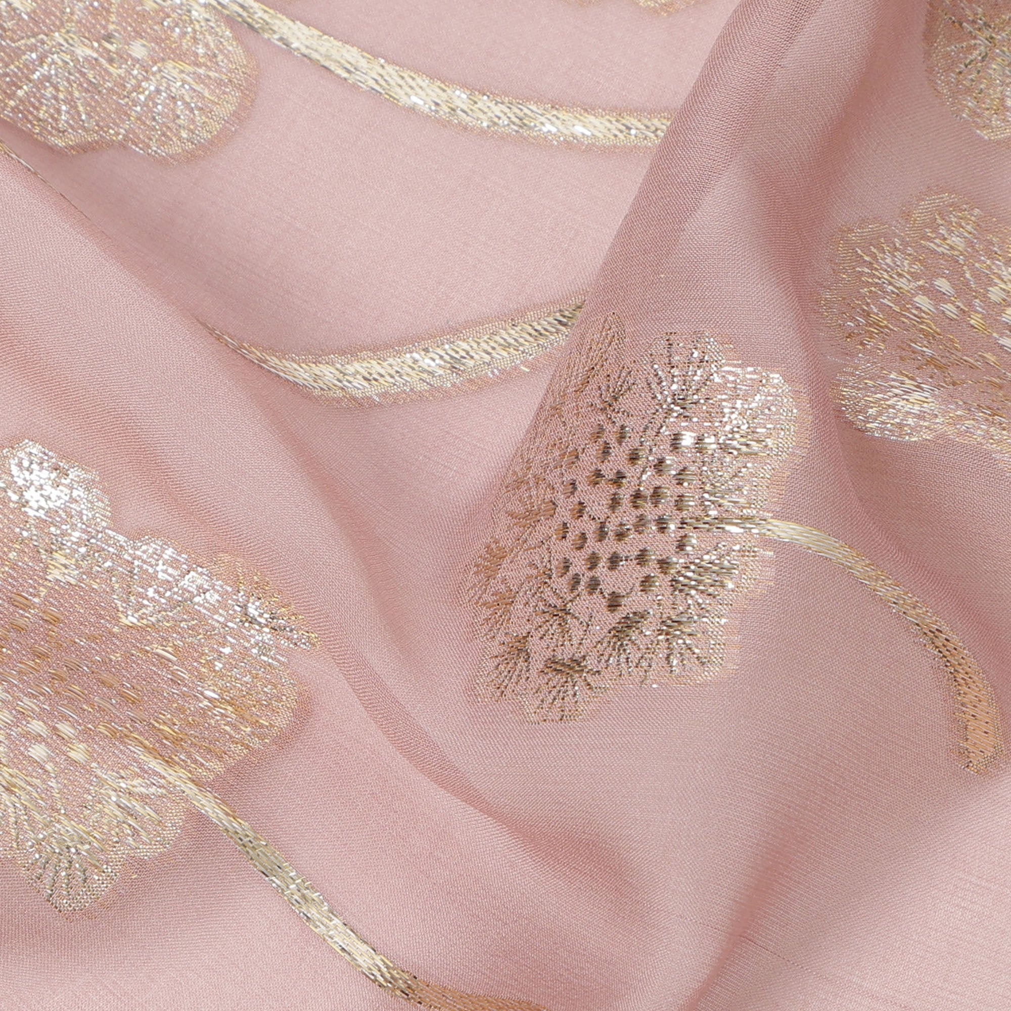قماش شيفون حريري وردي فاتح أنيق وفاخر، يتميز بزخارف زهرية ذهبية معدنية معقدة منسوجة بخيوط لوريكس رقيقة، ينضح بالأناقة والتألق... اقرأ أكثر اقرأ أكثر