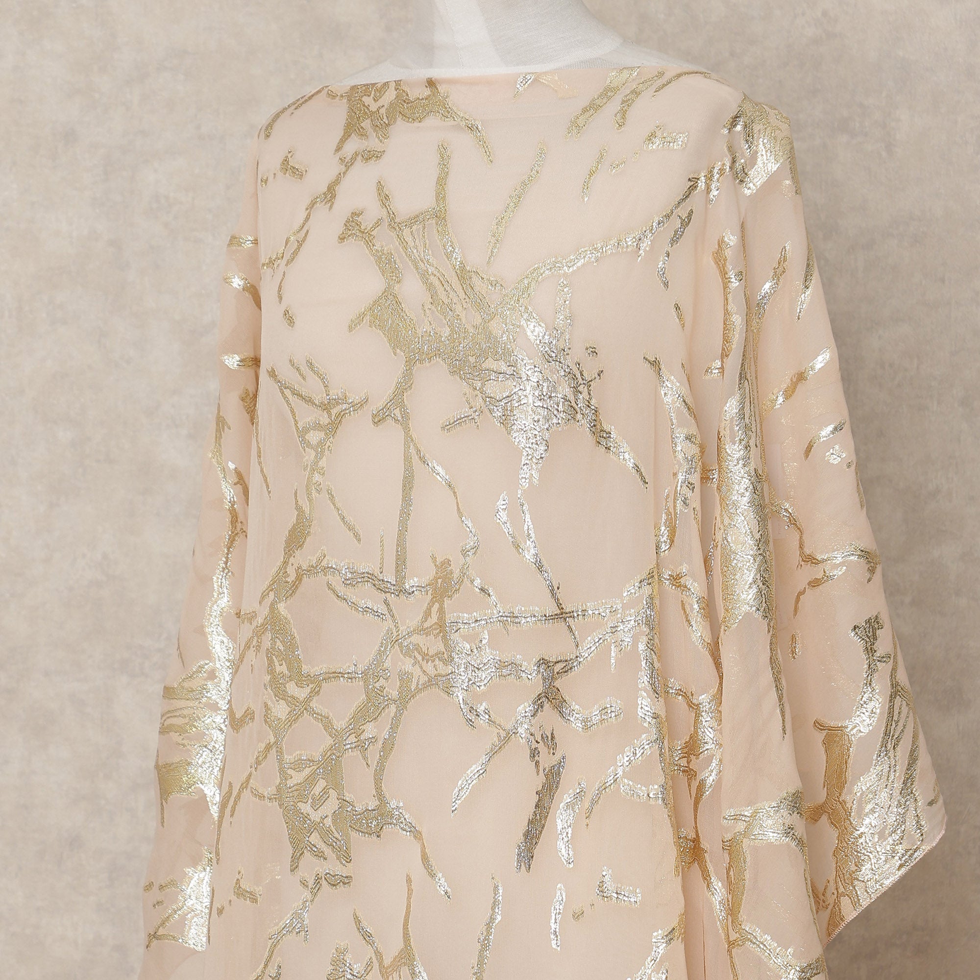 The Blush Pink Traditional Somali Silk Chiffon Dirac Fabric with Metallic Lurex is a true expression of grace and opulence,... اقرأ أكثر اقرأ أكثر