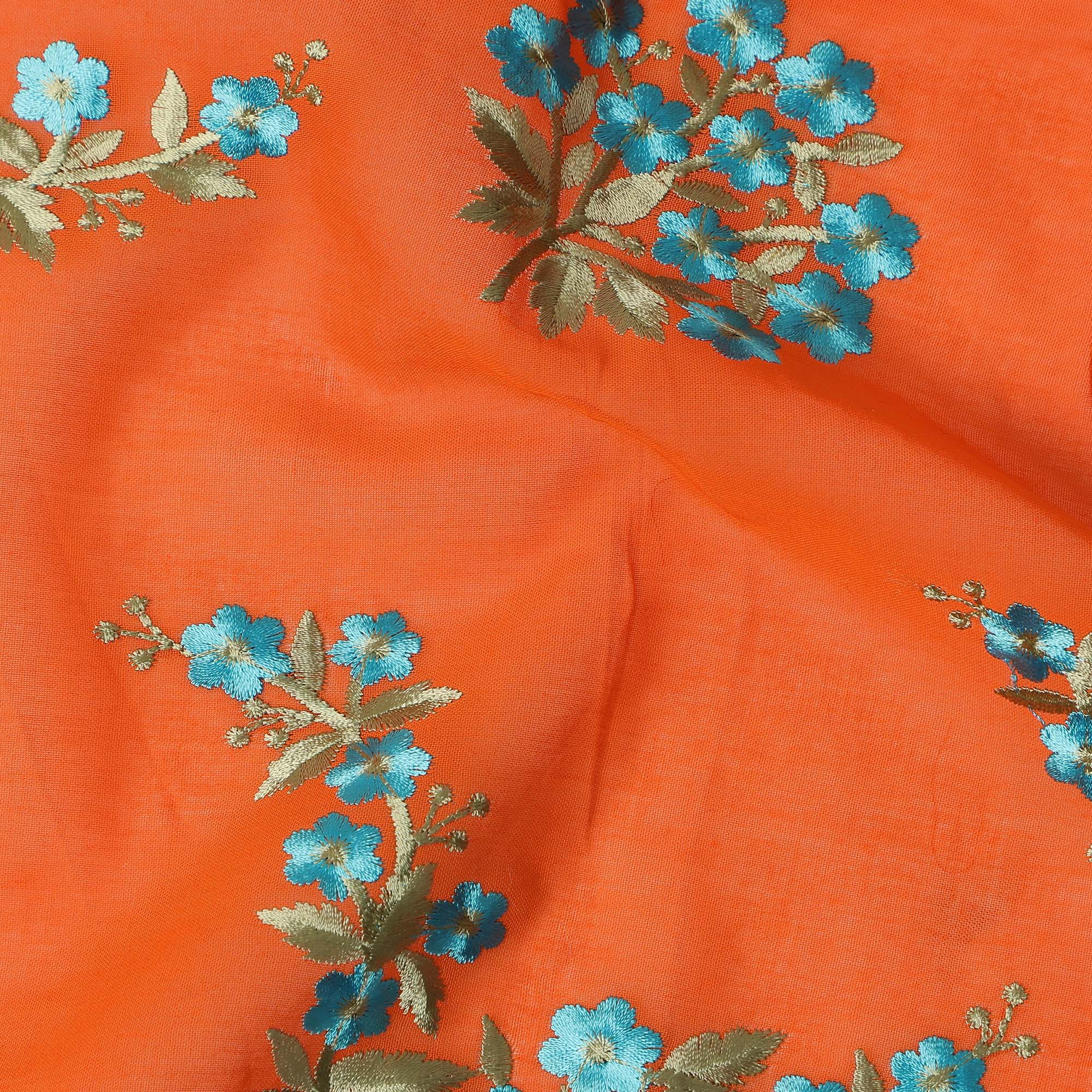 • Bright Orange Traditional Sudanese Thobe Fabric Pure Cotton Voile 4.5 Meters Piece Width 140 Cms Soft Breathable Ethnic Wear Material with Elegant Blue Floral Embroidery Made in India-D27600