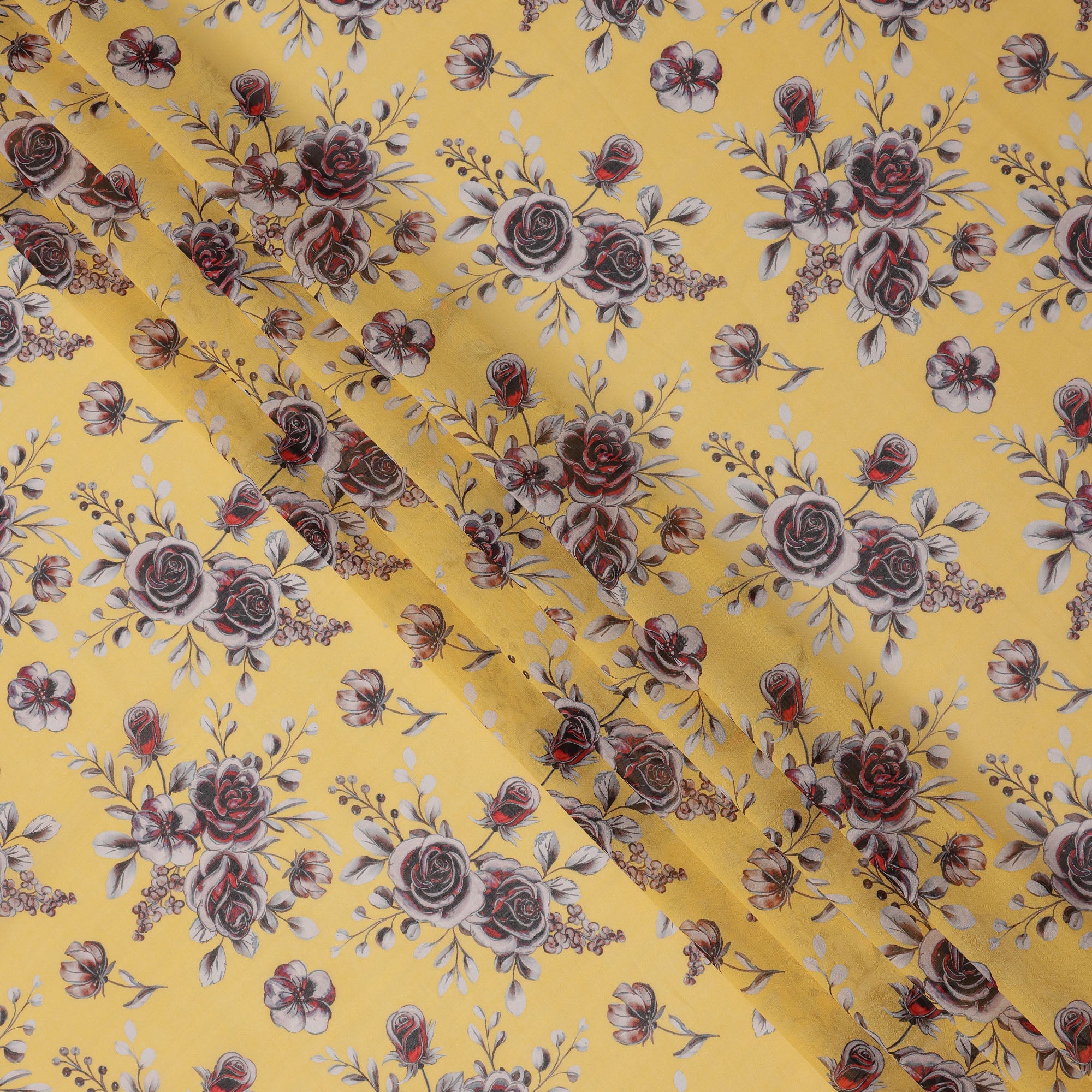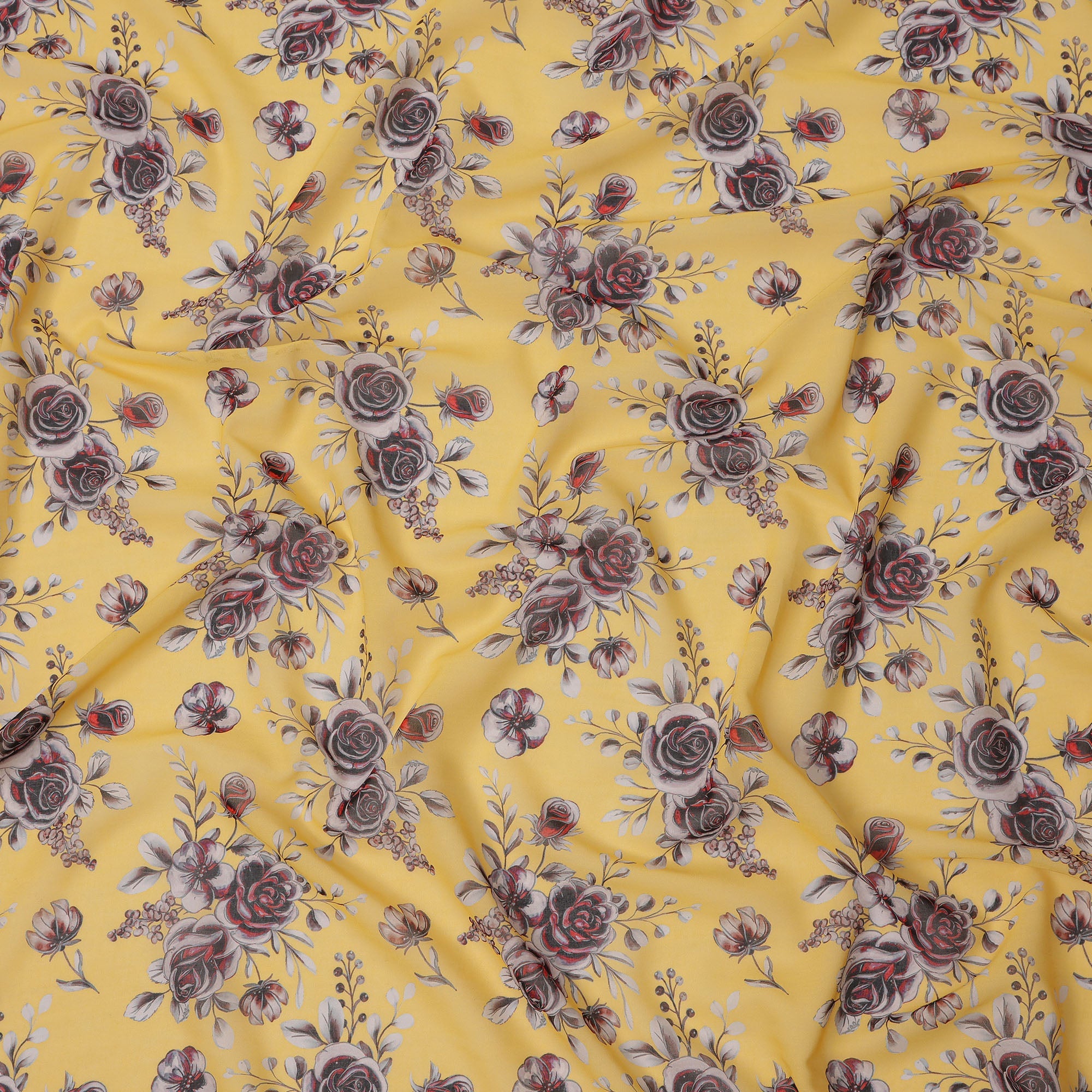قماش فوال قطني بقاعدة صفراء زاهية مع نقش زهور وردية حمراء ورمادية، بنمط باقة كلاسيكي، عرض 110 سم، صنع في الهند - D23794