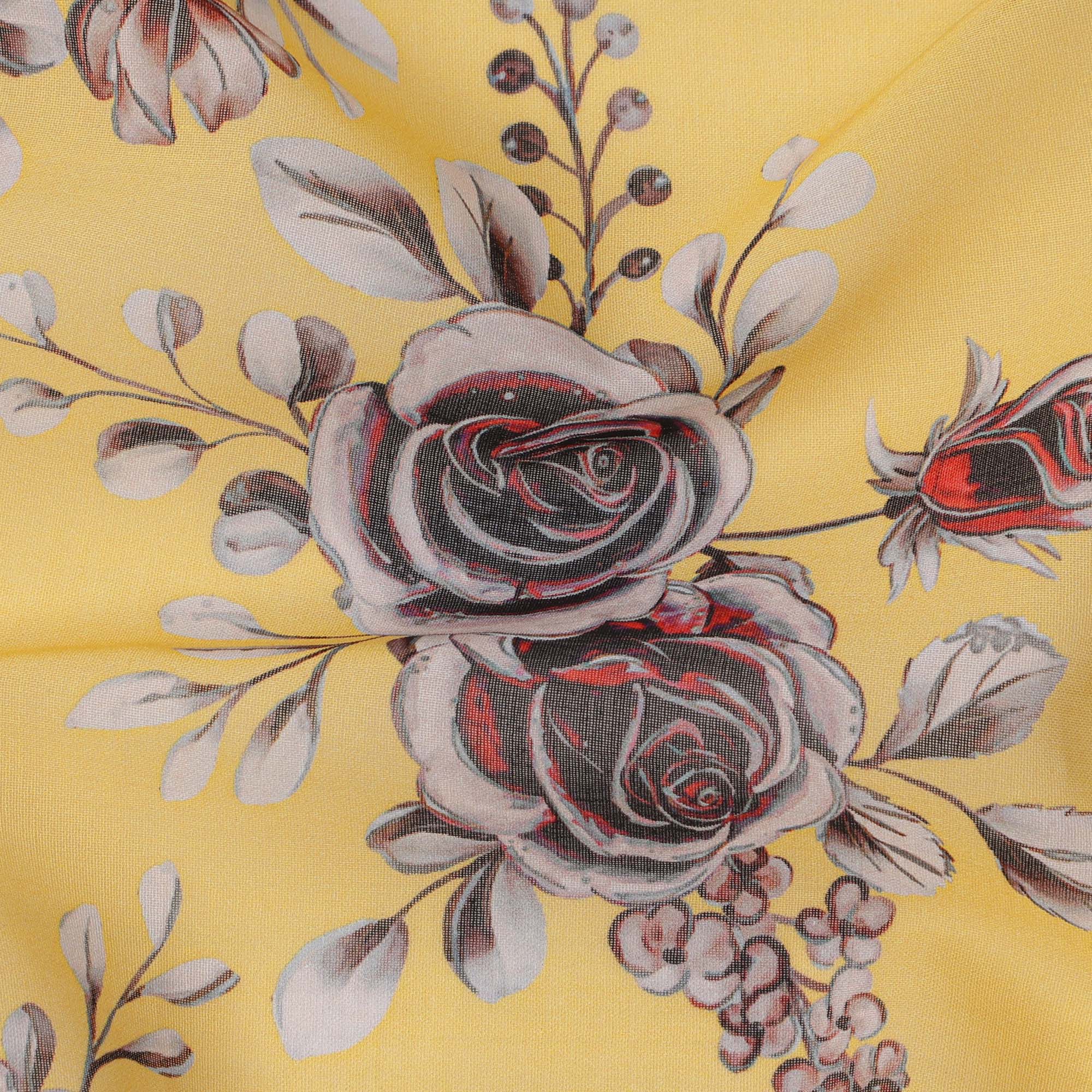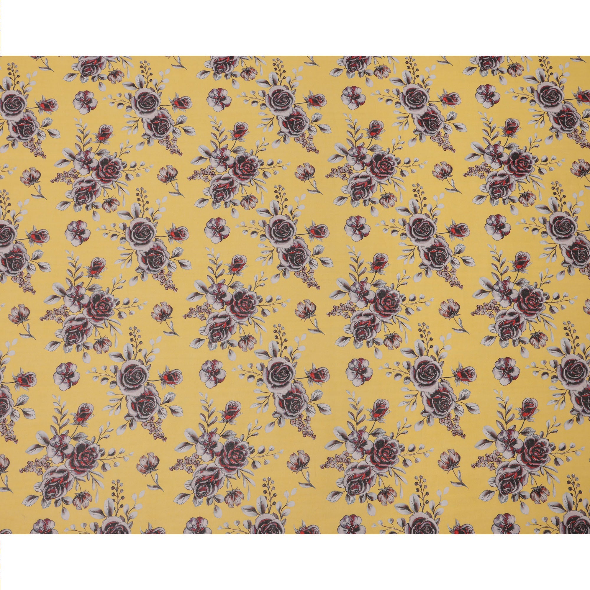 قماش فوال قطني أصفر لامع مزين بباقات من الورود الحمراء والرمادية