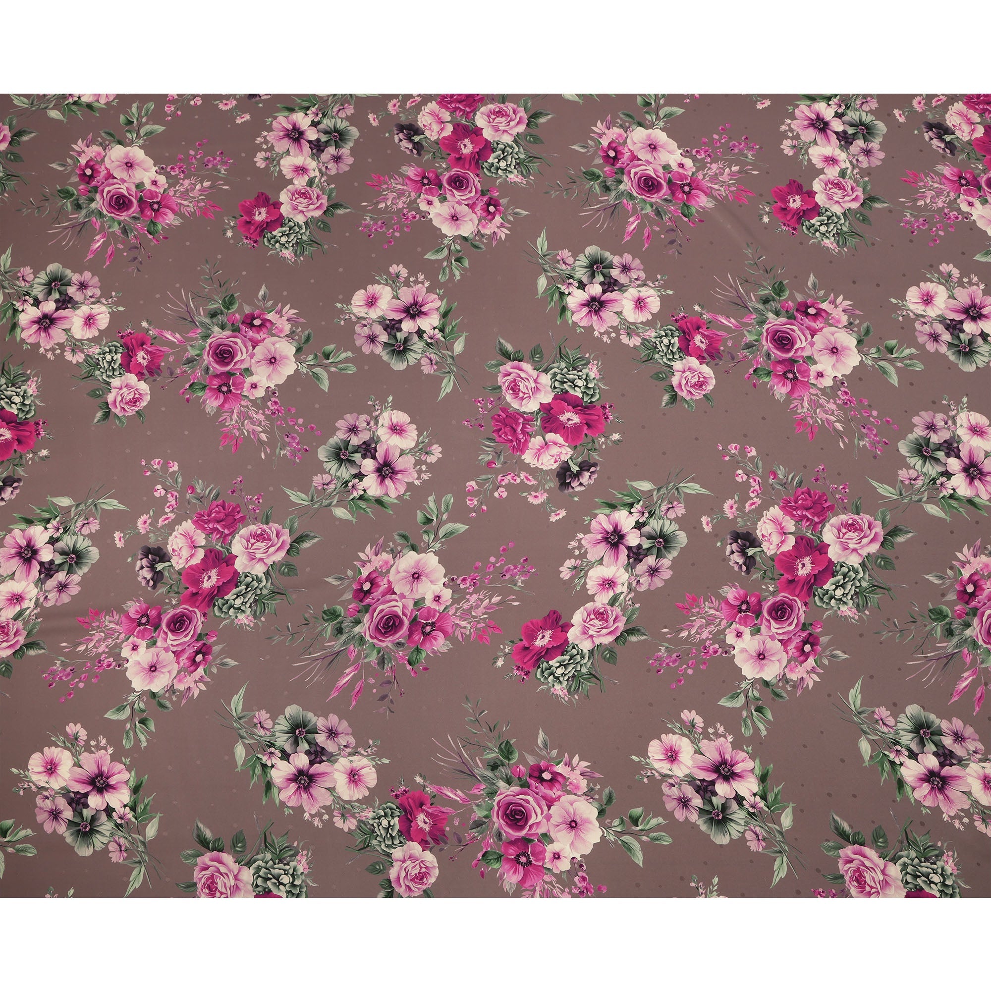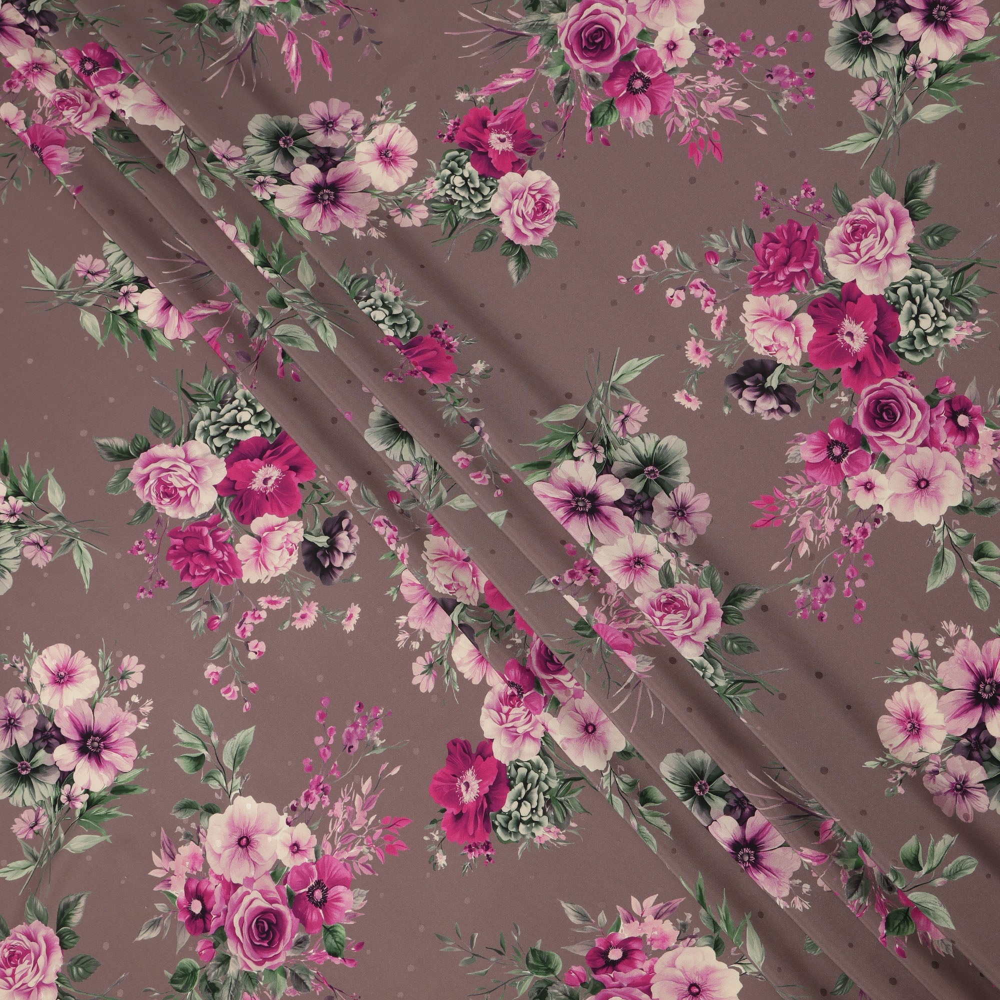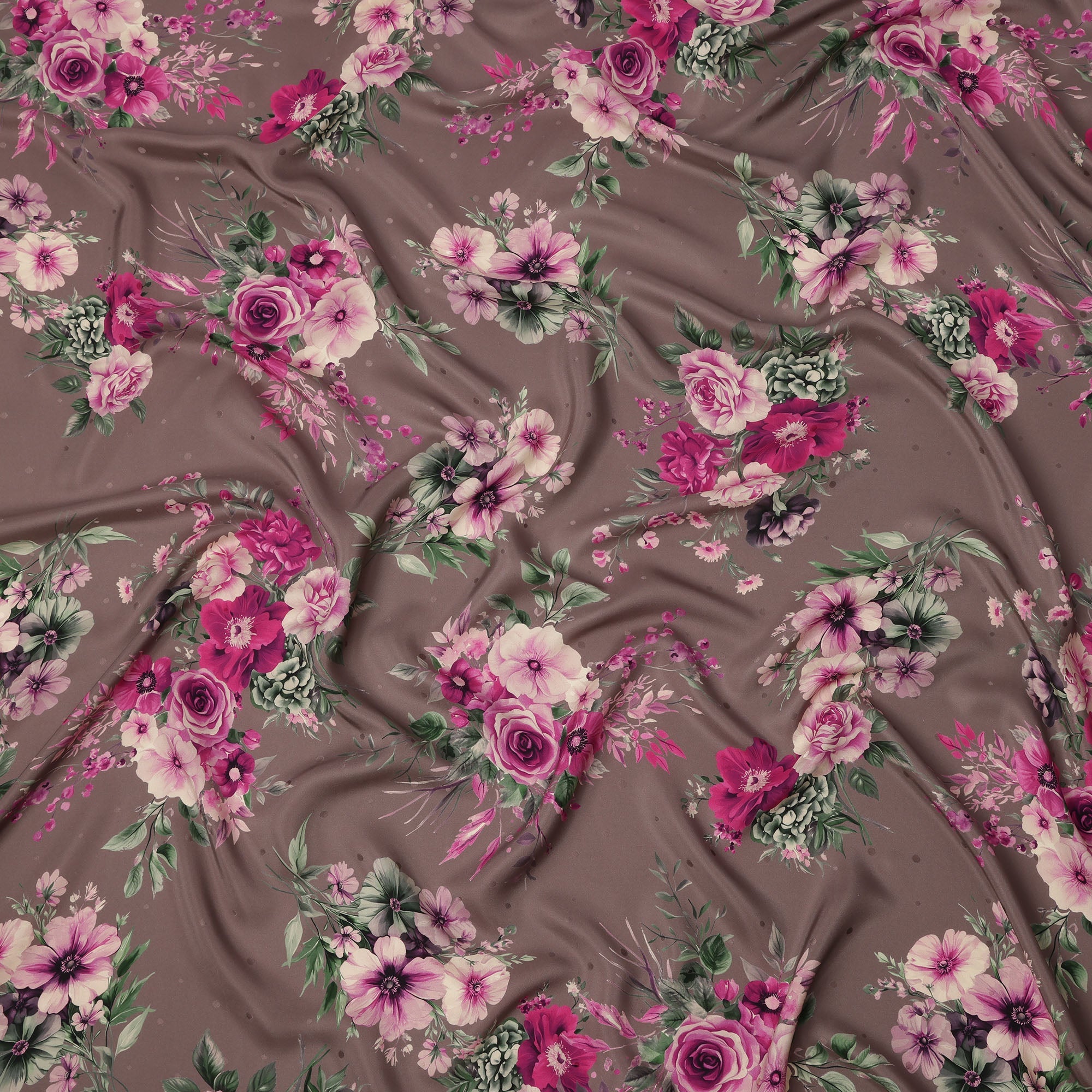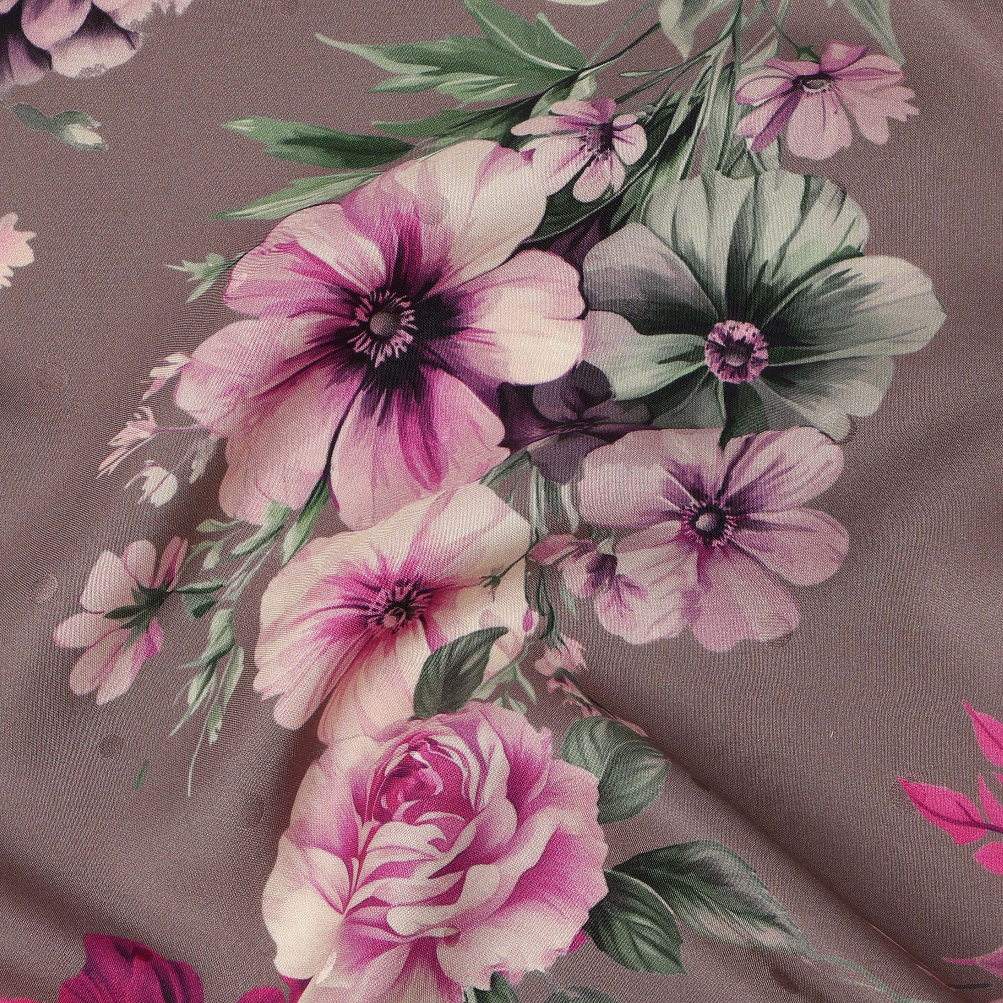 قماش ساتان حريري إيطالي فاخر بقاعدة بنية اللون وطبعة باقة زهور وردية