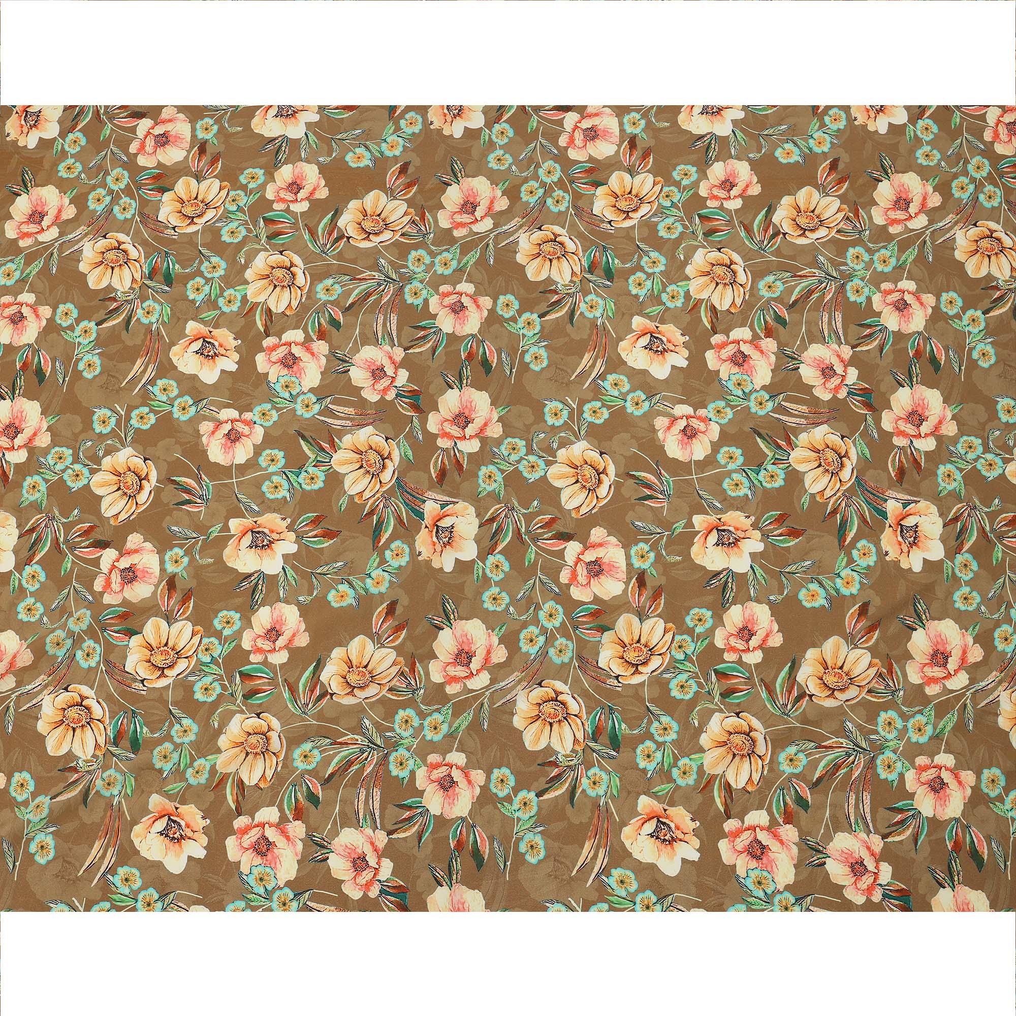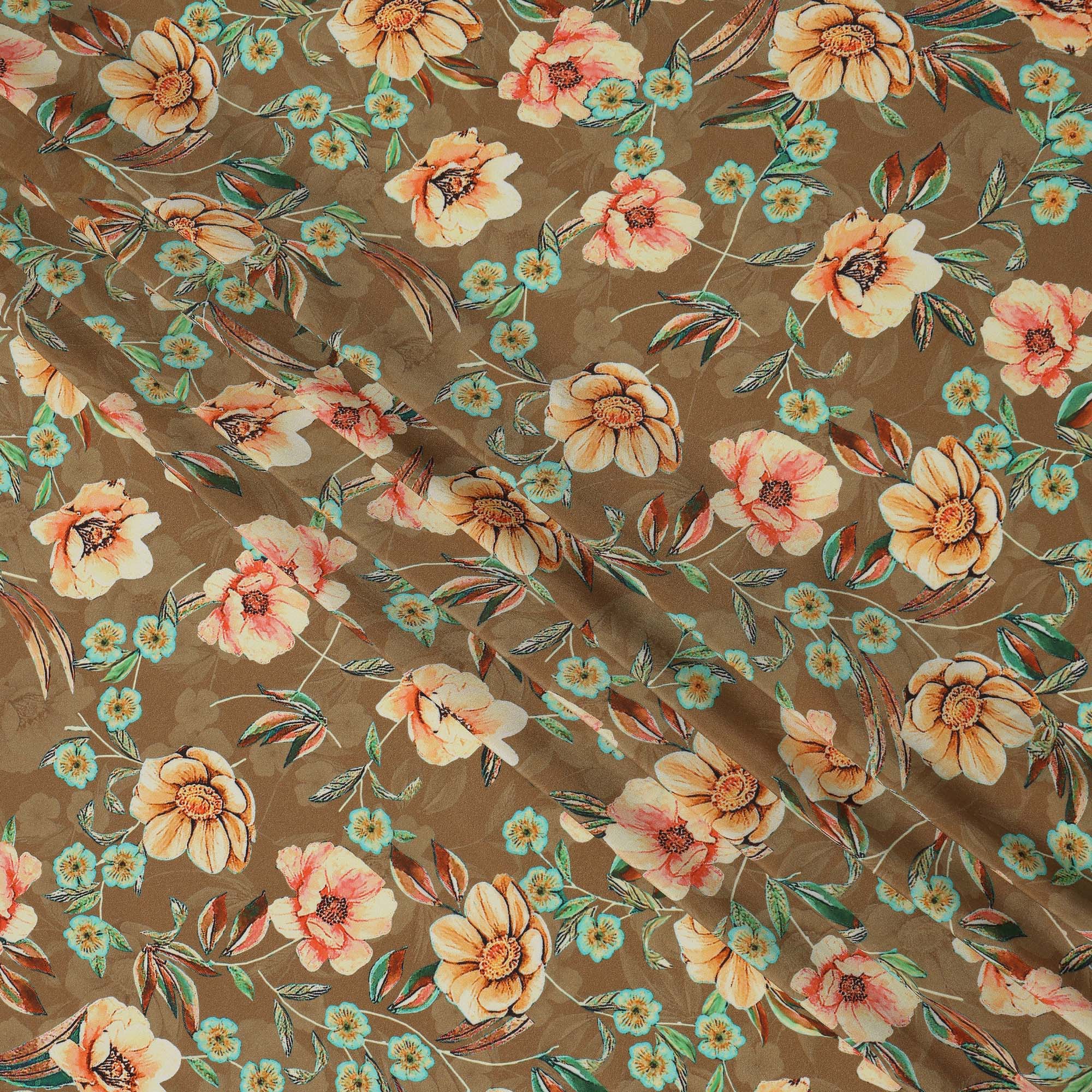 Premium brown pure silk crepe fabric with beige floral botanical print.
