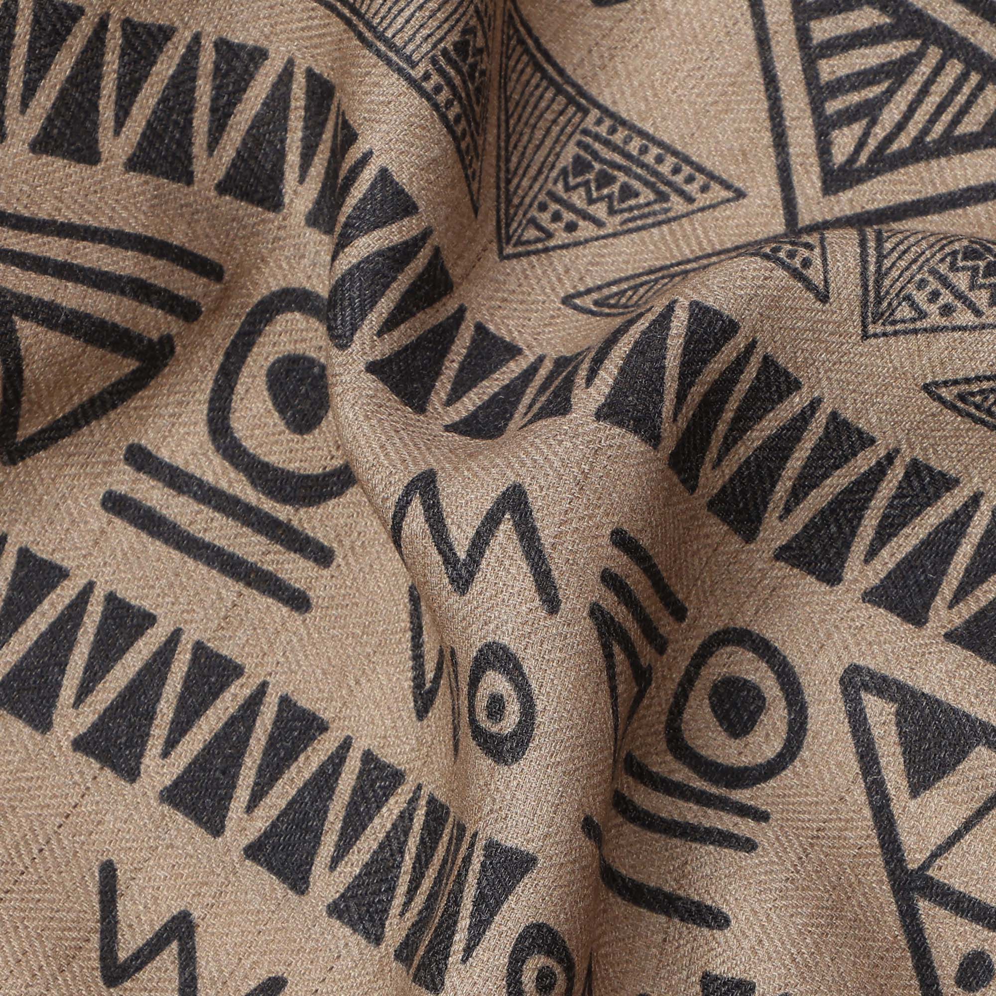قماش بني من مزيج الكتان والفيسكوز مع طبعة هندسية قبلية باللون الأسود