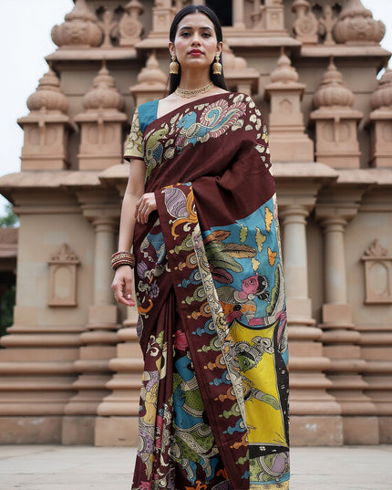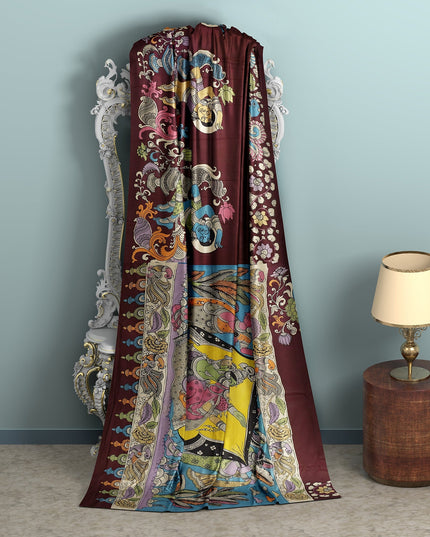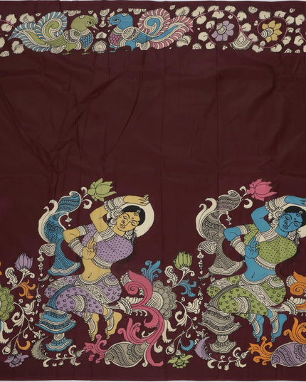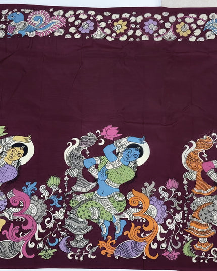 ساري كالامكاري حرير مانجالاجيري عنابي اللون بزخارف أسطورية مرسومة يدويًا، عرض 110 سم، أصله: سري كالاهاستي، الهند، طوله 5.5 متر مع بلوزة - D22865