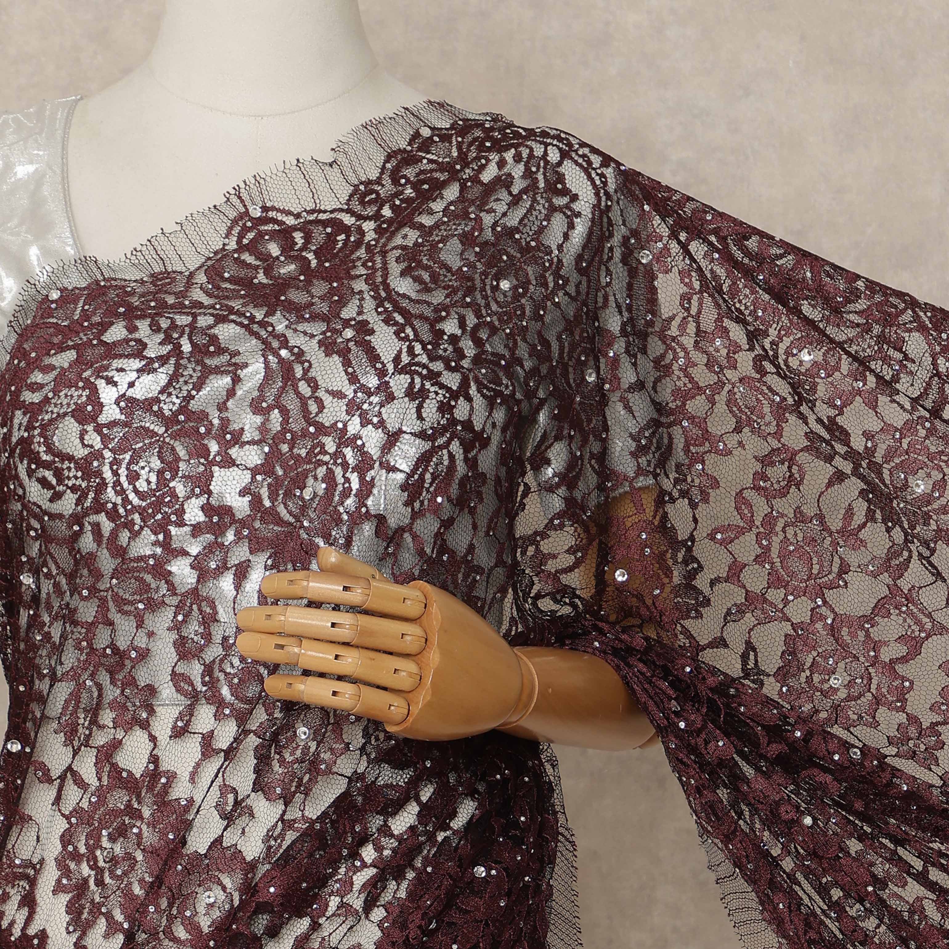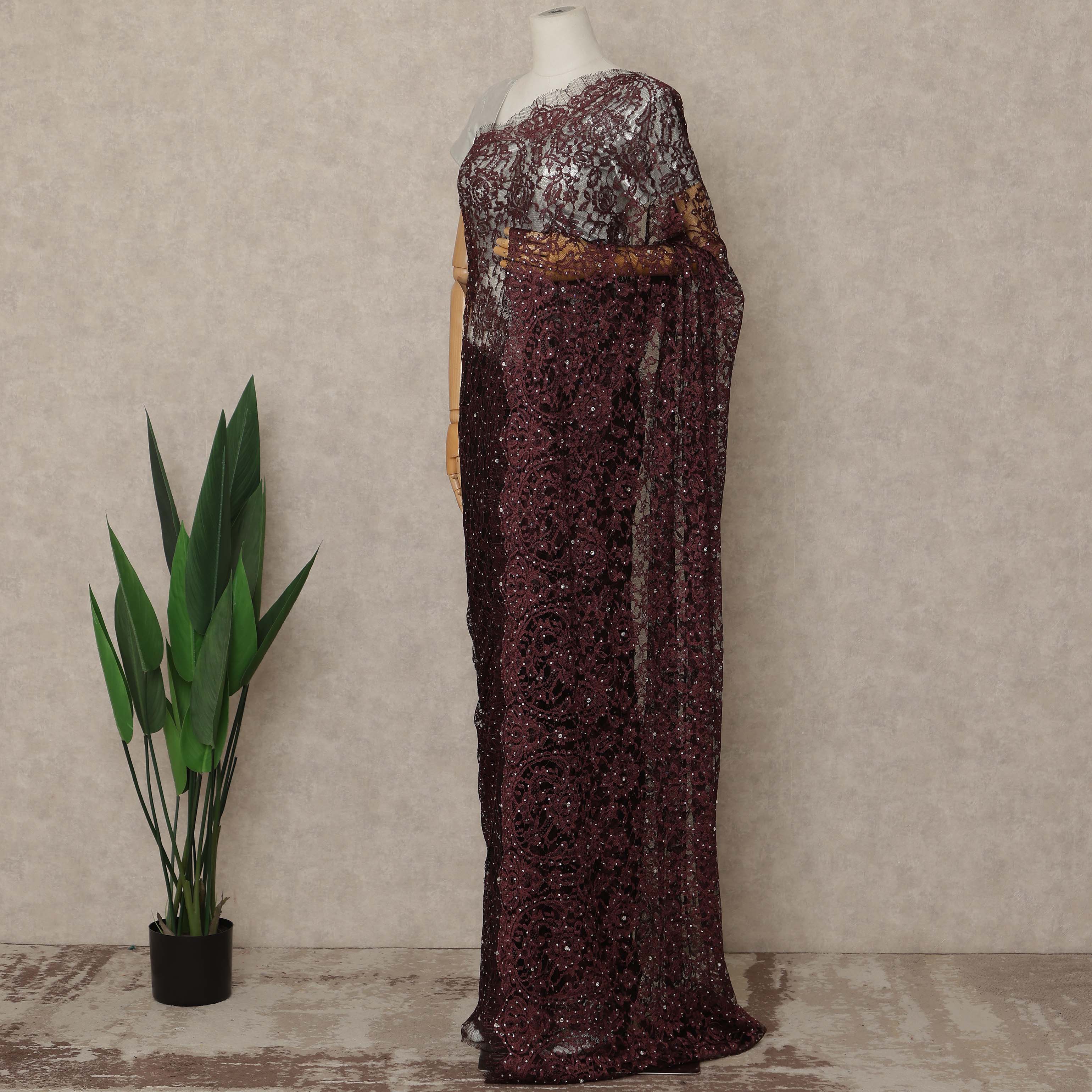 Burgundy Premium French Chantilly Saree Lace With Stone Work 5.5 Mtrs Length 110 Cms Width Designer Net Fabric Made In France, Blouse Not Included-D28133