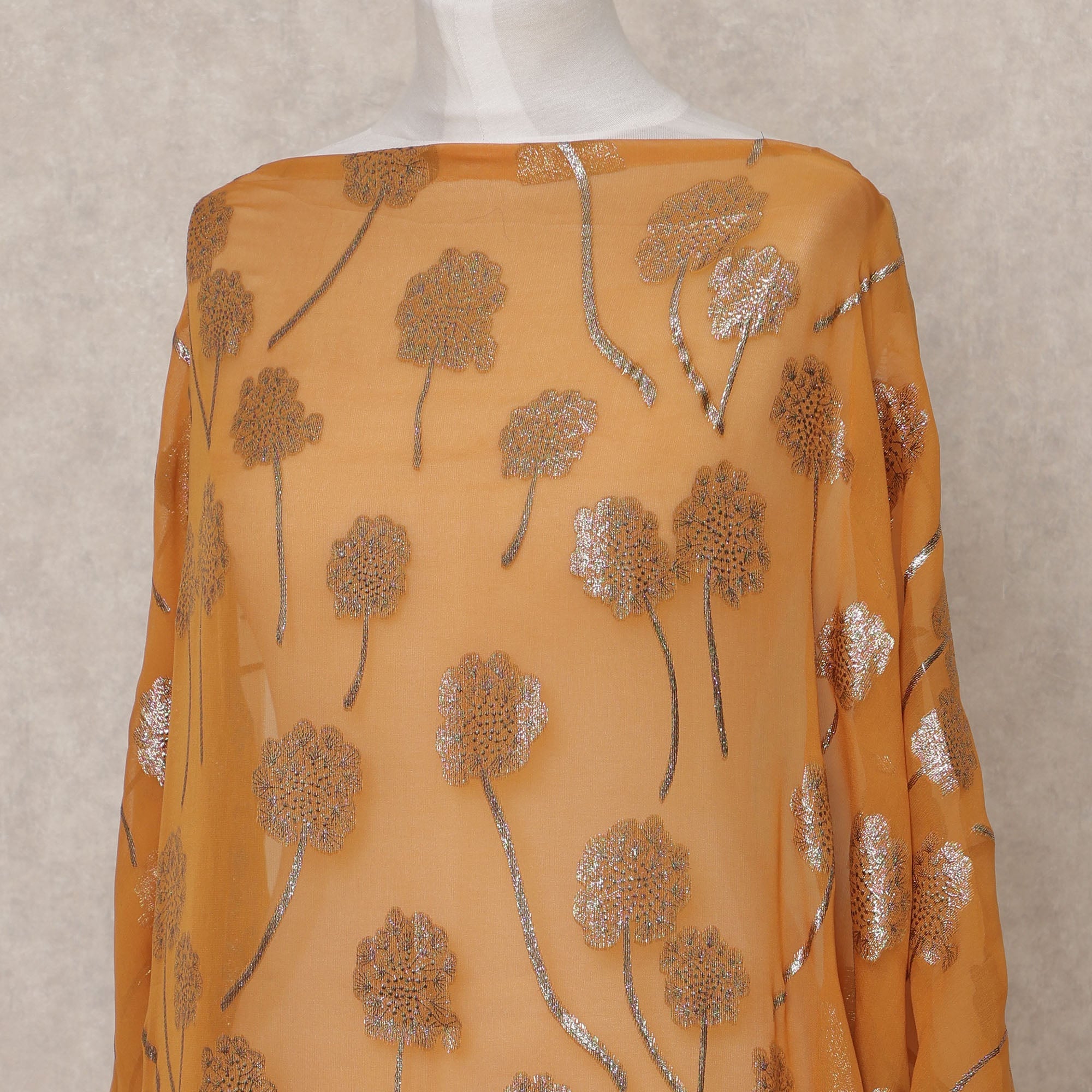 قماش ديراك شيفون حريري صومالي بني كراميل، مزين بطبقة من اللوريكس المعدني، يجسد لمسة دافئة وطبيعية، معززة بزخارف نباتية فضية... اقرأ أكثر اقرأ أكثر