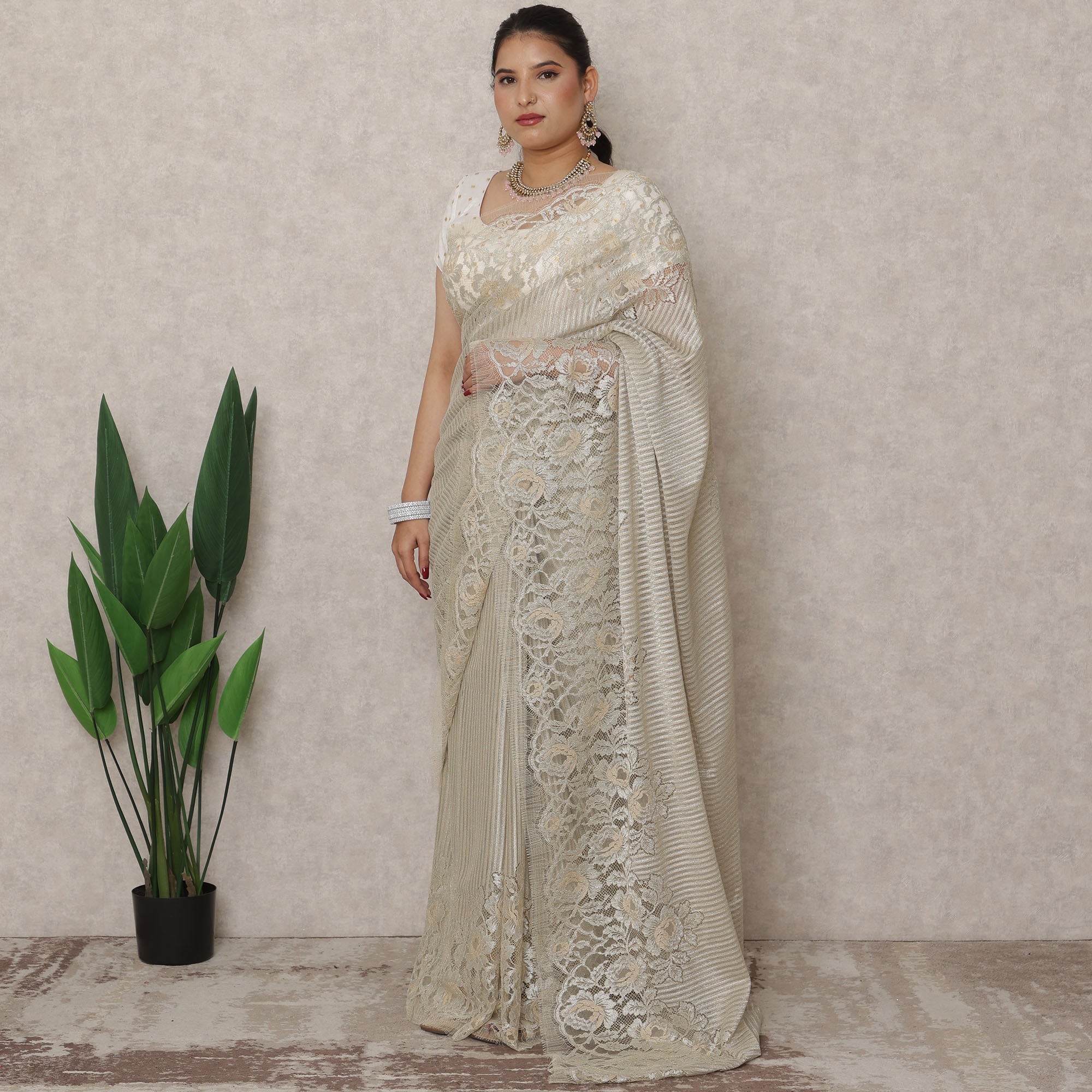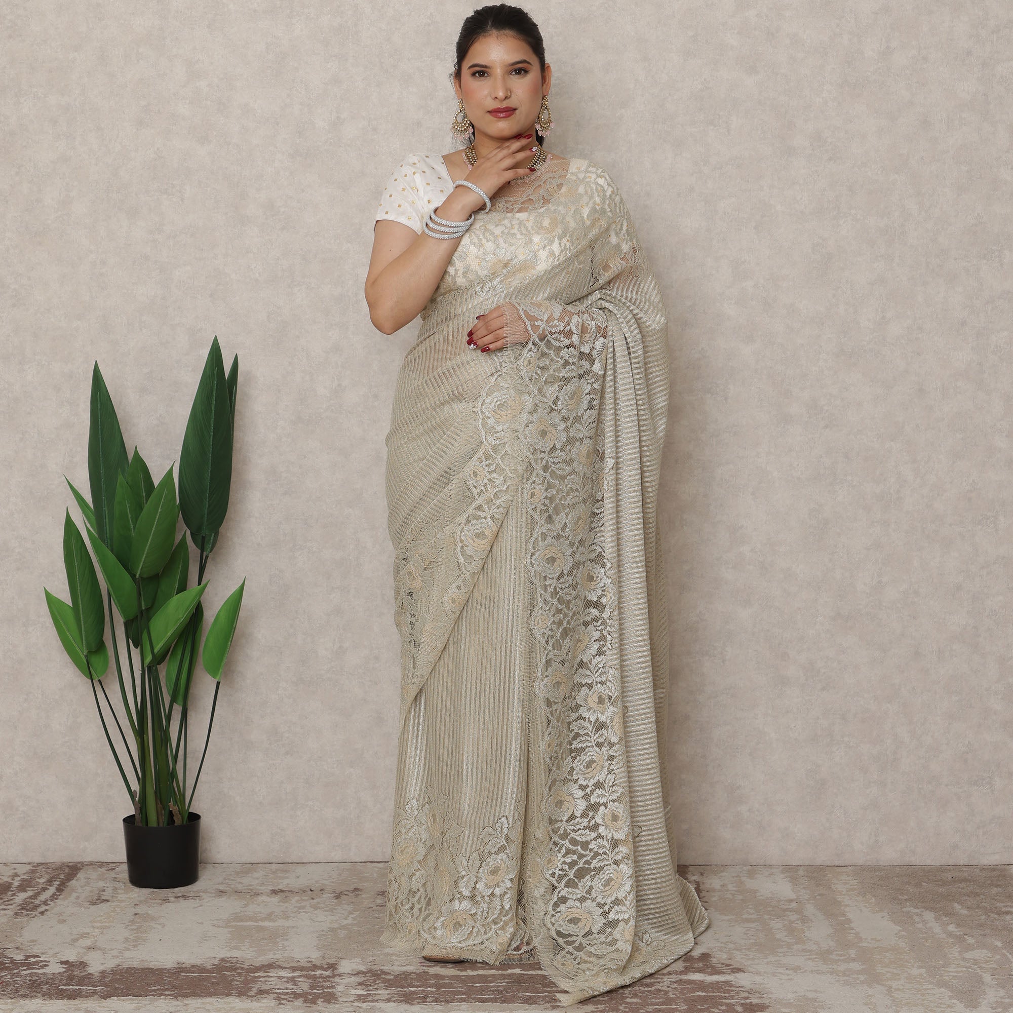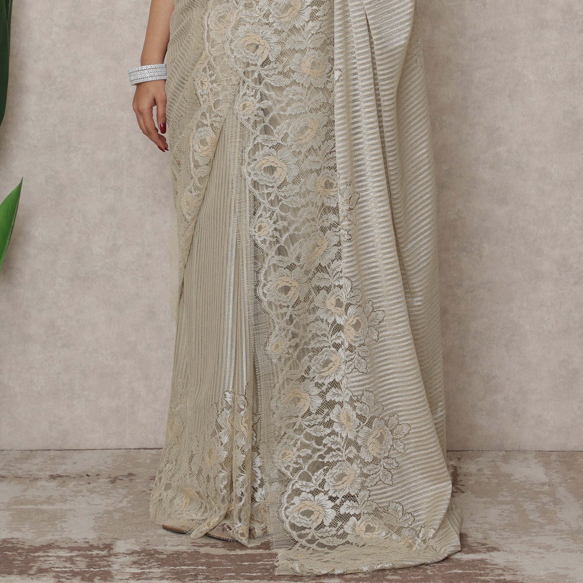 ساري فرنسي فاخر من قماش شانتيلي معدني بلون الشمبانيا والبيج، بطول 5.5 متر وعرض 110 سم، صنع في فرنسا - D24445