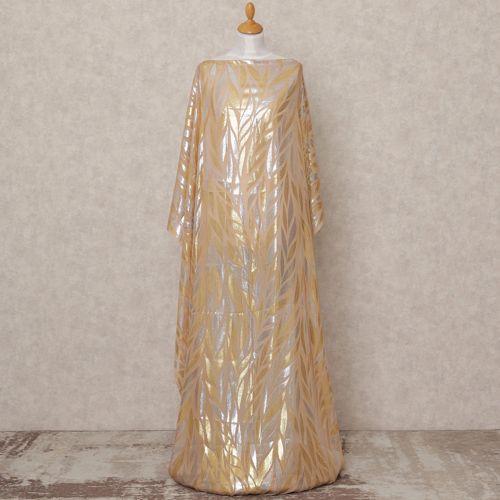انطلقي نحو الأناقة الراقية مع قماش ديراك الشيفون الصومالي التقليدي بلون الشمبانيا البيج، وهو تحفة فنية من كوريا الجنوبية تتميز بمزيج رائع من اللوريكس المعدني الذهبي والفضي في زخارف أوراق الشجر المذهلة. تتدفق قاعدة الشيفون الحريري الشفاف الفاخر مع ثنية أنيقة، مما يجعله مثاليًا لابتكار ملابس ديراك ملكية بلمسة من اللمعان العصري. يبلغ طول هذا القماش 3.5 متر وعرضه 140 سم، ويوفر تغطية واسعة وانسيابًا سلسًا يكمل كل من الإعدادات الاحتفالية والرسمية. ينضح لون الشمبانيا البيج المضيء المقترن بخيوط معدنية ثنائية اللون بالرقي مع الاحتفال بالثراء الثقافي. صممته شركة ريجال فابريكس، هذا النسيج عالي الجودة مثالي للمناسبات الخاصة وفساتين الزفاف أو التجمعات الاحتفالية حيث تريدين التميز بفخامة رقيقة. يعكس التصميم قزحي الألوان الضوء بشكل جميل، مما يعزز مظهرك مع كل حركة. للحفاظ على ملمسه وبريقه، يوصى بالتنظيف الجاف. تسوق عبر الإنترنت اليوم واستمتع بقطعة خالدة تجمع بشكل مثالي بين الفن الصومالي التقليدي والأناقة المعاصرة.