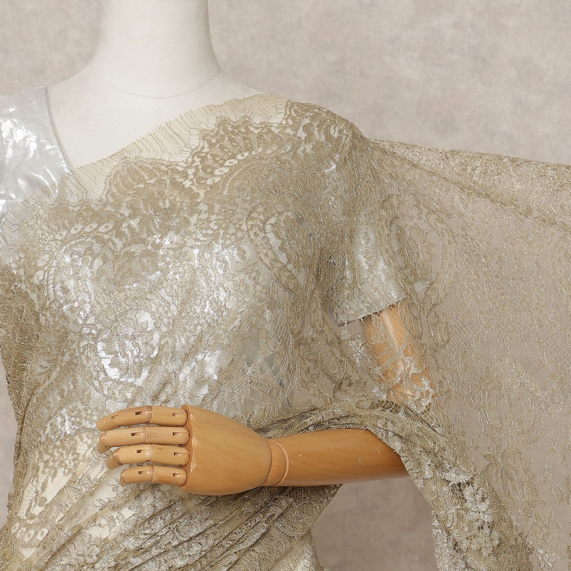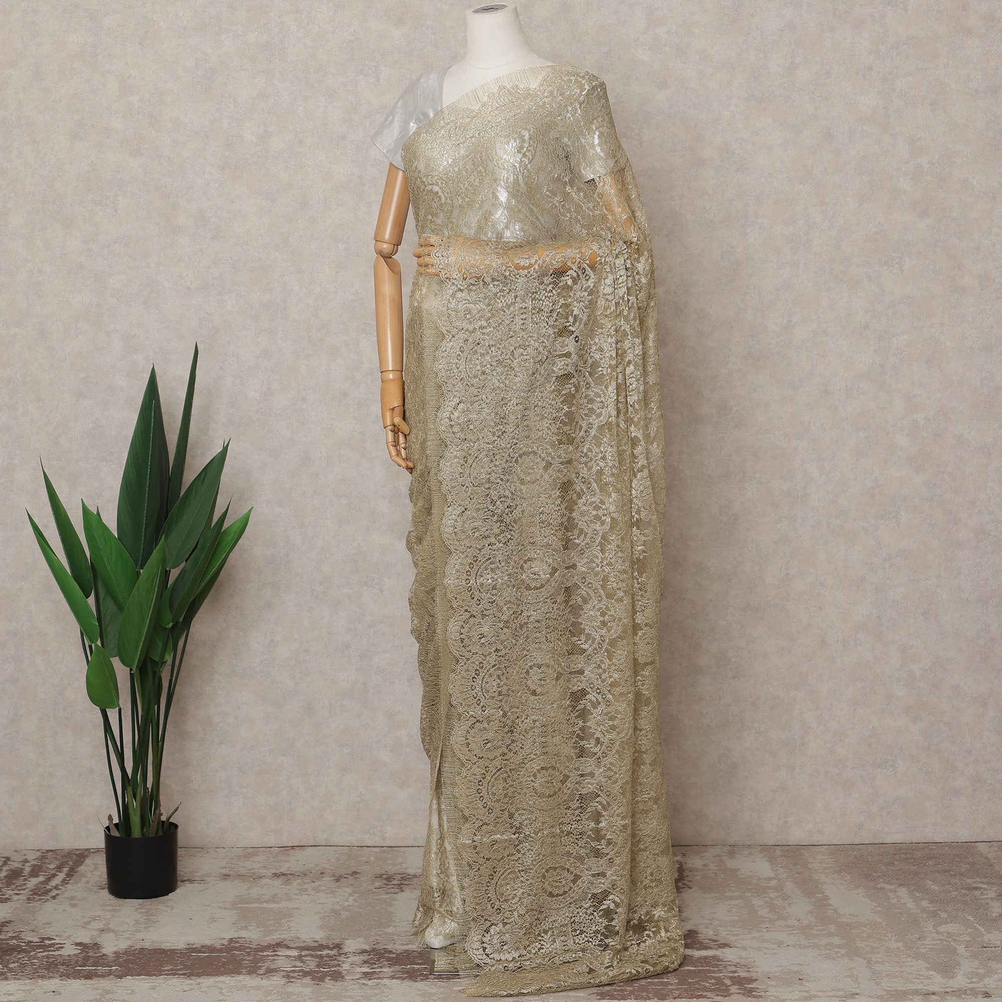 Champagne Gold Premium French Metallic Chantilly Lace Saree, Width 110 Cms, Length 5.5 Mtrs, Imported from France-D25690