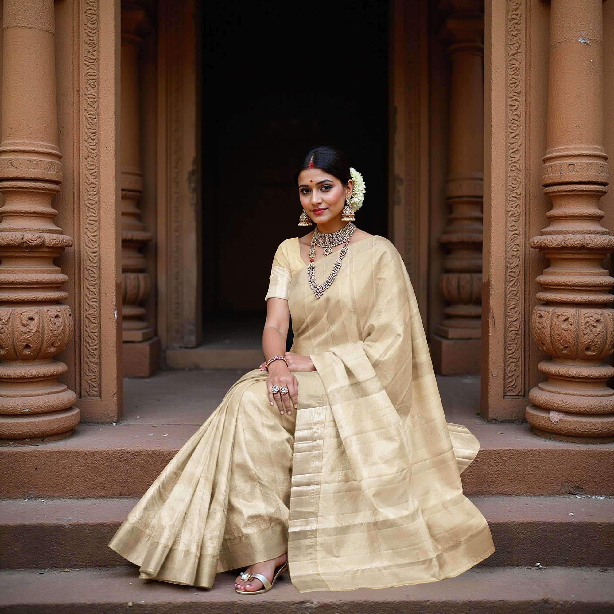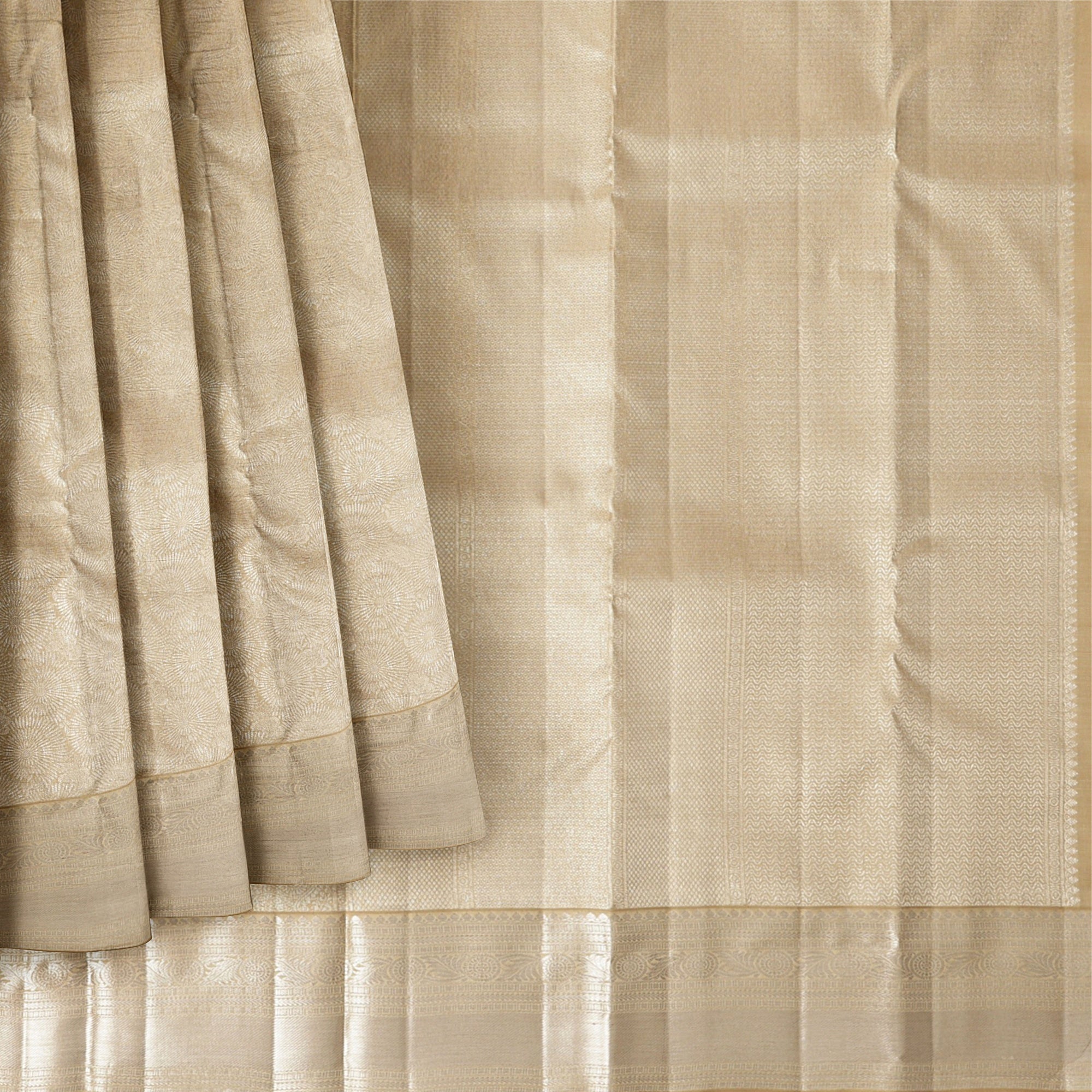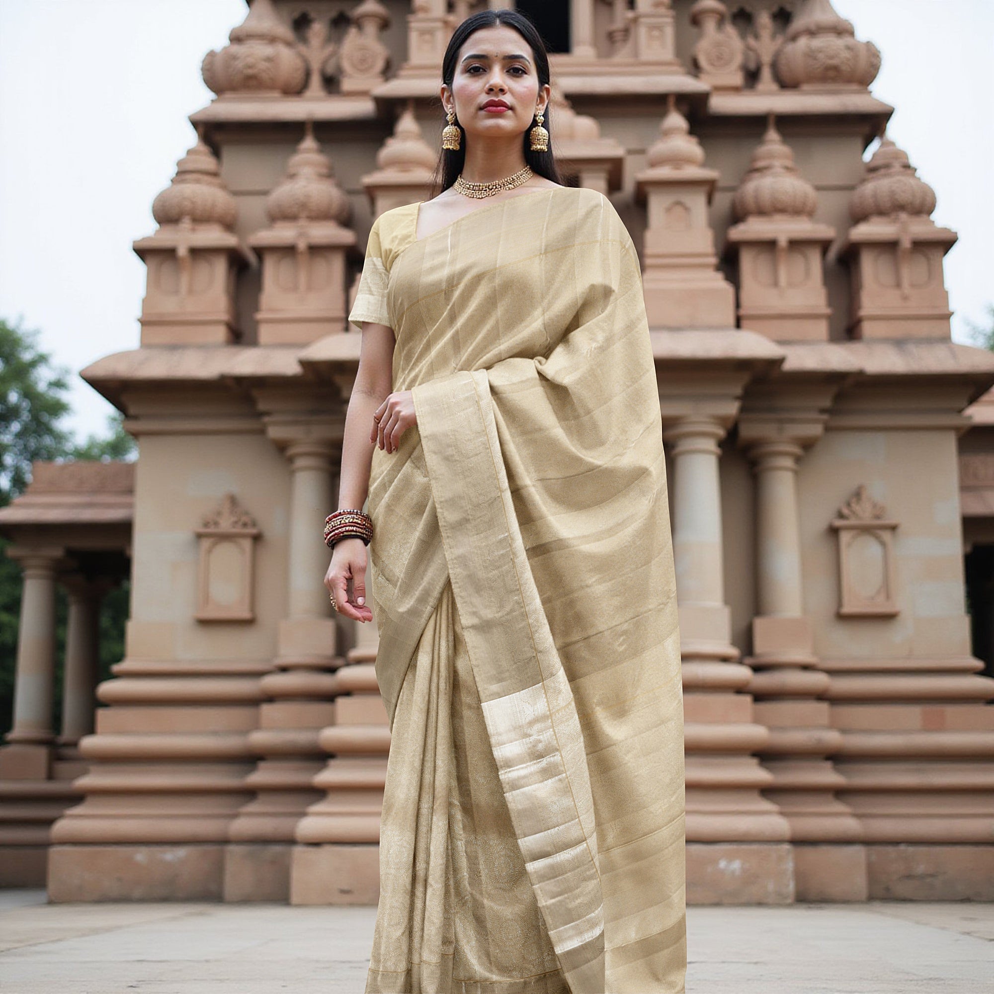 ساري كانجيفارام من الحرير الخالص بلون الشمبانيا الذهبي، بزخارف منسوجة يدويًا رقيقة وحواف لامعة، بطول 5.5 متر مع قطعة بلوزة، من أصل هندي - D22702