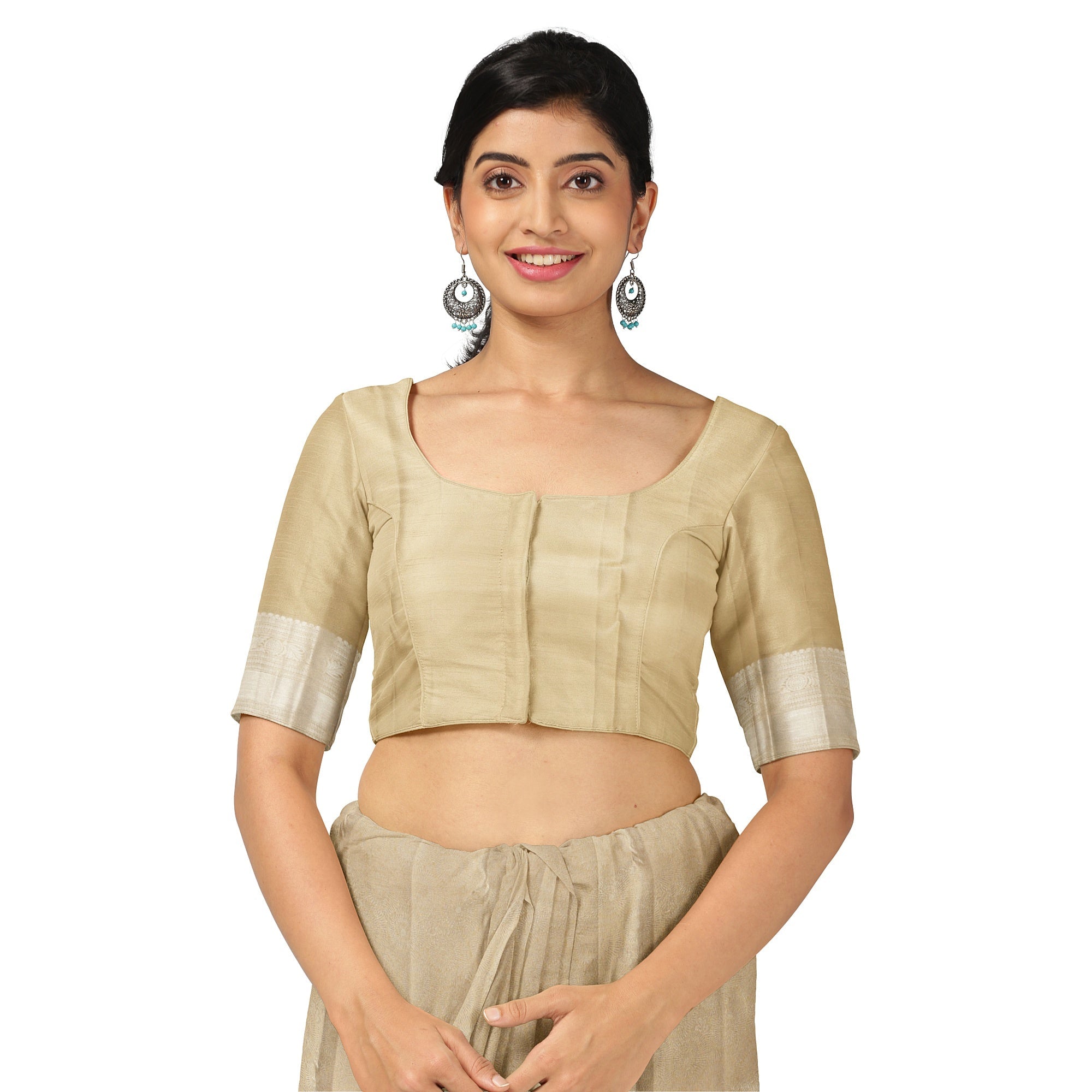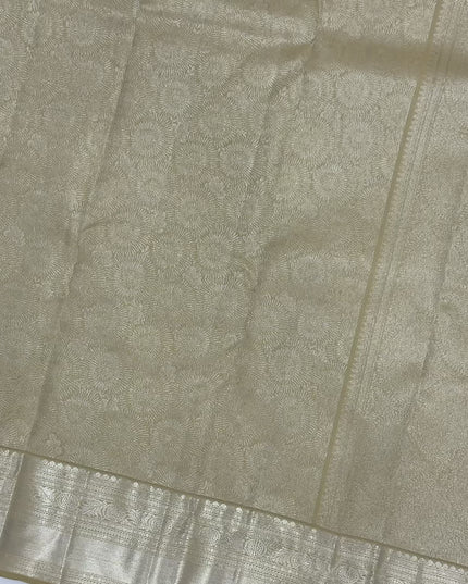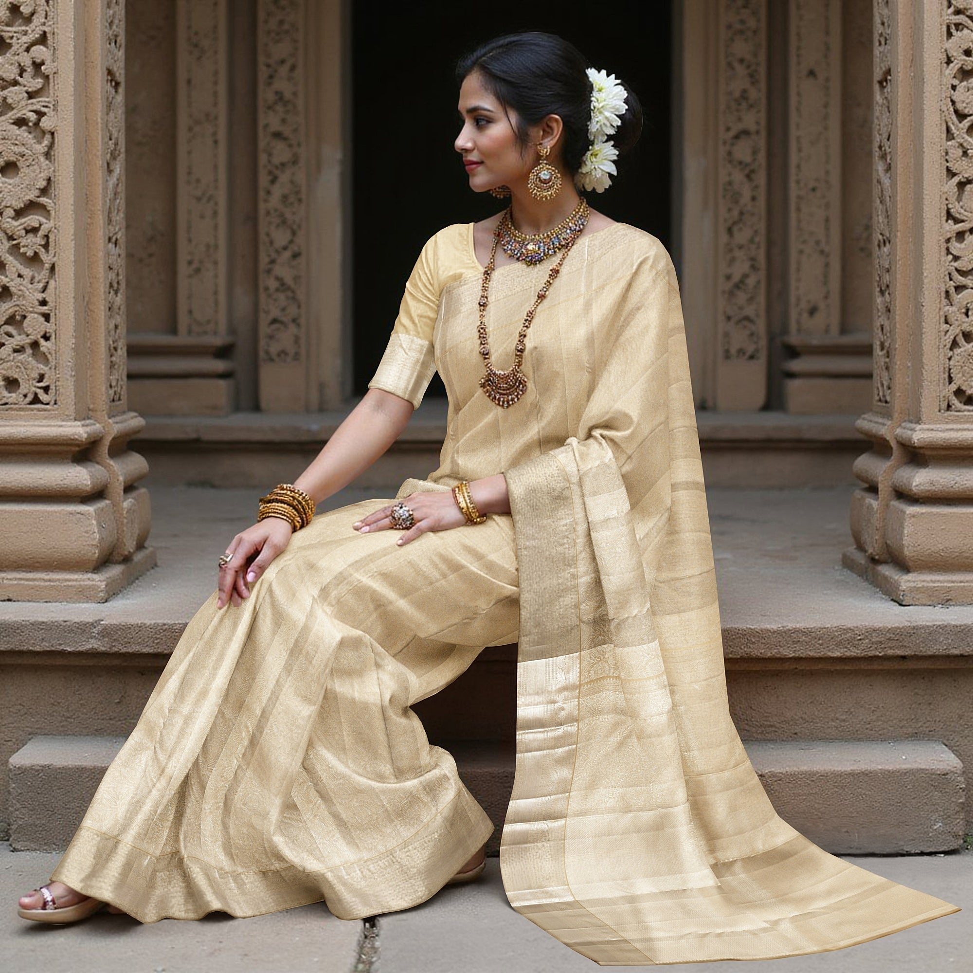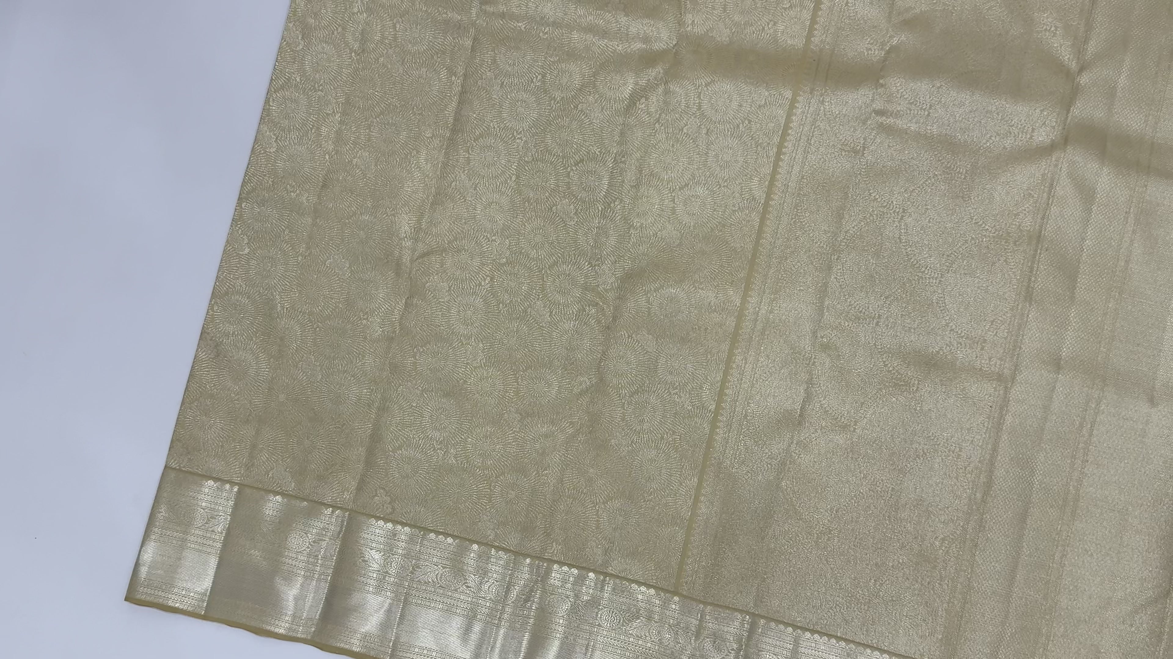 ساري كانجيفارام من الحرير الخالص بلون الشمبانيا الذهبي، بزخارف منسوجة يدويًا رقيقة وحواف لامعة، بطول 5.5 متر مع قطعة بلوزة، من أصل هندي - D22702