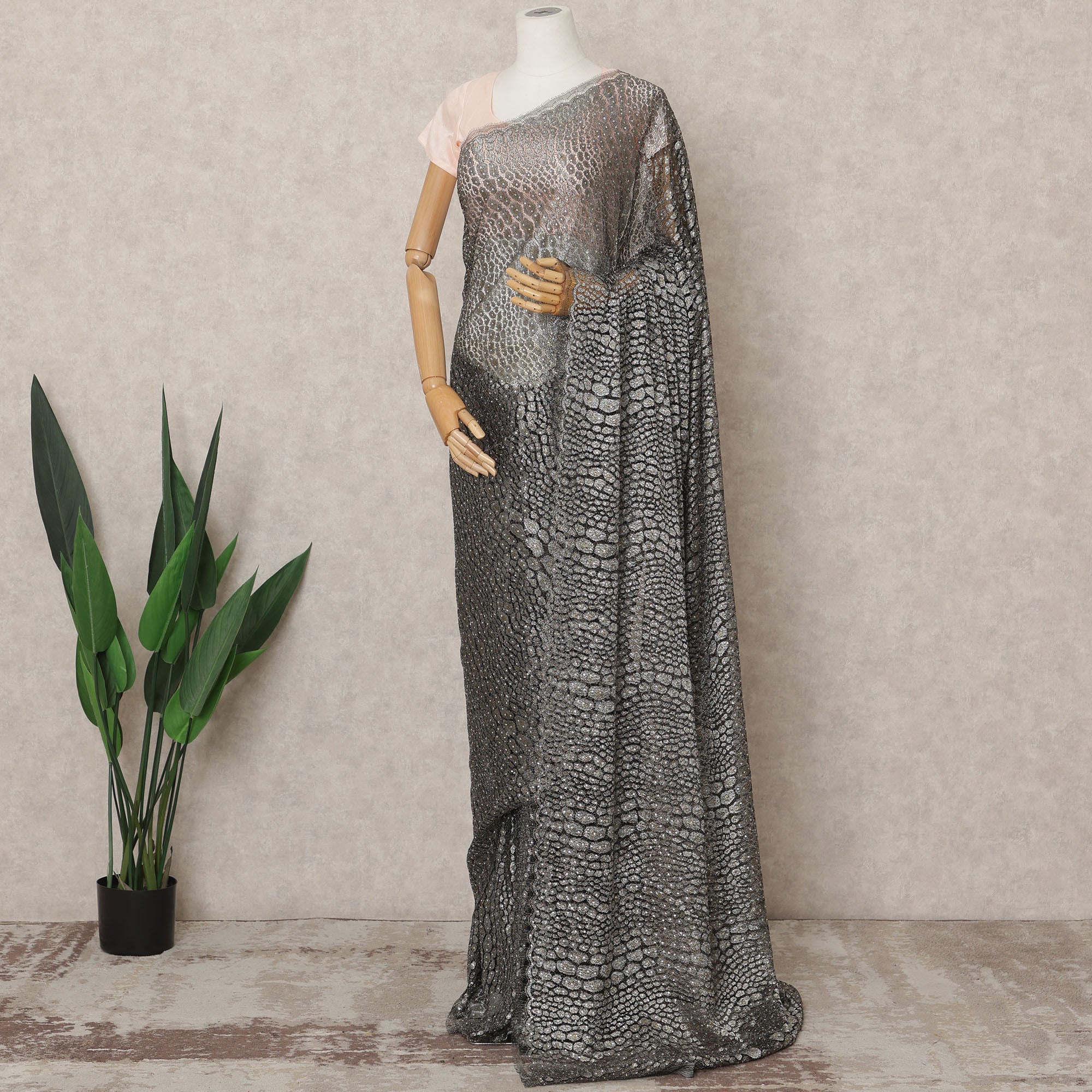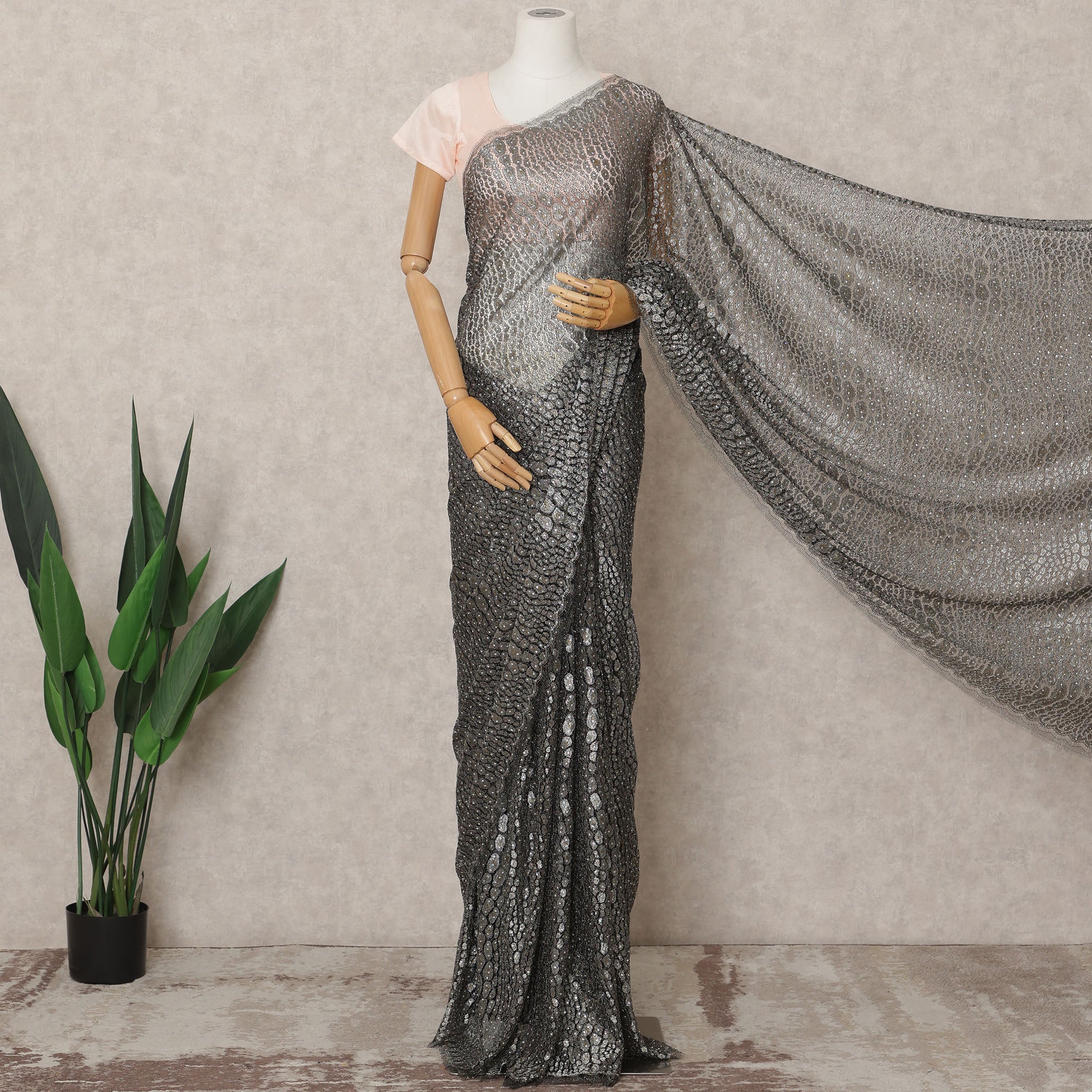 ساري شانتيلي معدني فاخر باللون الأسود الفحمي مع تطريز حجري، طوله 5.5 متر، عرضه 110 سم، صنع في فرنسا - D23864