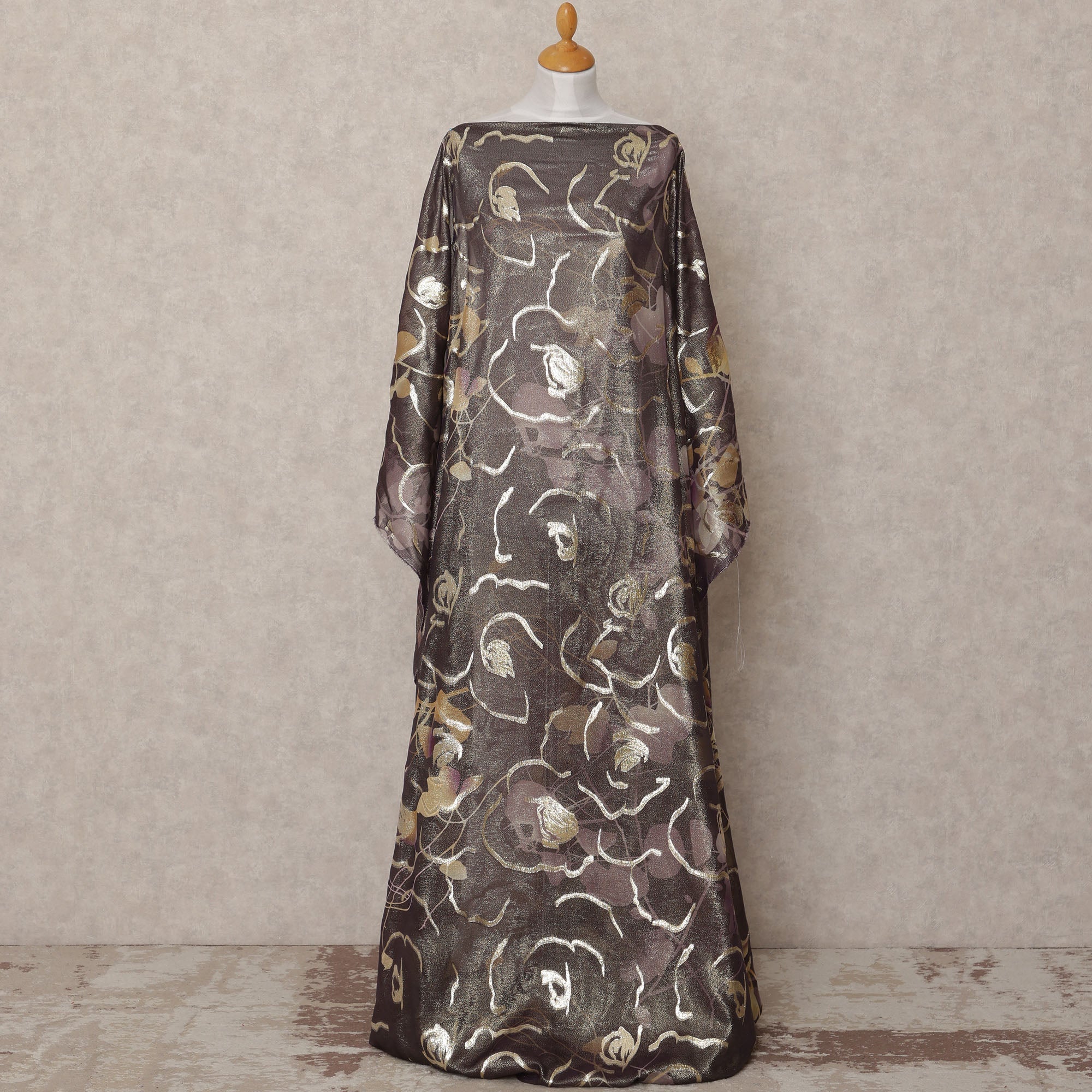 Charcoal Brown Traditional Somali Silk Chiffon Dirac Fabric with Metallic Lurex Floral Design, 3.5 Mtrs Piece, Width 140 Cms, Made in South Korea-D26521