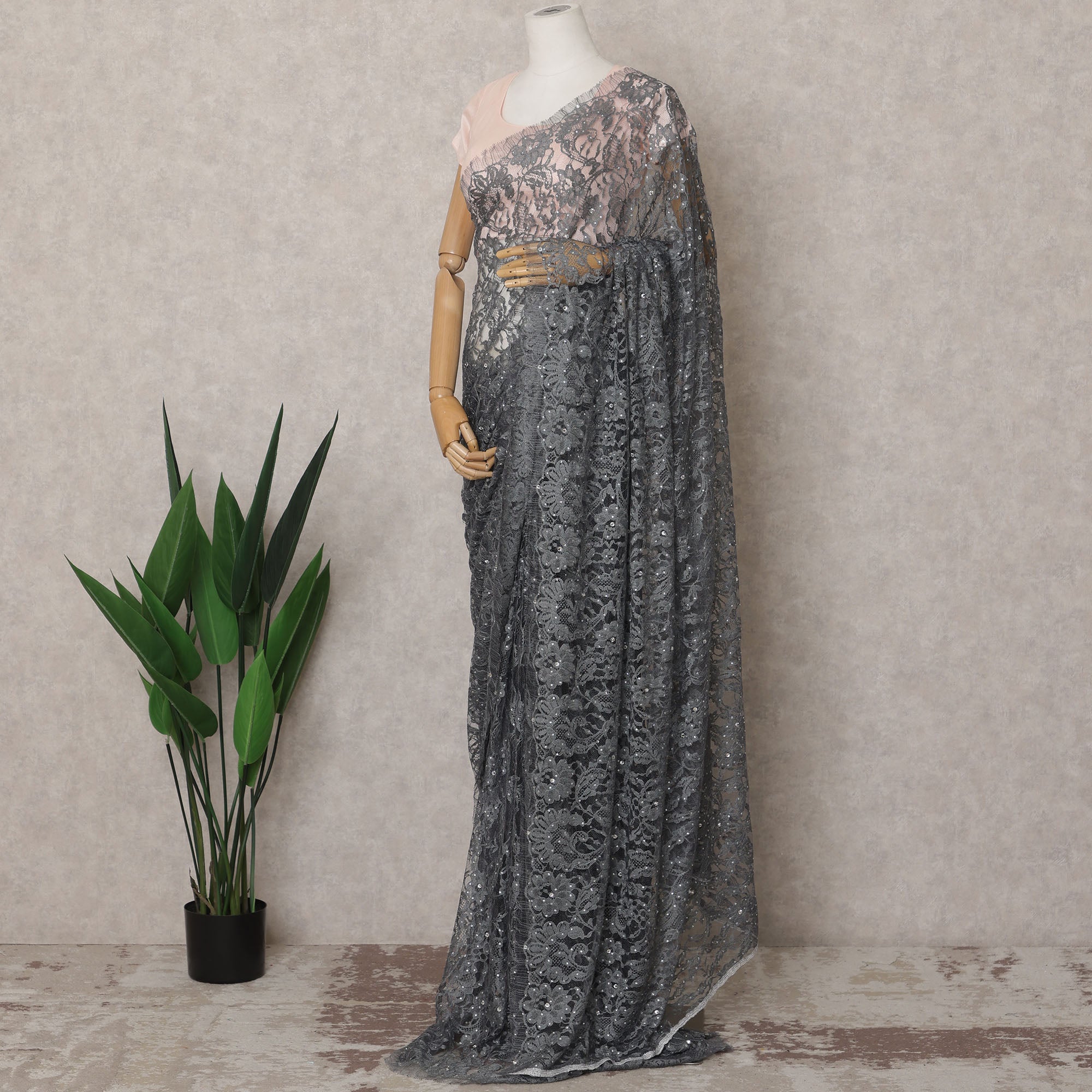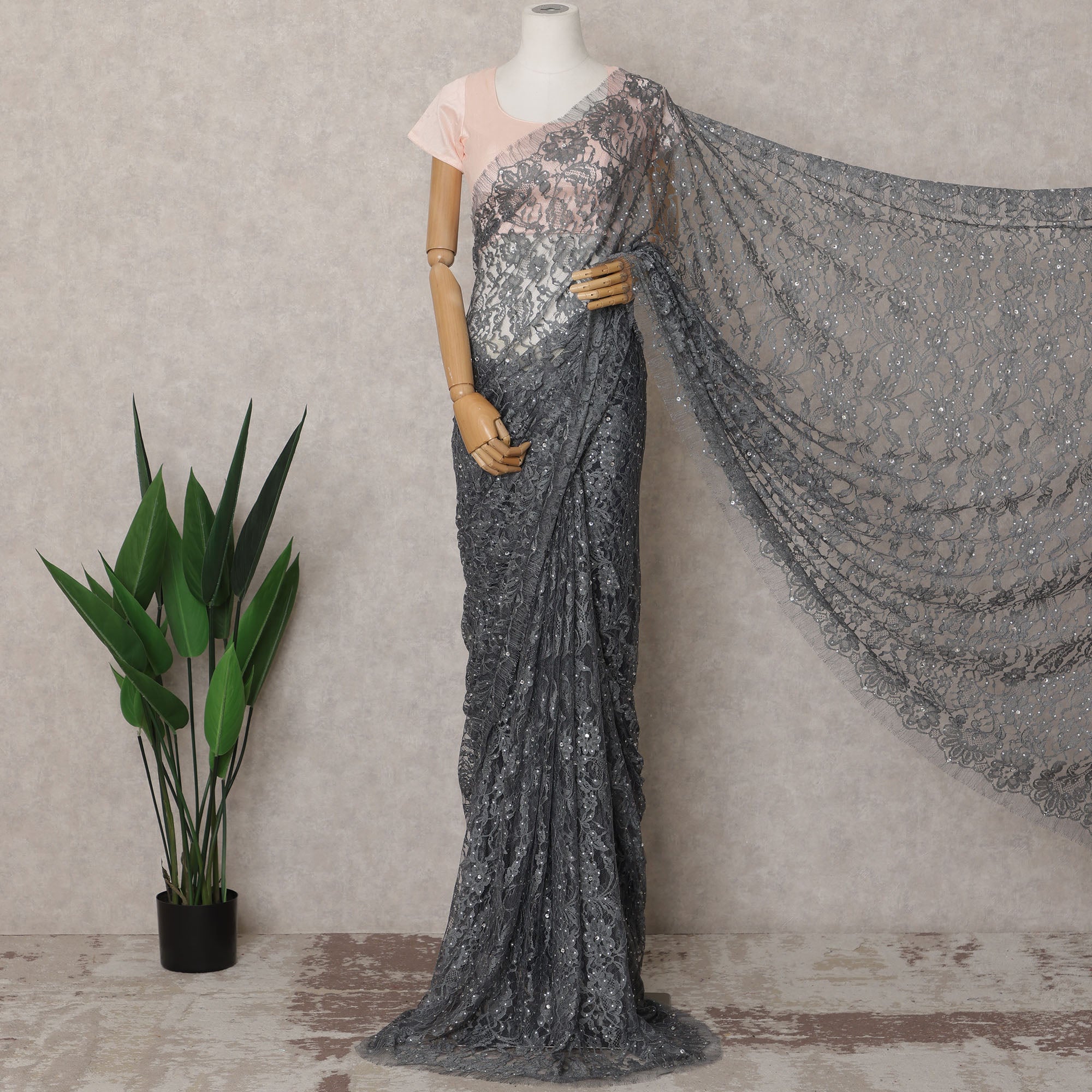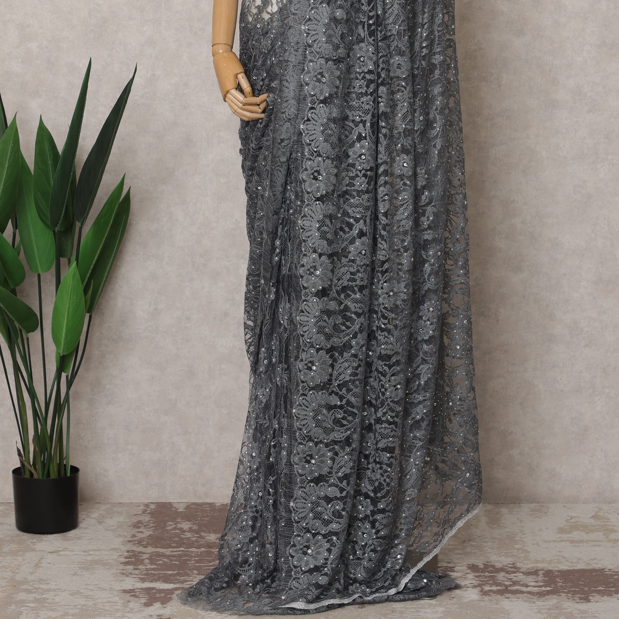 تسوق عبر الإنترنت للحصول على قماش ساري شانتيلي رمادي فحمي فاخر