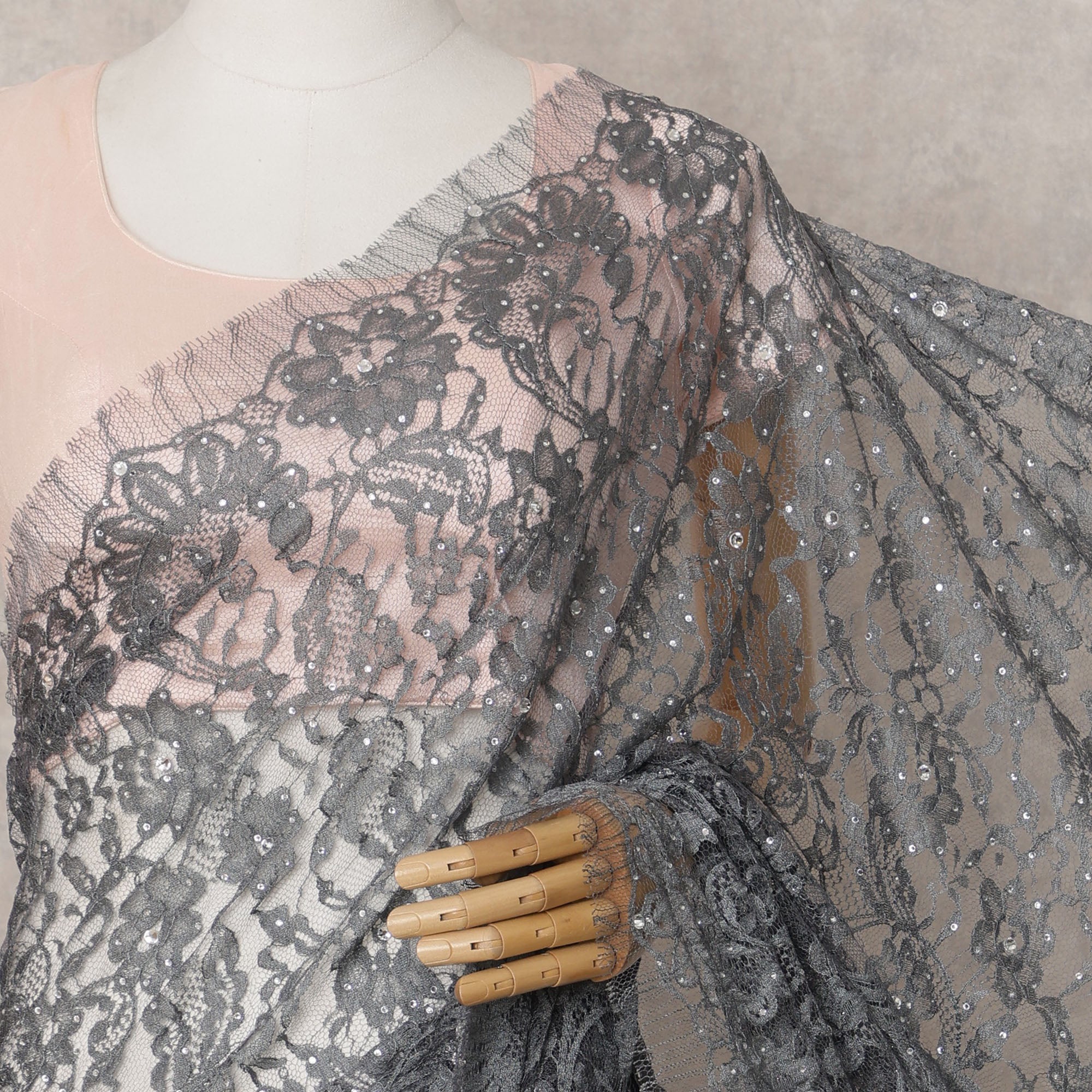 استمتعي بأناقة خالدة مع هذا القماش الفرنسي الفاخر بلون رمادي فحمي من الدانتيل الشانتيلي ثنائي اللون، والذي يُجسّد براعة الصناعة... اقرأ أكثر اقرأ أكثر