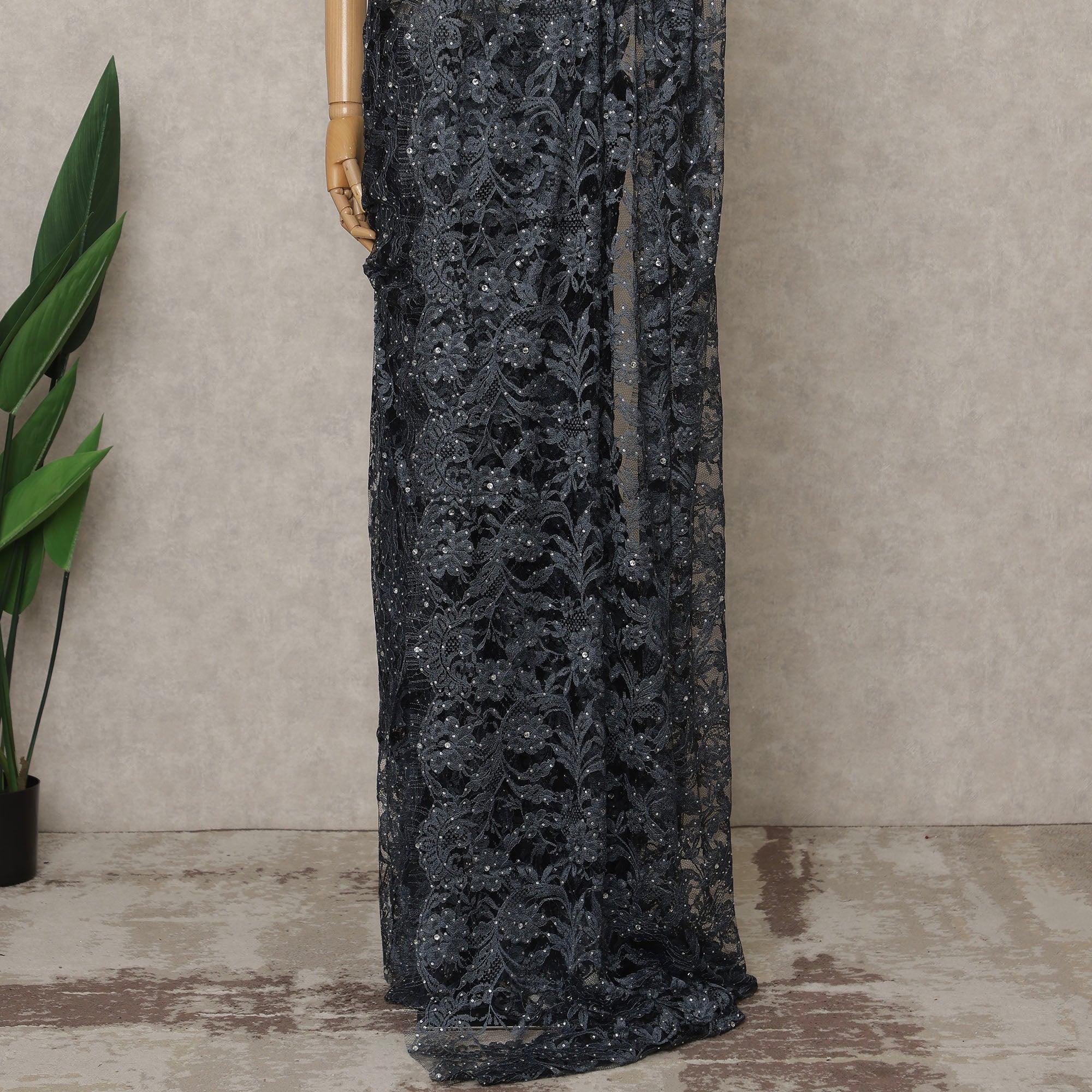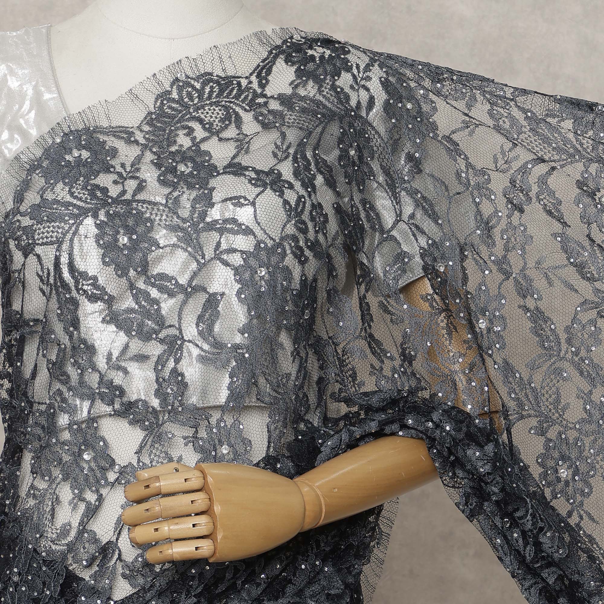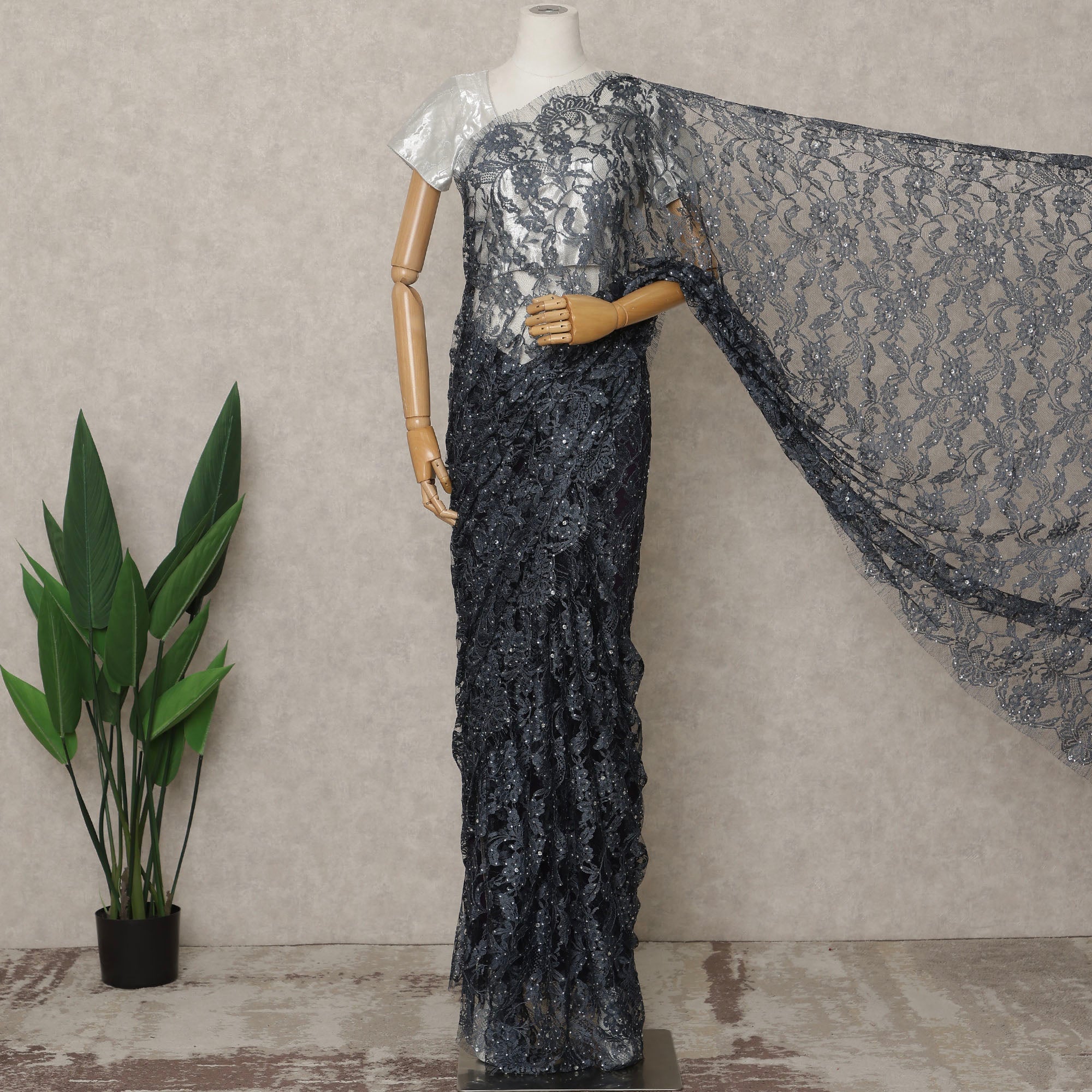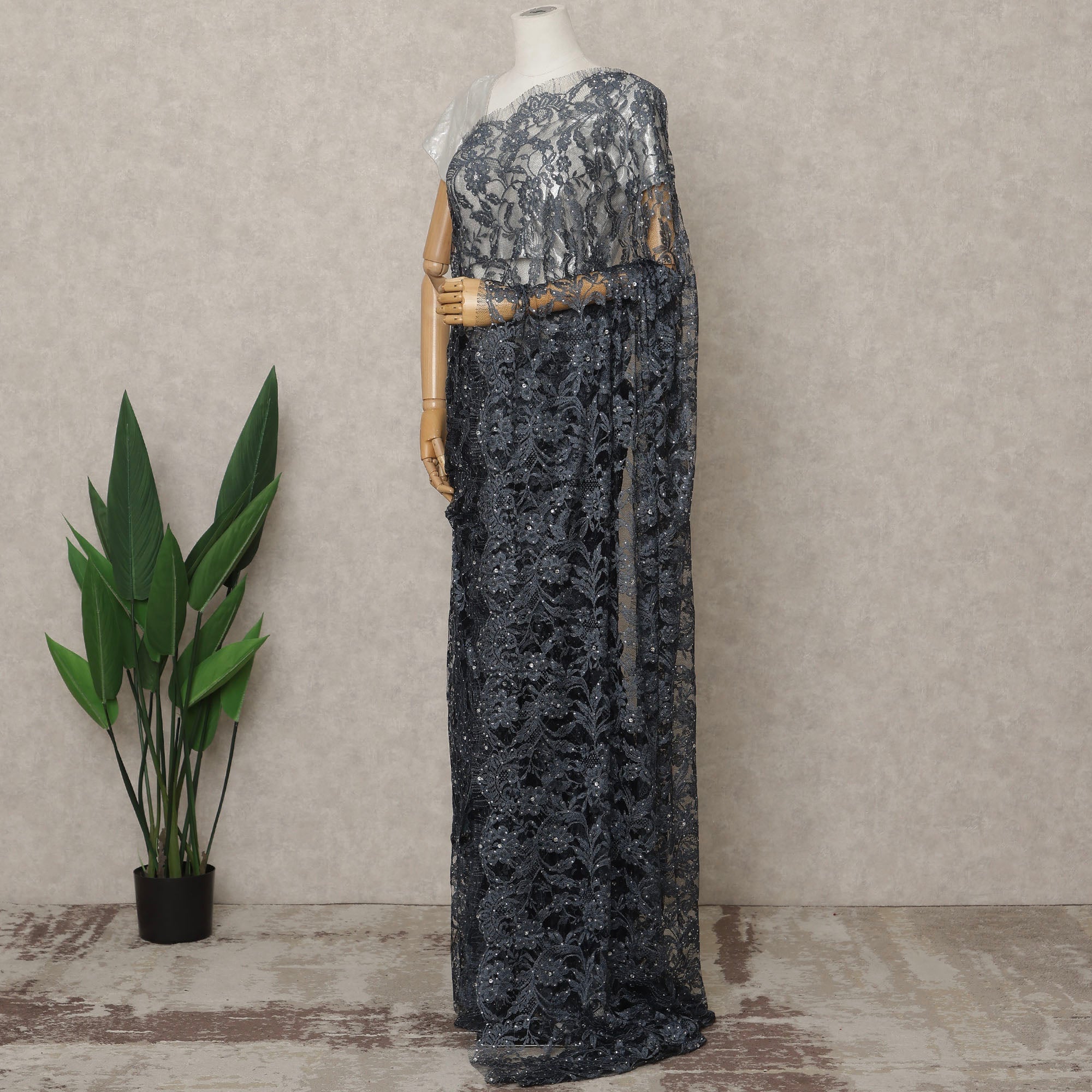 ساري فرنسي فاخر بلون رمادي فحمي من الدانتيل الشانتيلي ثنائي اللون مع تطريز حجري، عرض 110 سم، 5.5 متر، فرنسا - D25588