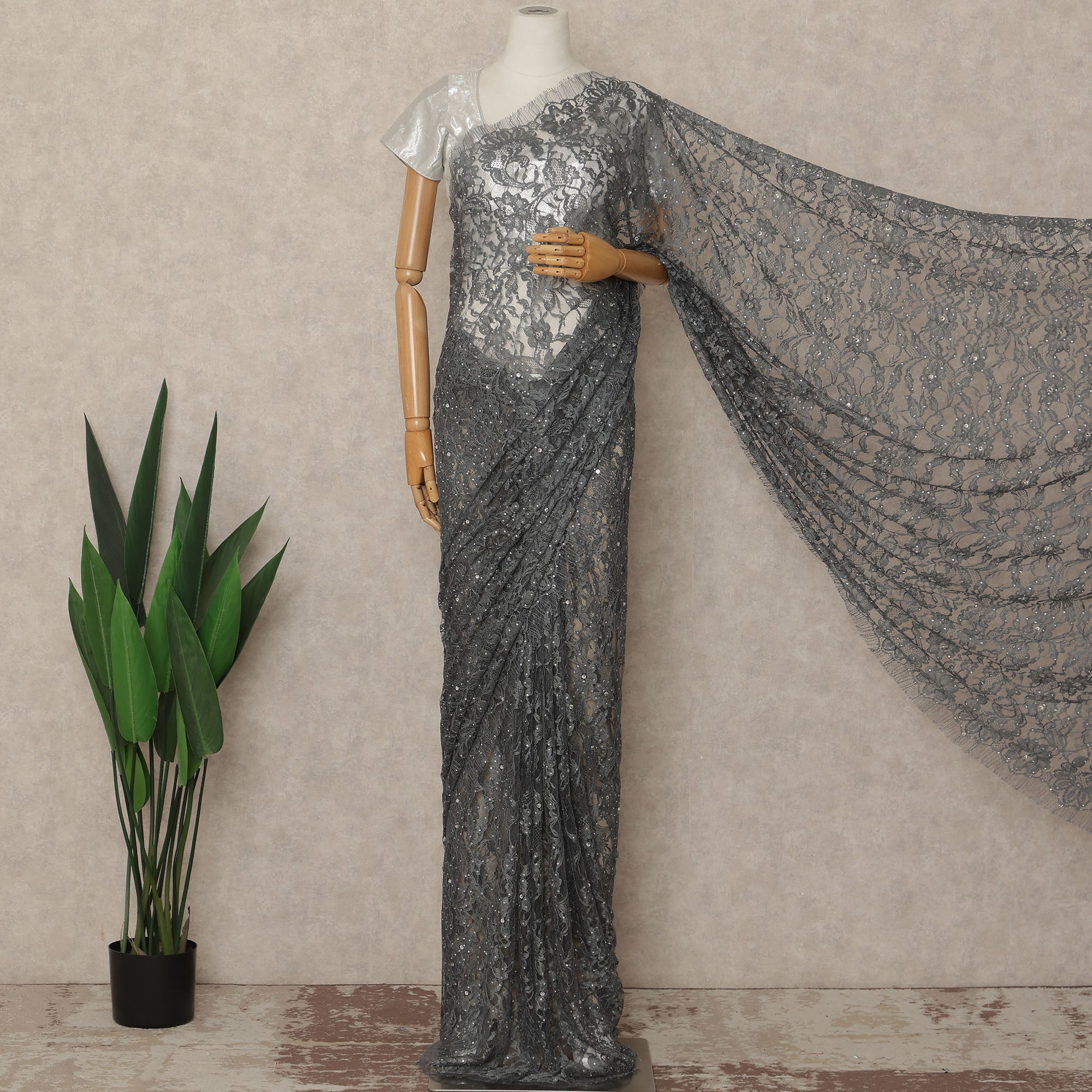 This charcoal grey premium French Chantilly saree lace with stone work showcases refined elegance through its delicate floral net design and subtle hand-placed stone embellishments. Crafted in France, the lace offers a soft, lightweight texture with a graceful drape, making it ideal for designer sarees and couture ensembles. Supplied as a single continuous piece of approximately 5.5 meters with a generous 110 cms width, it allows effortless pleating and smooth flow for formal occasions, weddings, and evening wear. The timeless grey tone enhances versatility while maintaining a luxurious appeal. Blouse not included.