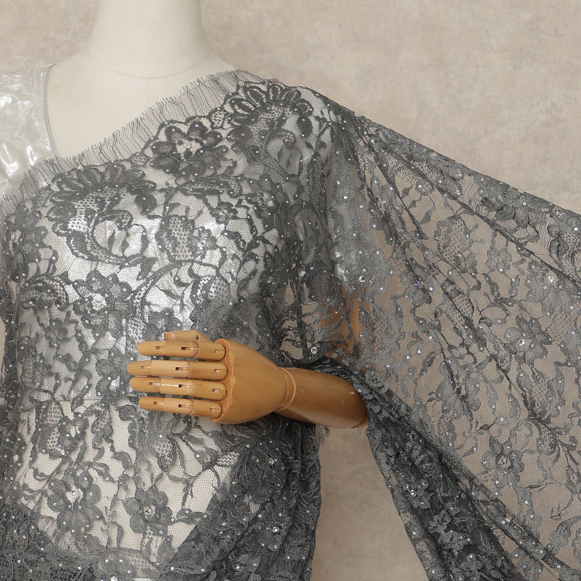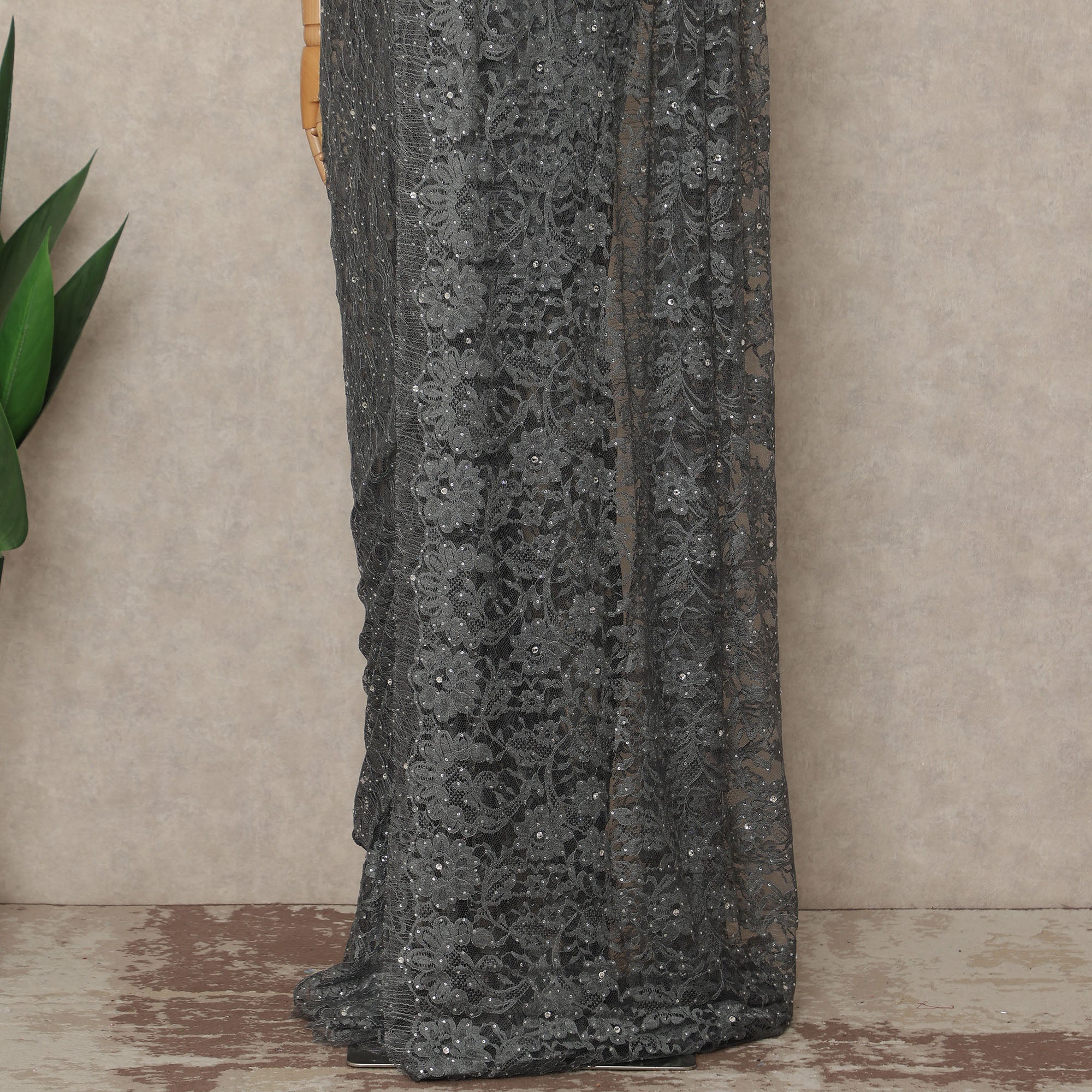 This charcoal grey premium French Chantilly saree lace with stone work showcases refined elegance through its delicate floral net design... اقرأ أكثر اقرأ أكثر