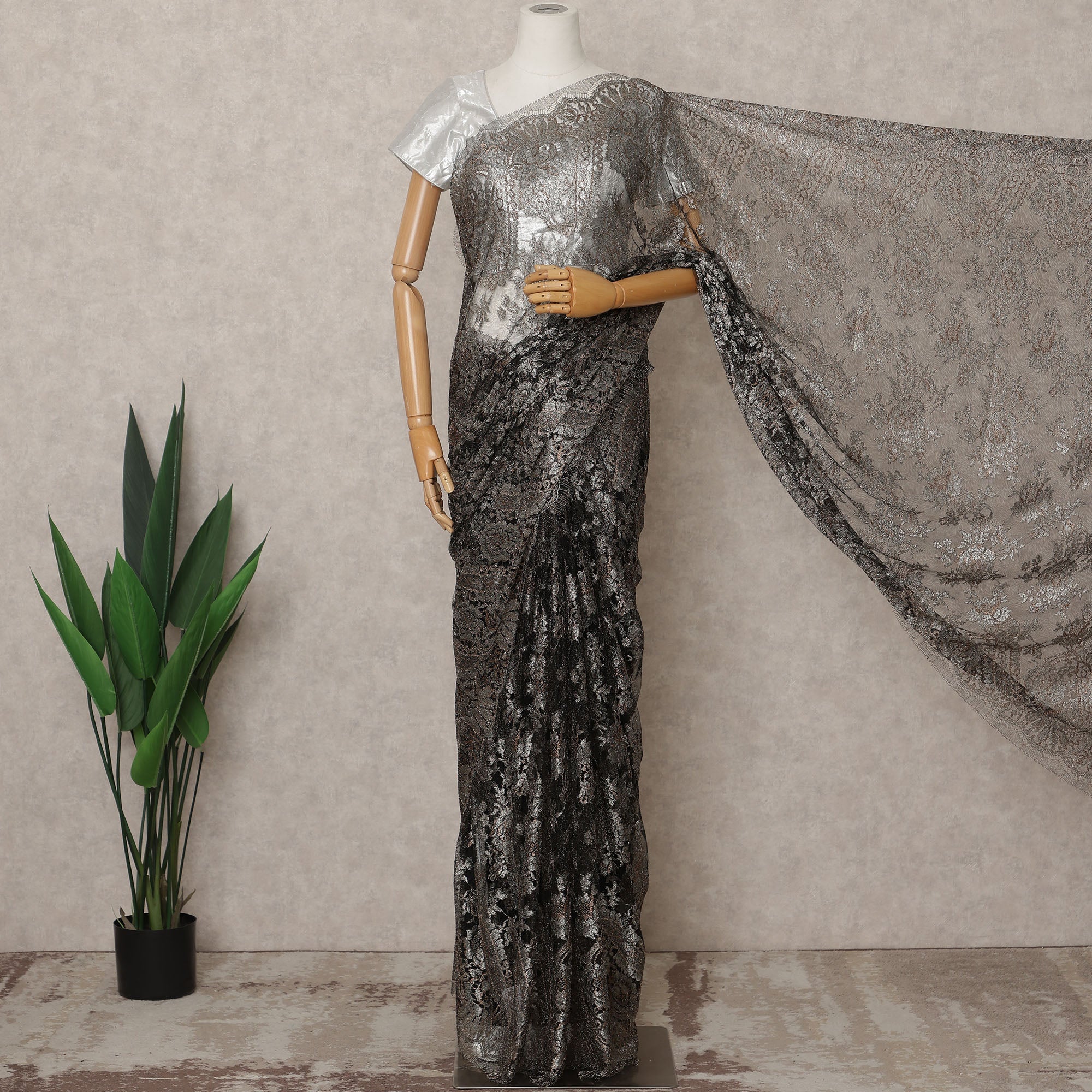 The Charcoal Premium French Metallic Chantilly Lace Saree Fabric is a breathtaking fusion of modern sophistication and traditional French artistry. Imported directly from France, this exquisite lace fabric showcases intricate floral and ornamental motifs woven in deep charcoal tones, delicately enhanced with a metallic shimmer that adds depth and radiance to its appearance. Expertly crafted using authentic Chantilly weaving techniques, the fabric exudes refinement, grace, and luxury in every detail. With a length of 5.5 meters and a width of 110 cms, it provides ample fabric for creating a full saree drape that flows effortlessly, perfect for evening wear, bridal couture, or festive attire. The lace’s lightweight and sheer texture ensures comfort while its fine craftsmanship brings a timeless allure to your wardrobe. Its soft, elegant drape makes it ideal for designers and connoisseurs of fine European fabrics. Blouse piece not included. To retain its rich texture and metallic sheen, dry clean only and store in a cool, dry place. Shop online now to embrace the grandeur of authentic French metallic Chantilly lace.