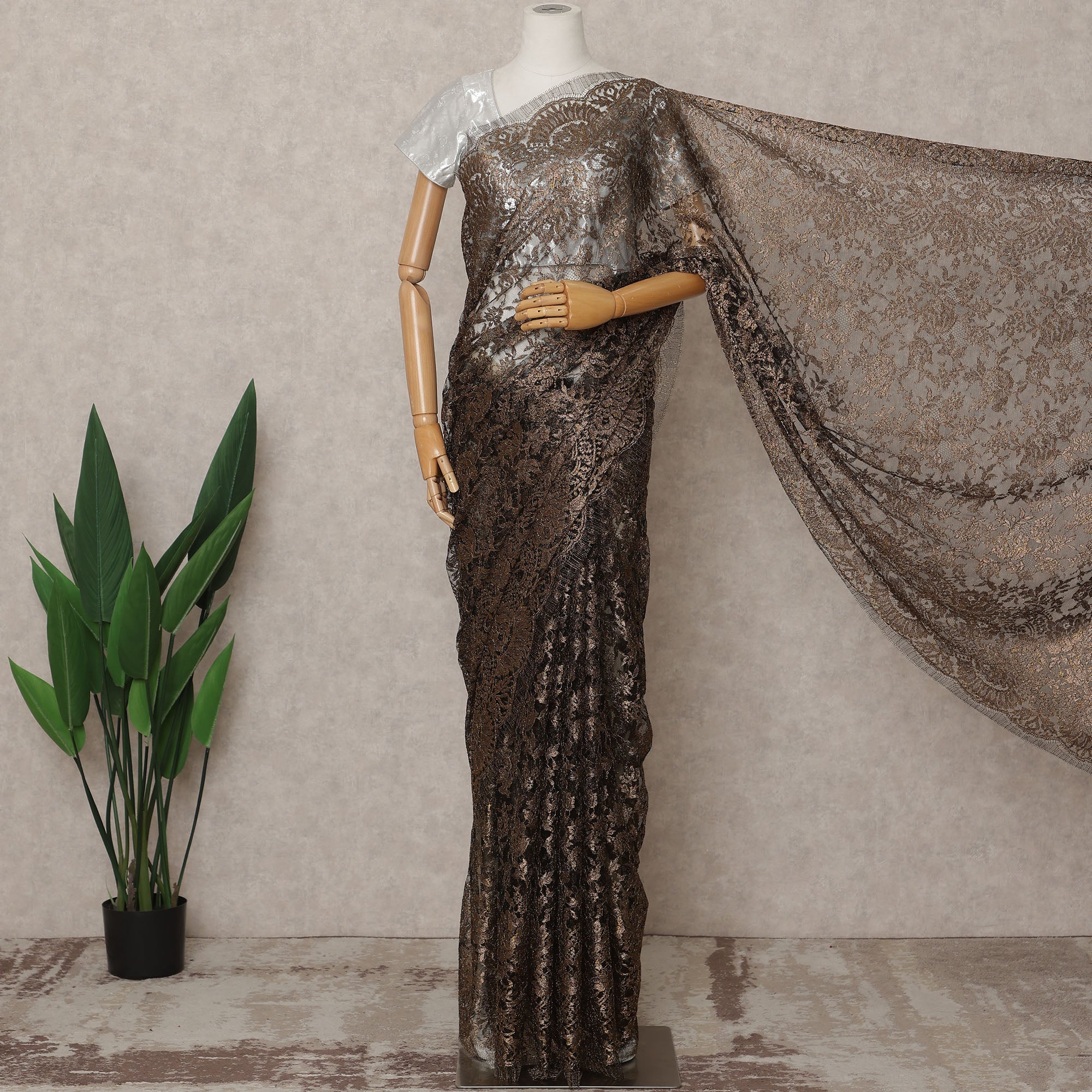 قماش ساري شانتيلي معدني فاخر بلون الشوكولاتة الأسود مصنوع في فرنسا