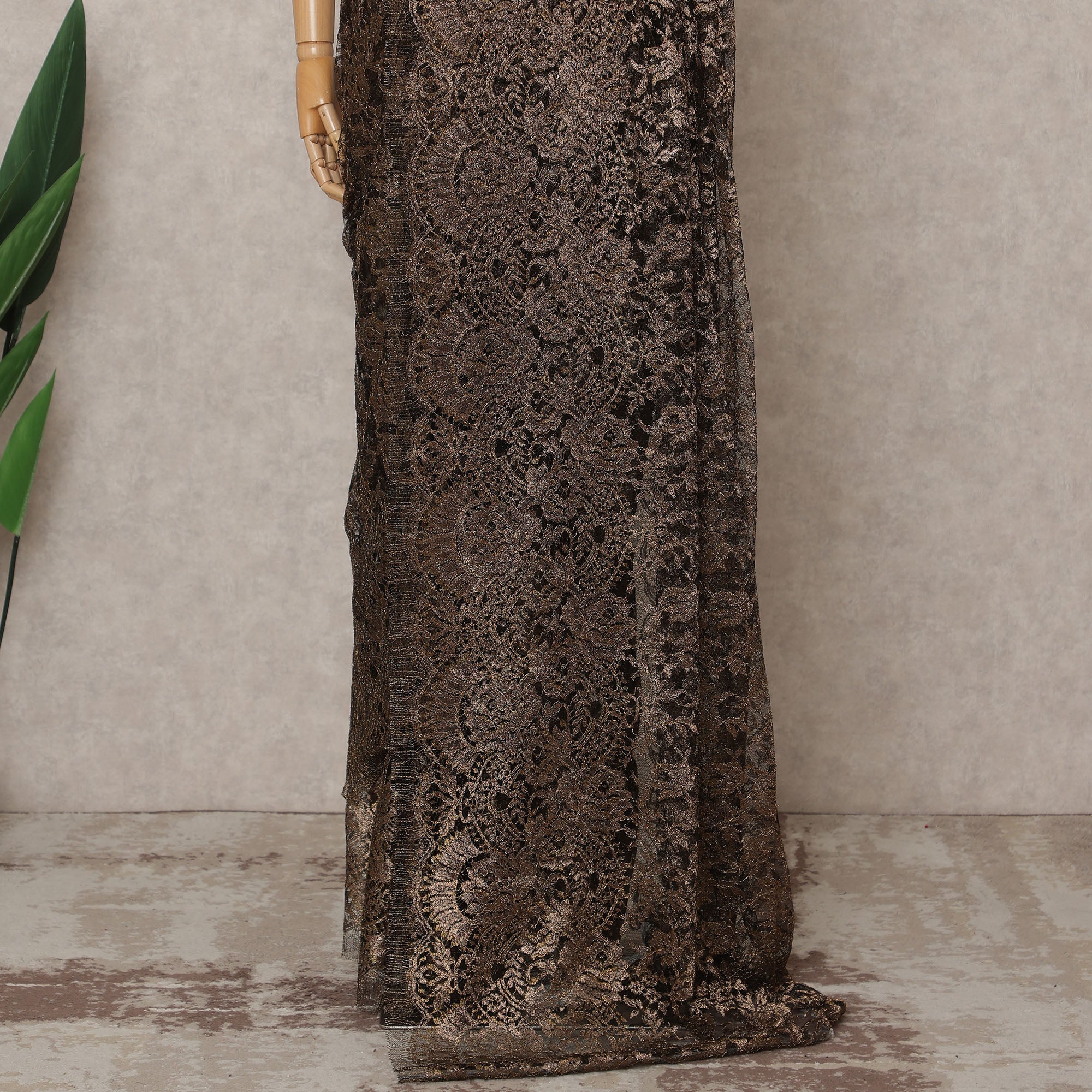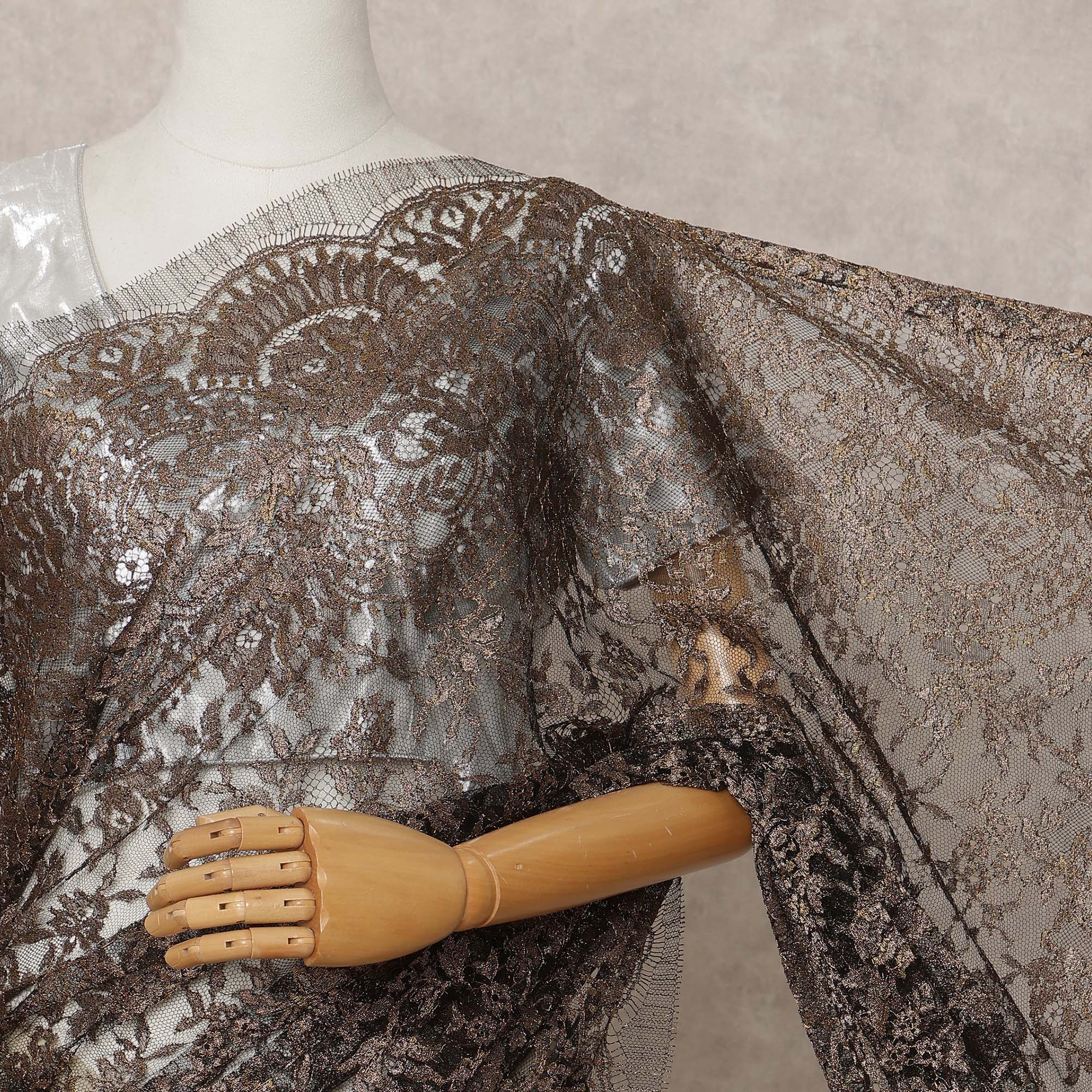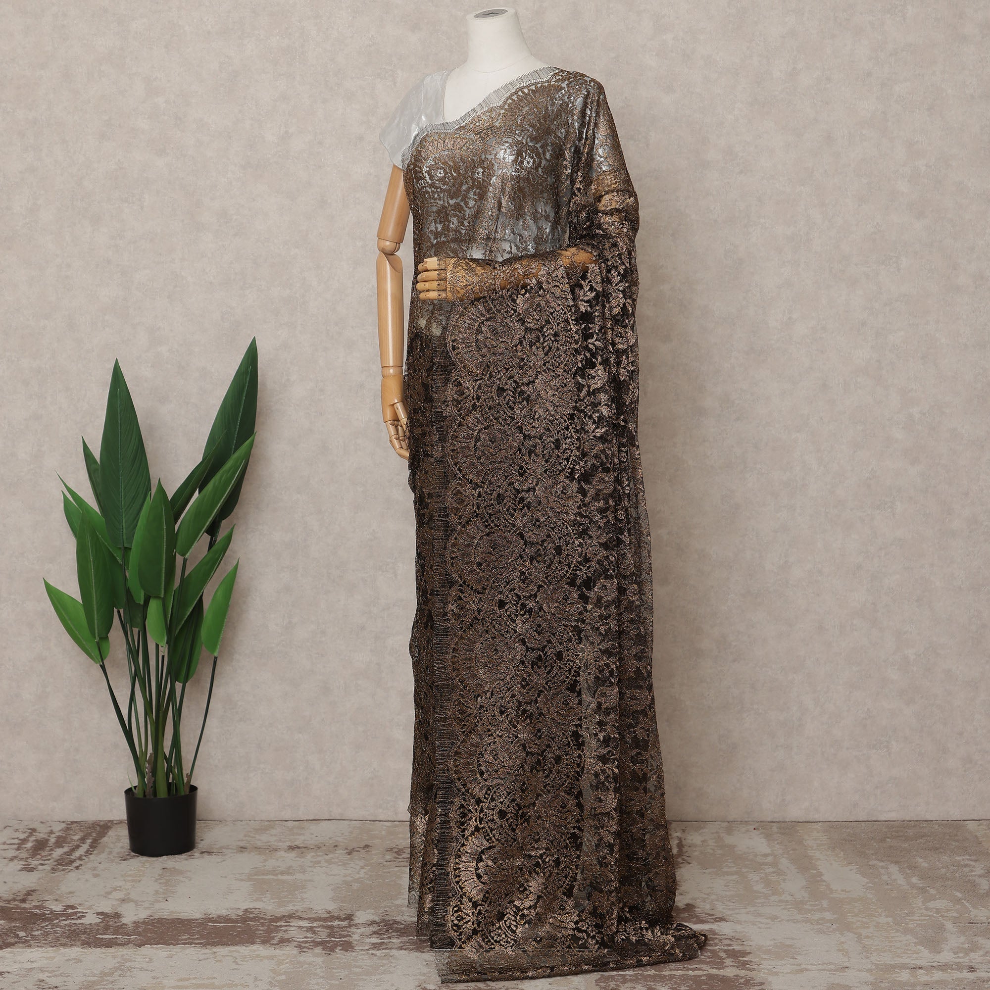 قماش ساري فرنسي فاخر من الدانتيل شانتيلي المعدني باللون الأسود الشوكولاتي - طول 5.5 متر، عرض 110 سم، صنع في فرنسا - D25607