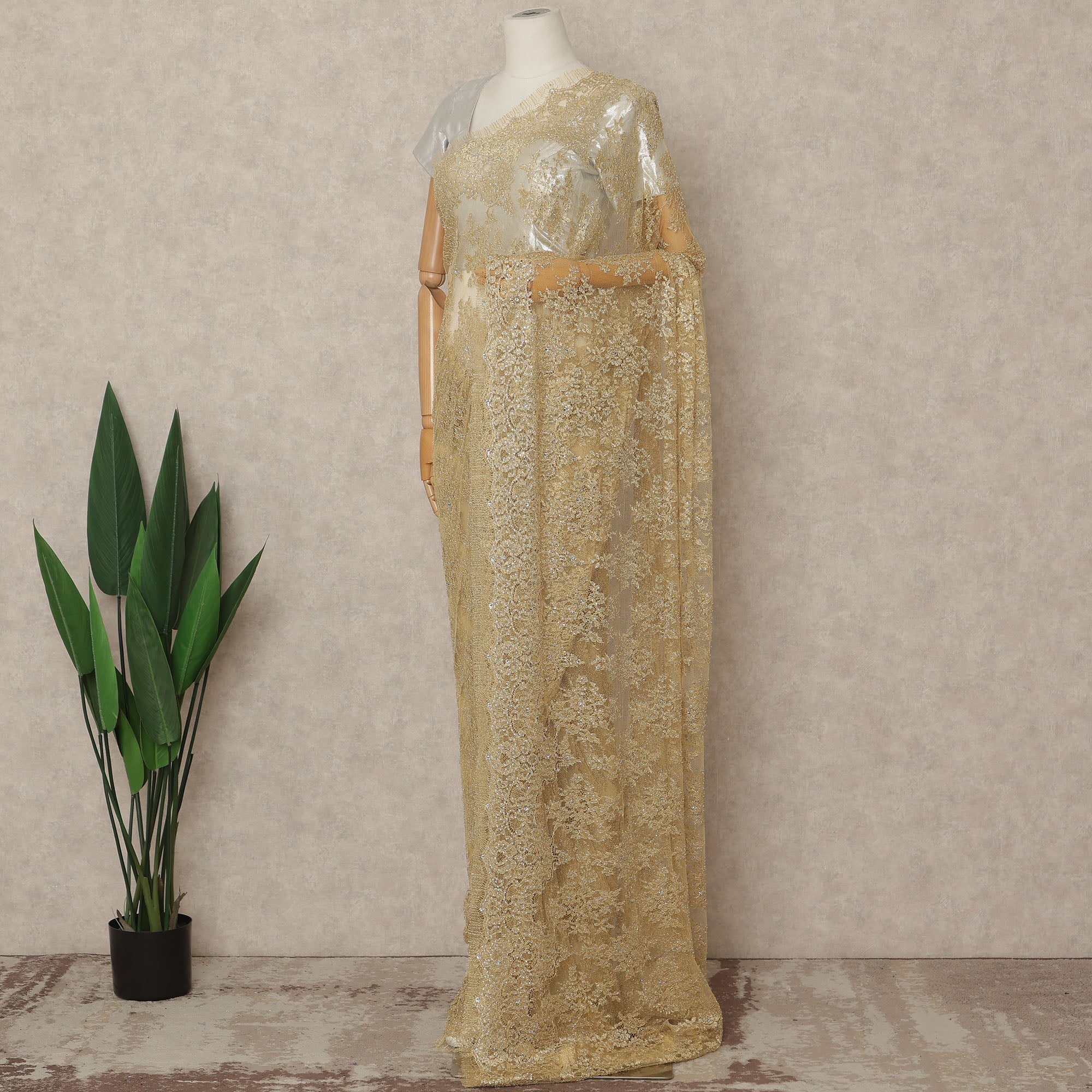 This classic gold premium French metallic Chantilly saree lace with stonework is a statement of timeless luxury and refined elegance. Crafted on a delicate sheer net base, the intricate floral Chantilly patterns are richly woven with metallic threads and meticulously embellished with sparkling stonework that enhances its radiant appeal. The luminous gold tone offers a graceful shimmer, making it an exquisite choice for bridal sarees, wedding receptions, festive celebrations, and couture evening wear. Designed and crafted in France, this lace reflects superior artistry and premium craftsmanship. With an approximate length of 5.5 meters and a generous width of 110 cms, it allows a fluid, elegant drape that enhances the silhouette beautifully. Blouse not included.