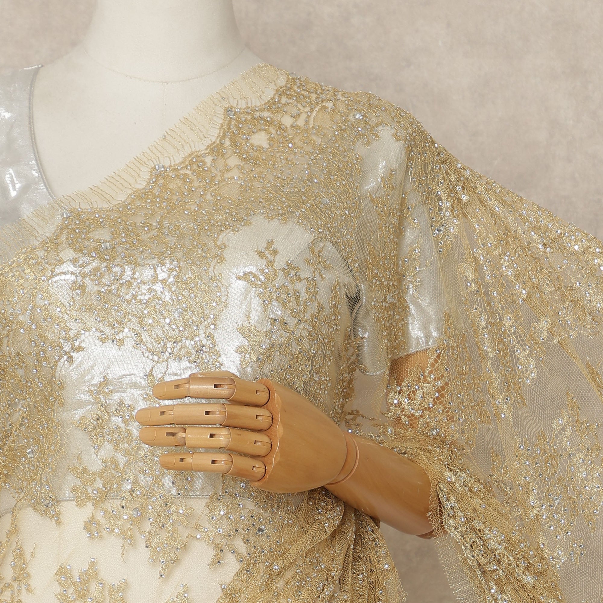 Premium French Chantilly lace enhanced with detailed stonework embellishments.