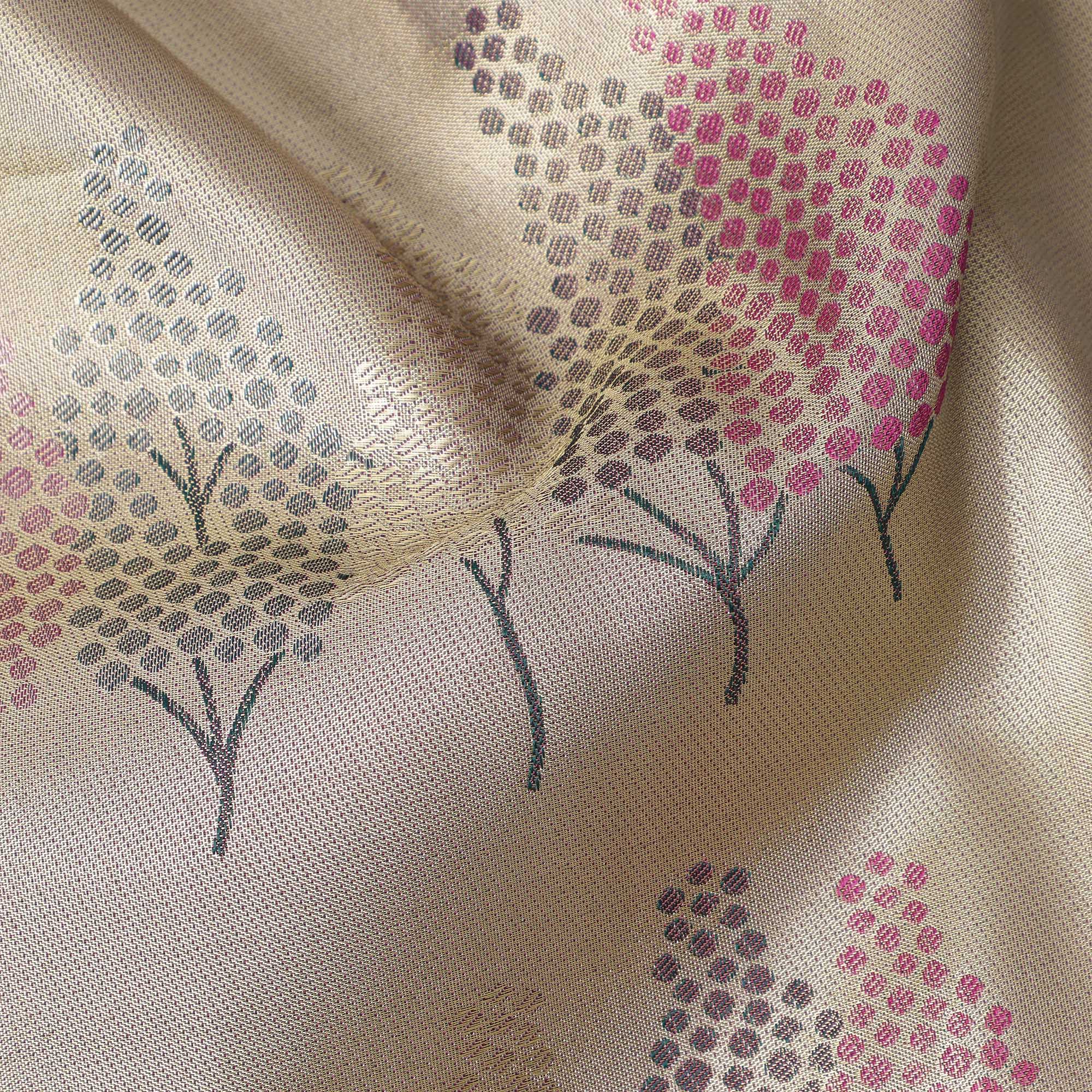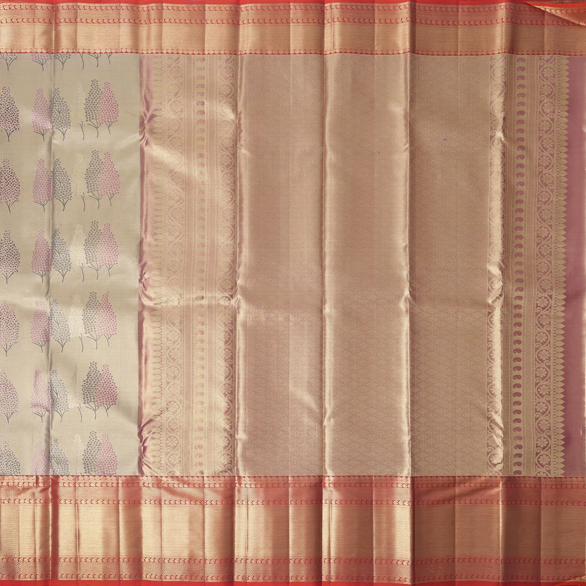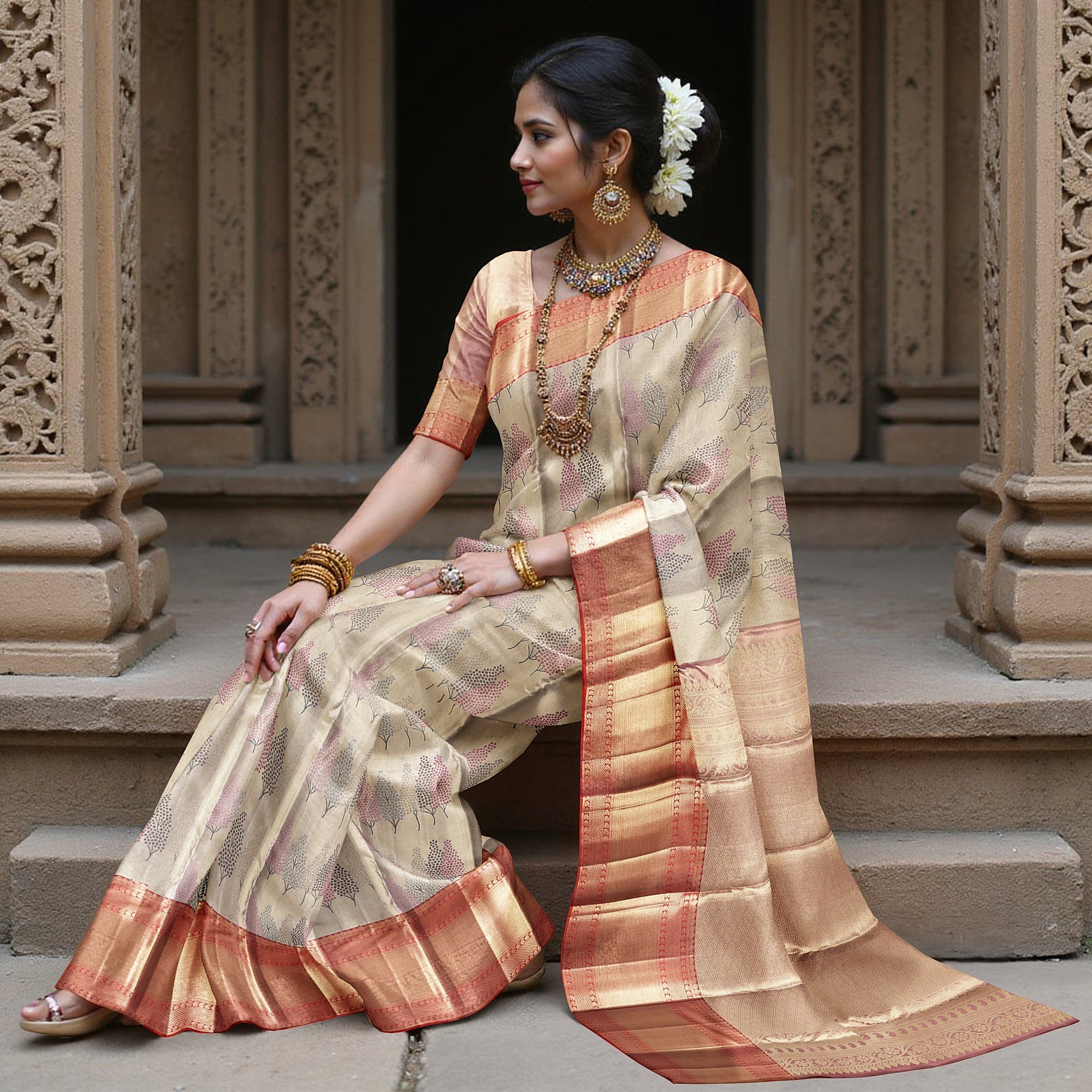 ساري كانجيفارام من الحرير الخالص بلون النحاس الذهبي، مزين بزخارف نباتية منسوجة يدويًا وحواف منقوشة متباينة، بطول 5.5 متر مع بلوزة، من أصل هندي - D22722