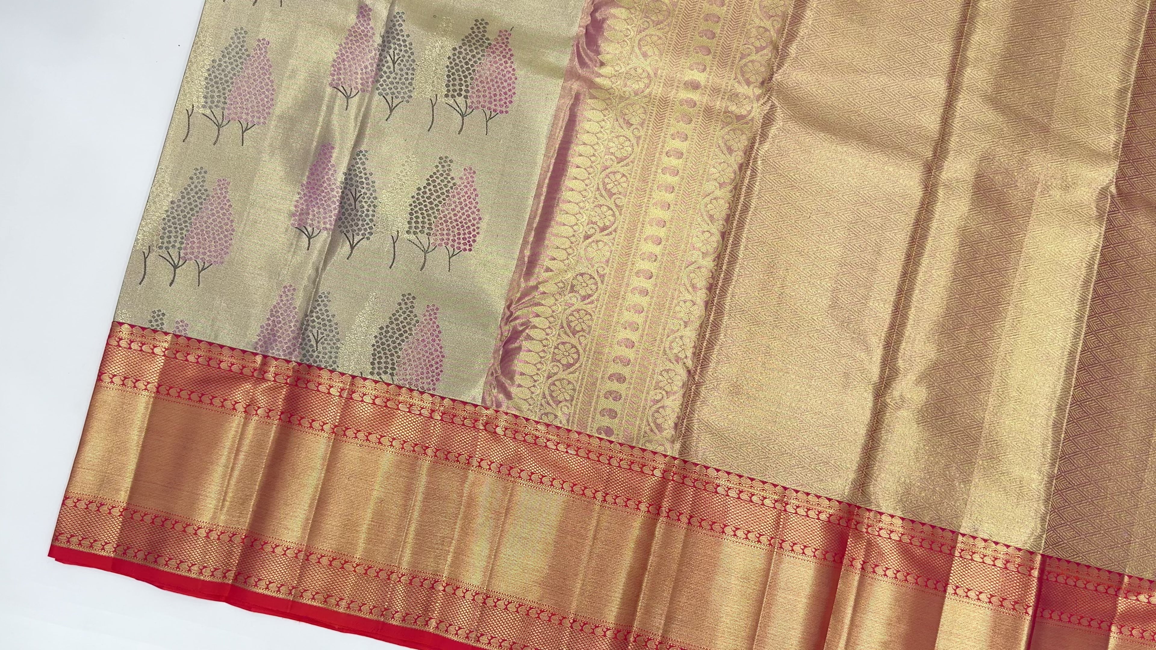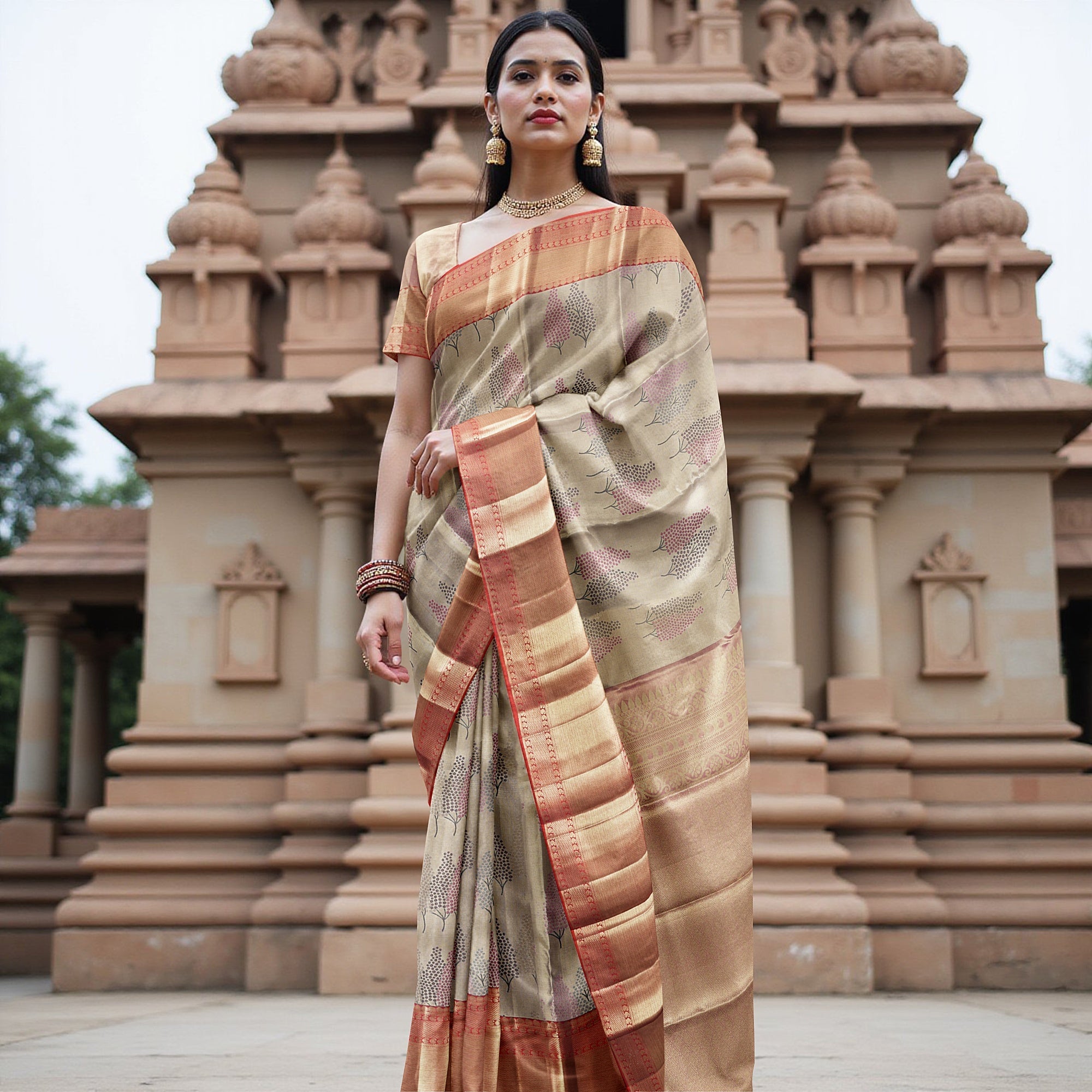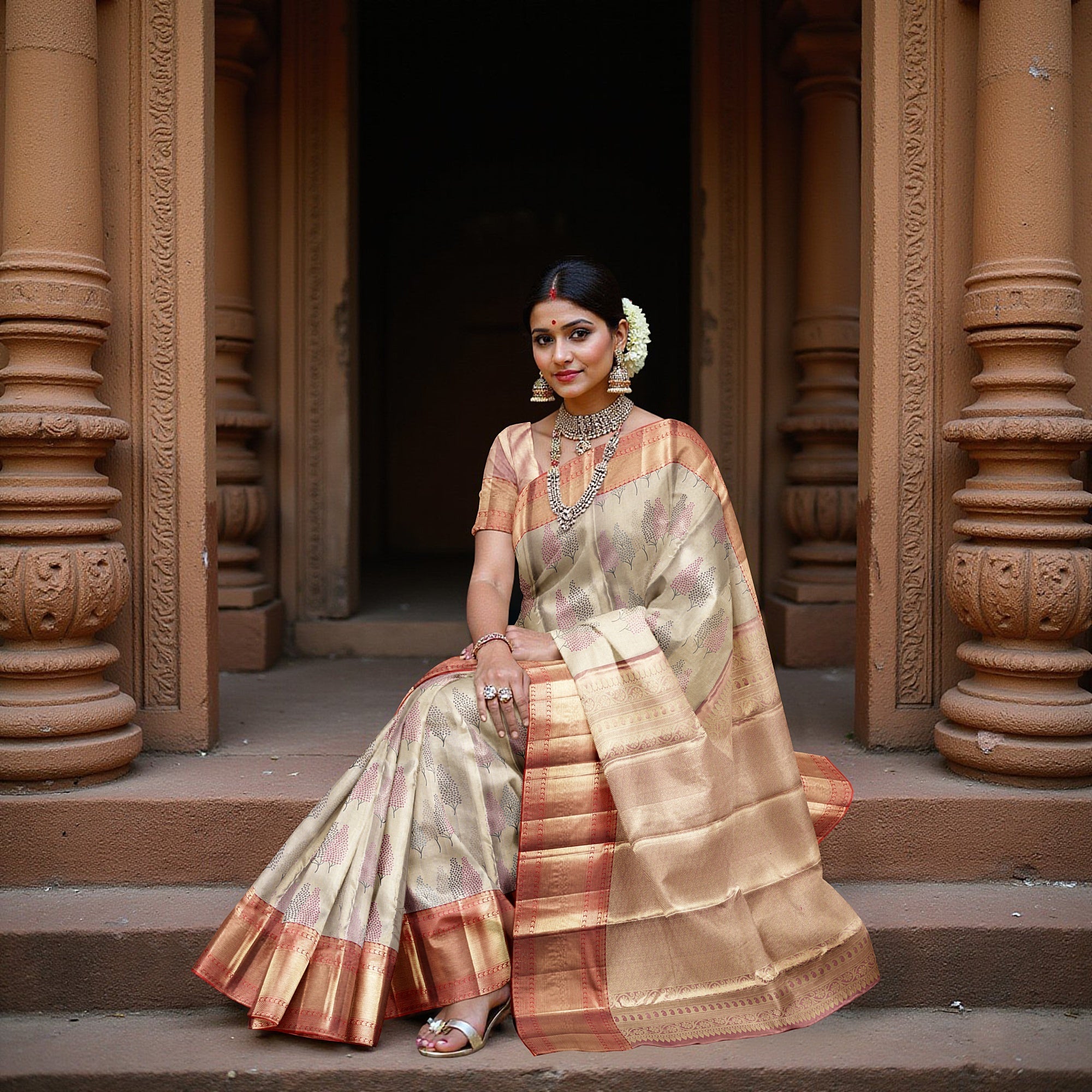 ساري كانجيفارام الحريري الخالص بلون النحاس الذهبي هو لوحة فنية معقدة، منسوجة يدويًا بإخلاص من قبل نساجي جنوب الهند على مدى 48 ساعة. يتميز جسم الحرير العاجي بزخارف نباتية مفصلة بدقة، تبدو وكأنها جداريات تقليدية تم إحياؤها بخيوط الحرير. كل بتلة وفرع يردد صدى تراث فن المعابد، بينما يضيف الحافة المربعة ذات اللون النحاسي تباينًا نابضًا بالحياة يرفع من ثرائه البصري. يتلألأ الزاري الذهبي على طول البالو برشاقة ملكية، مما يعزز من الرقي العام لهذا النسيج الفاخر. مصنوع من حرير ريجال فابريكس عالي الجودة، الساري مثالي للارتداء في الاحتفالات أو زيارات المعابد أو حفلات الزفاف. هذا ليس مجرد زي - إنه قصة بالحرير. تسوق عبر الإنترنت لتتألق بأناقة خالدة. يُنظف جافًا فقط للحفاظ على الملمس والتألق والحرفية.