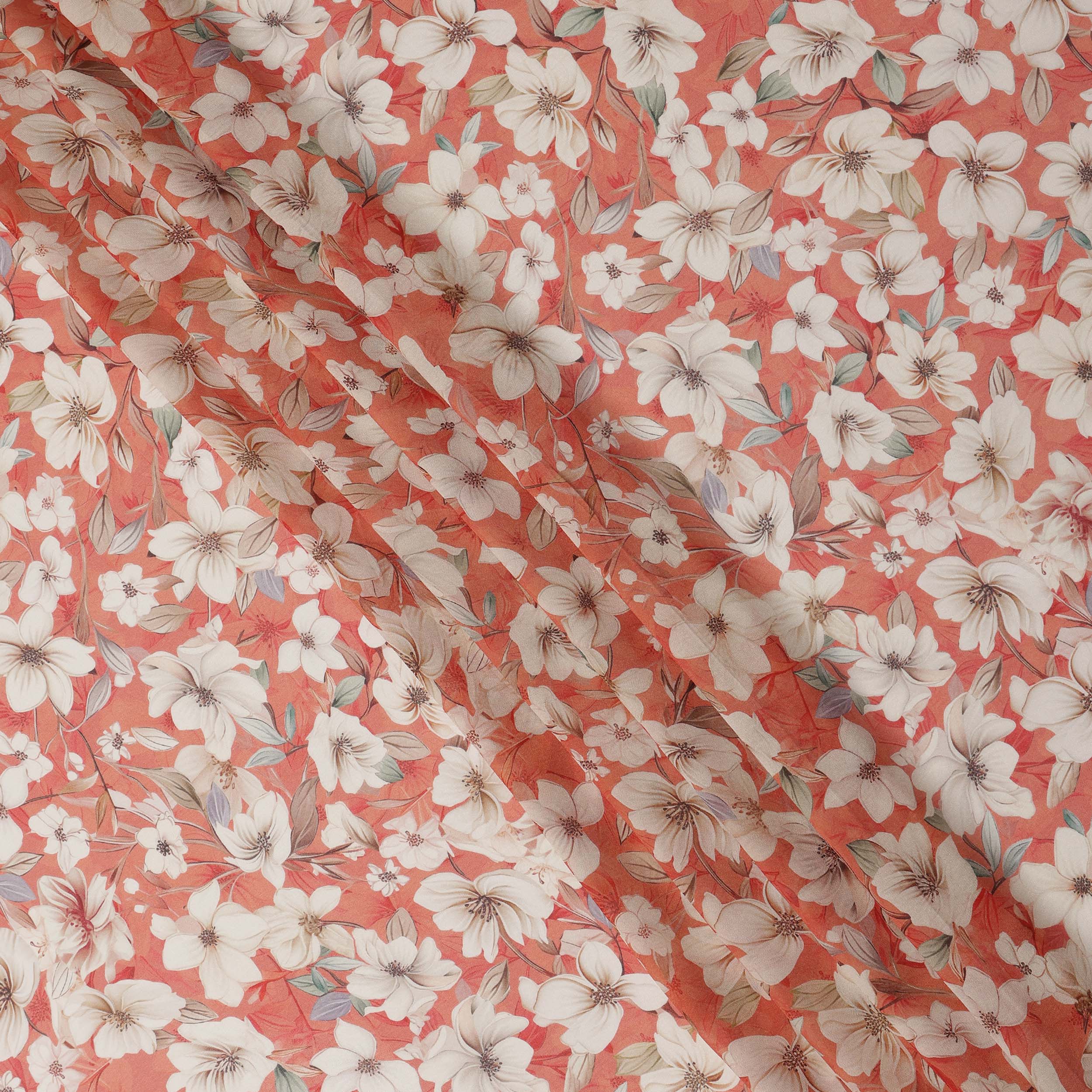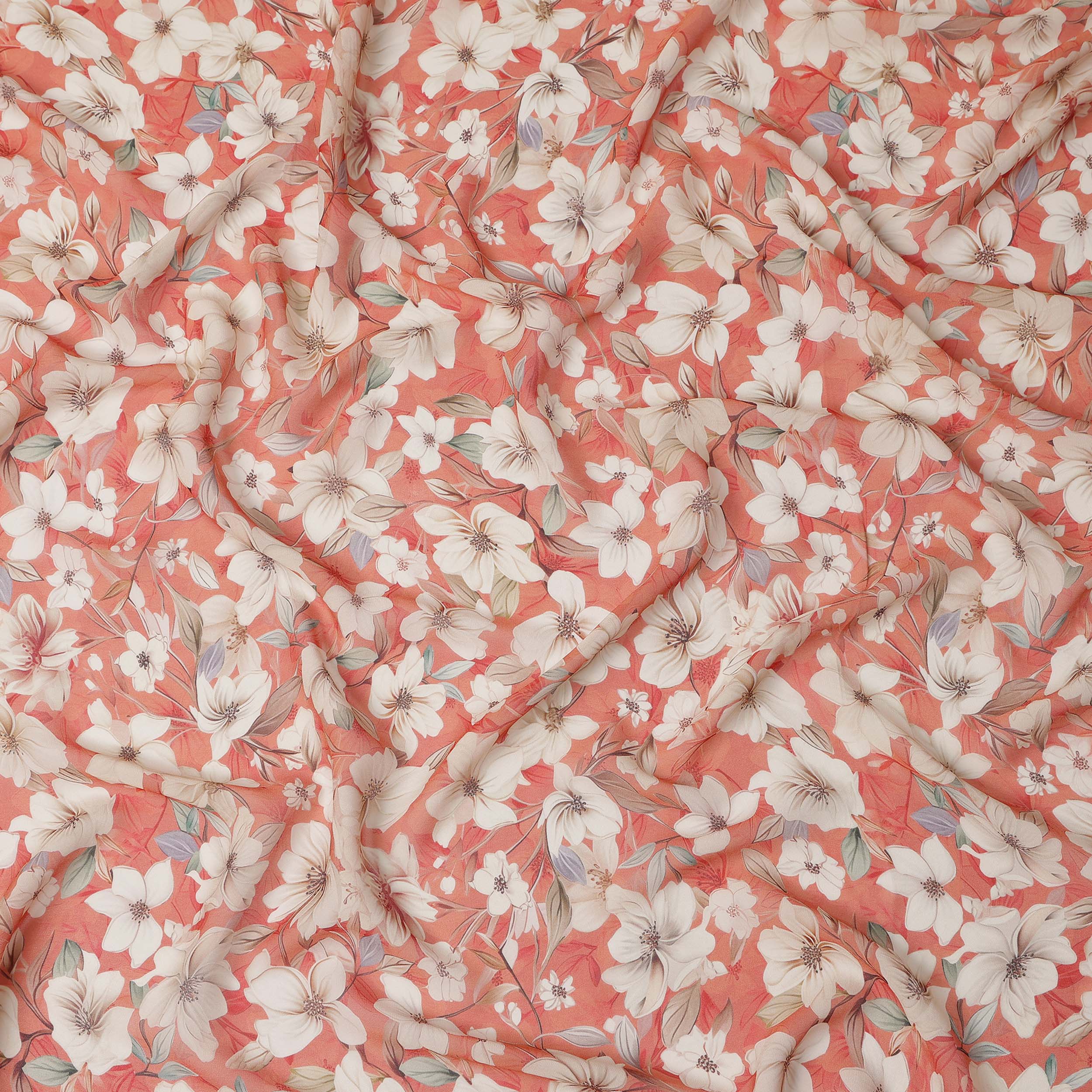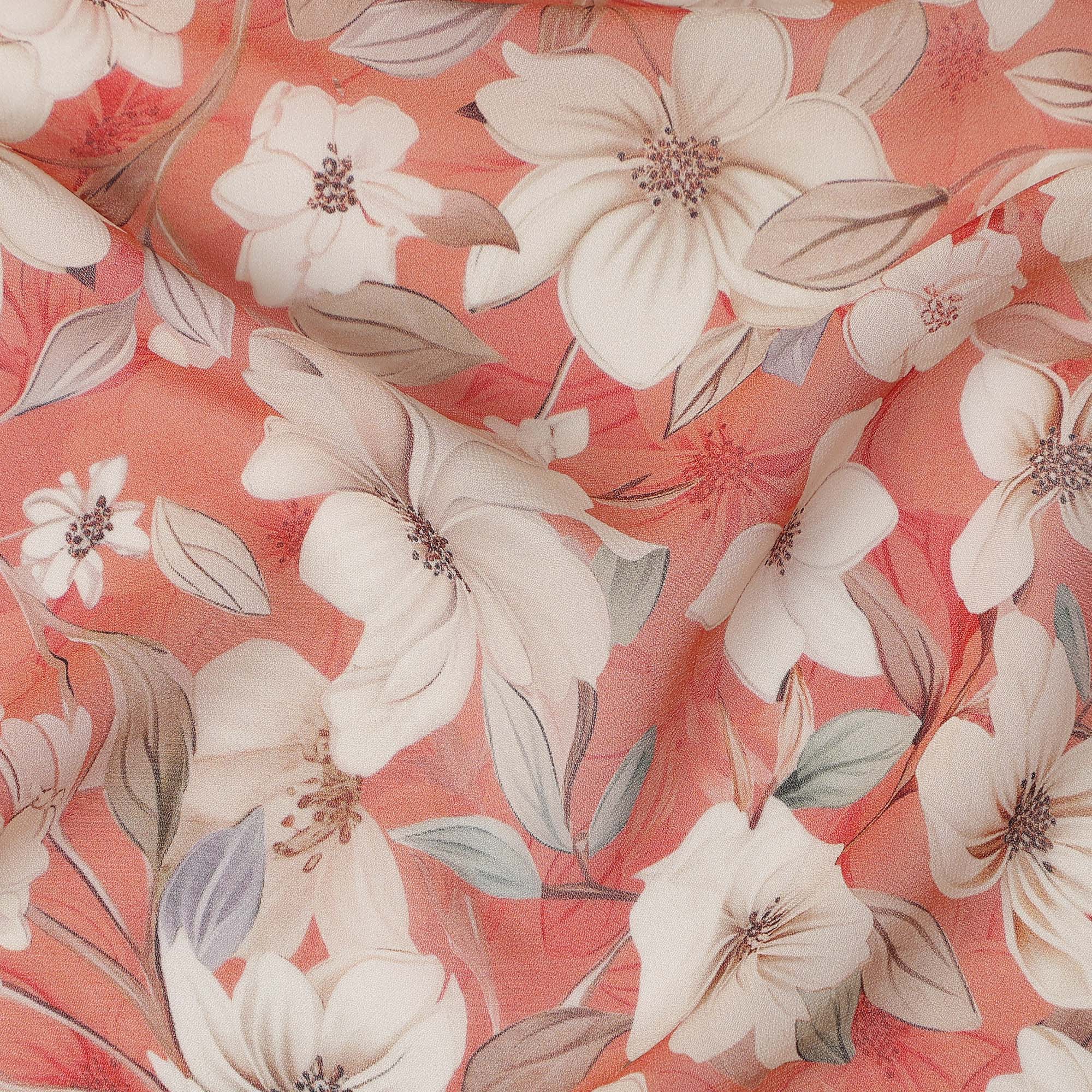 Coral peach viscose georgette fabric with ivory floral digital prints