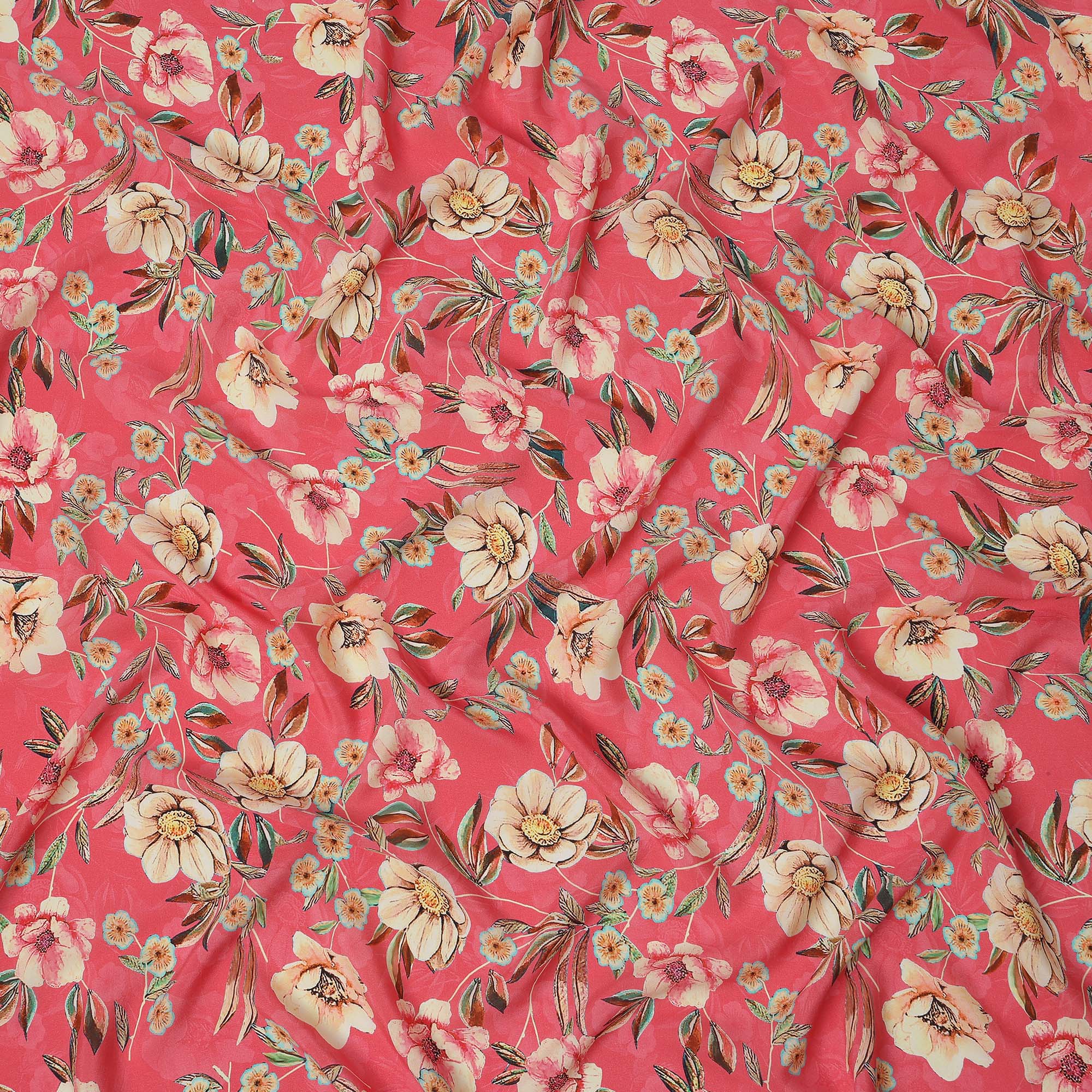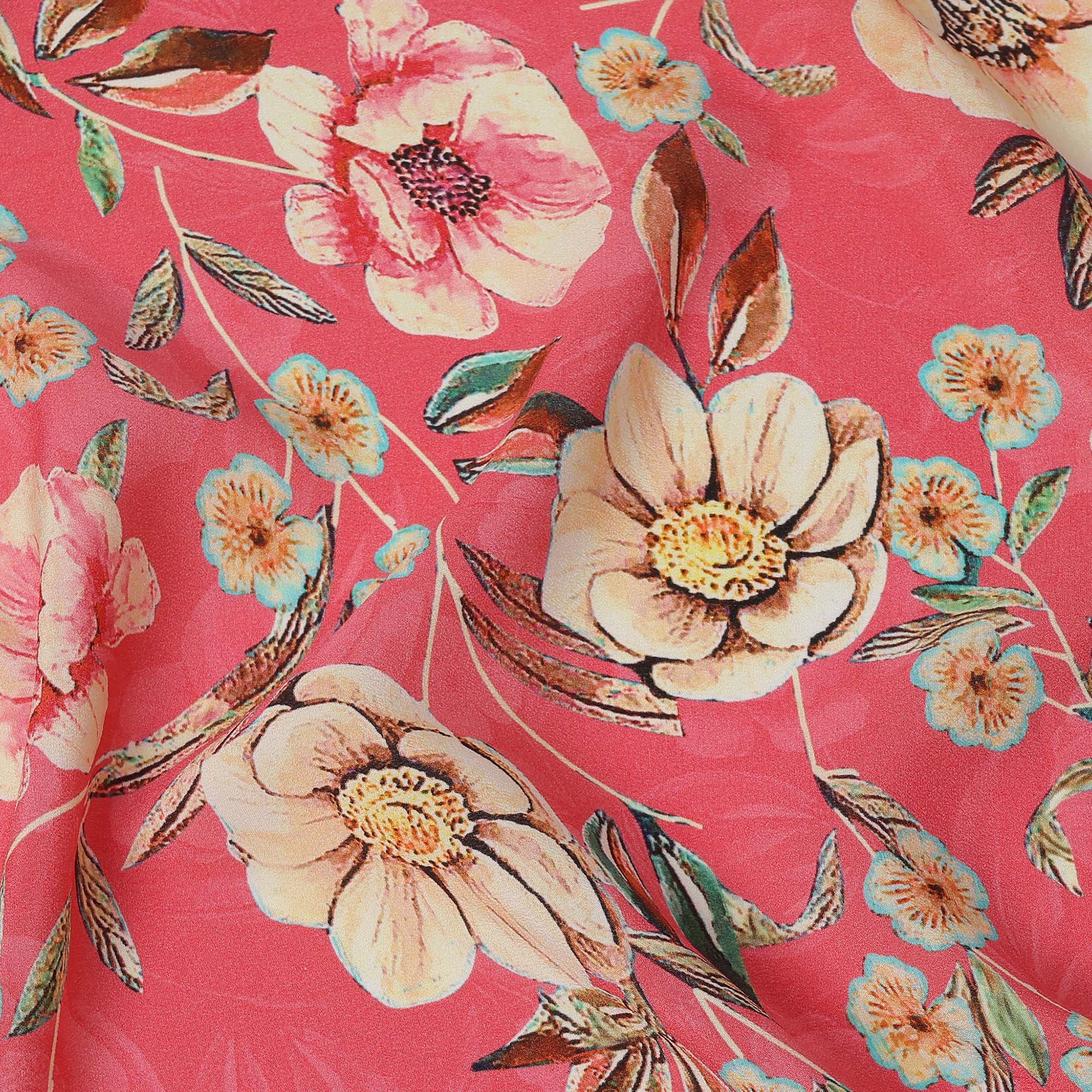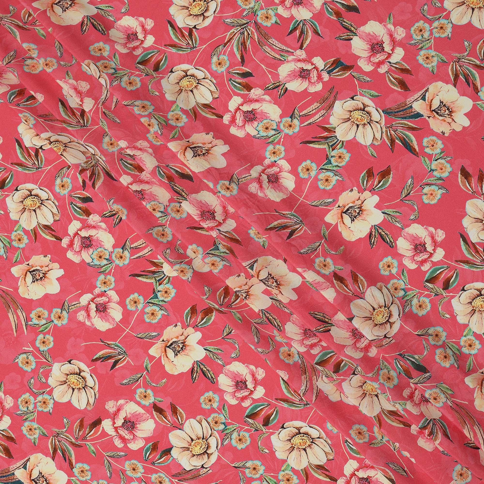 Premium coral pure silk crepe fabric with beige floral botanical print.