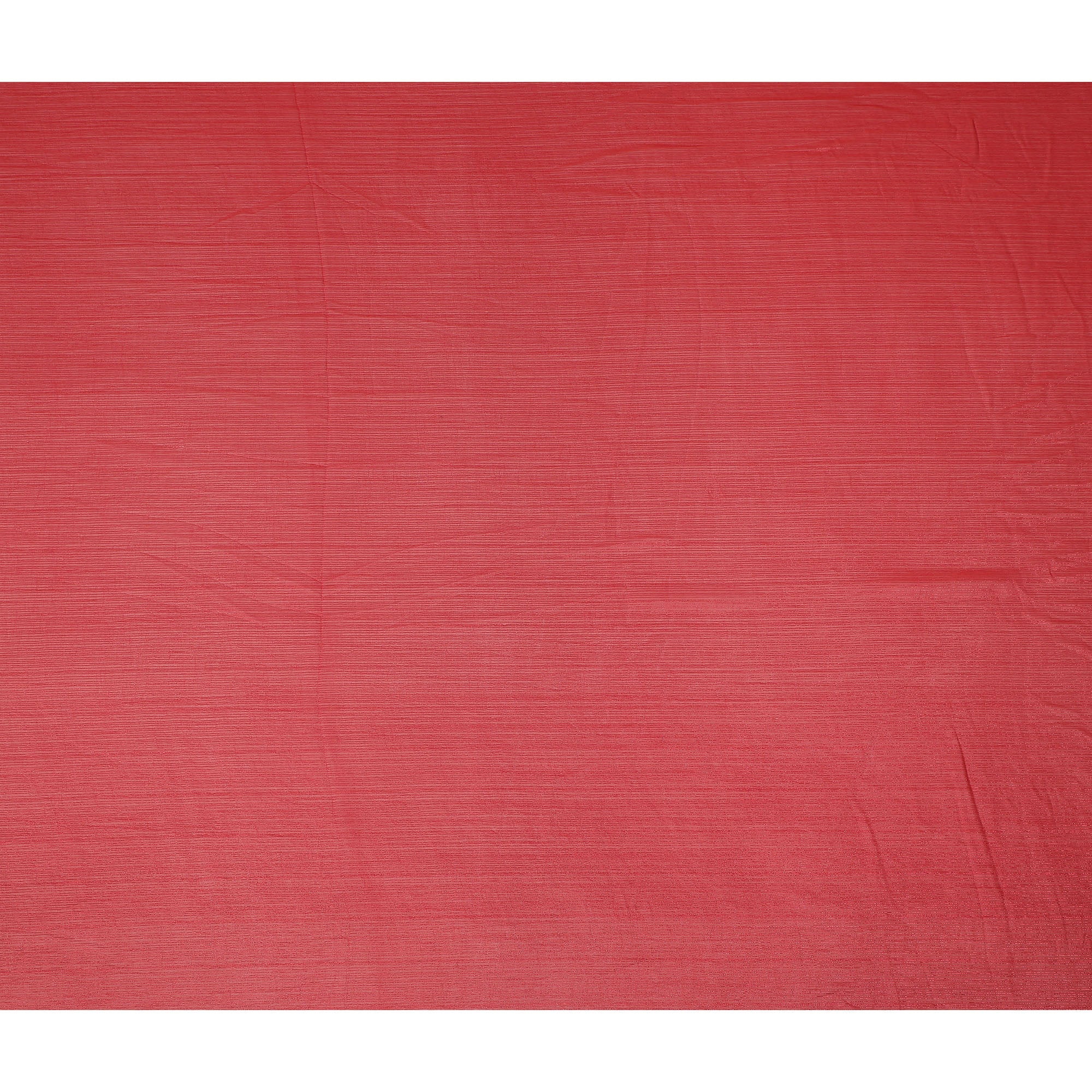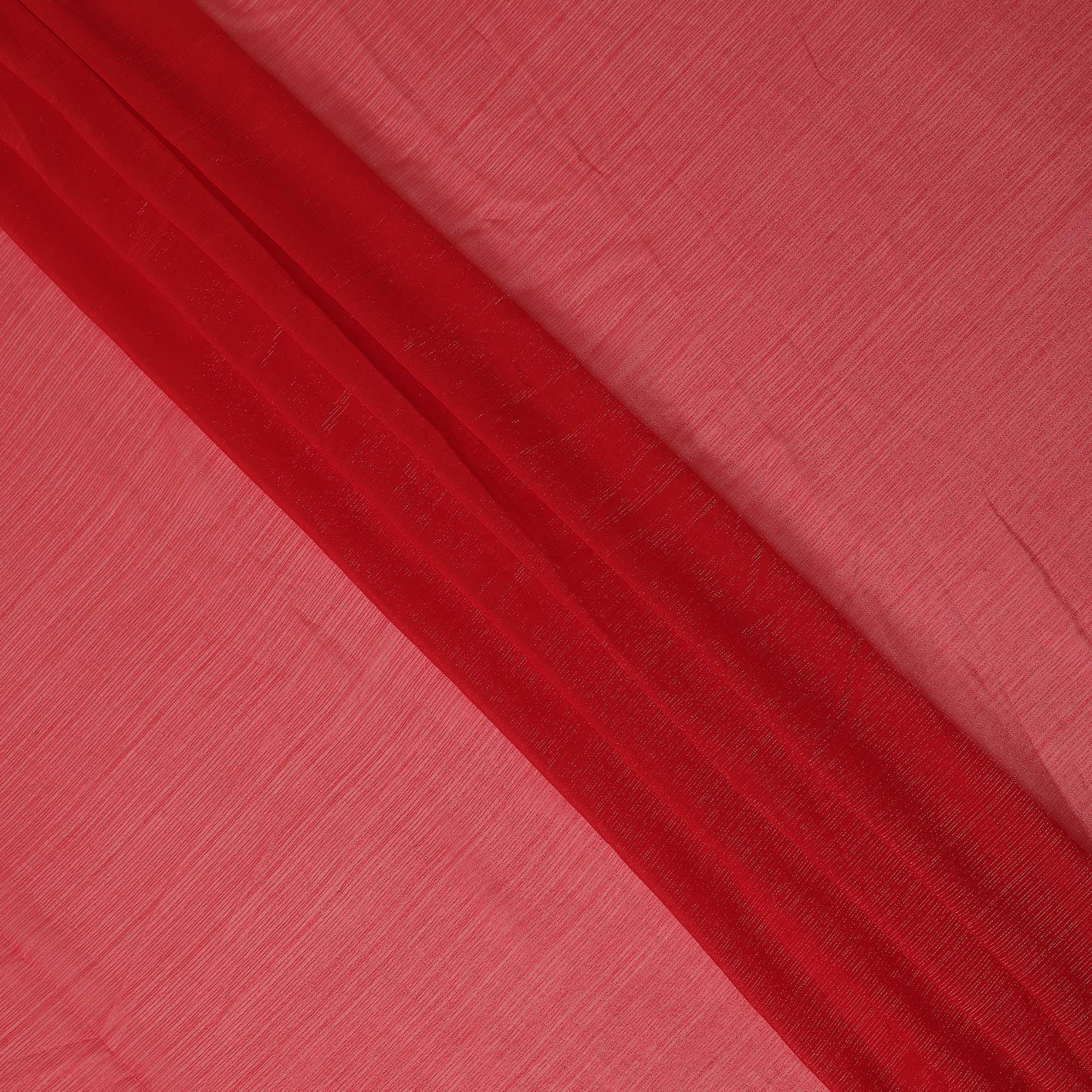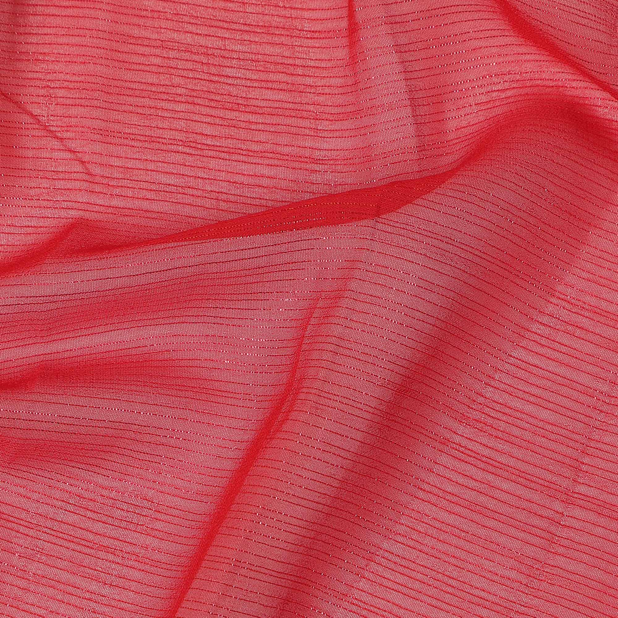 This coral synthetic chiffon fabric showcases a vibrant and refreshing tone enhanced with subtle self-textured linear detailing that adds dimension and a soft sheen to the surface. The lively coral color brings warmth and elegance, making it a perfect choice for festive wear, summer outfits, and occasion ensembles. Lightweight and airy in nature, this chiffon fabric drapes effortlessly to create flowing silhouettes with a graceful and sheer finish. Its smooth texture feels soft against the skin while offering breathable comfort for long hours of wear. With a width of 110 cms, it is ideal for sarees, gowns, dupattas, overlays, and layered fashion designs. Made in India, this fabric combines delicate appeal with durability and easy maintenance.