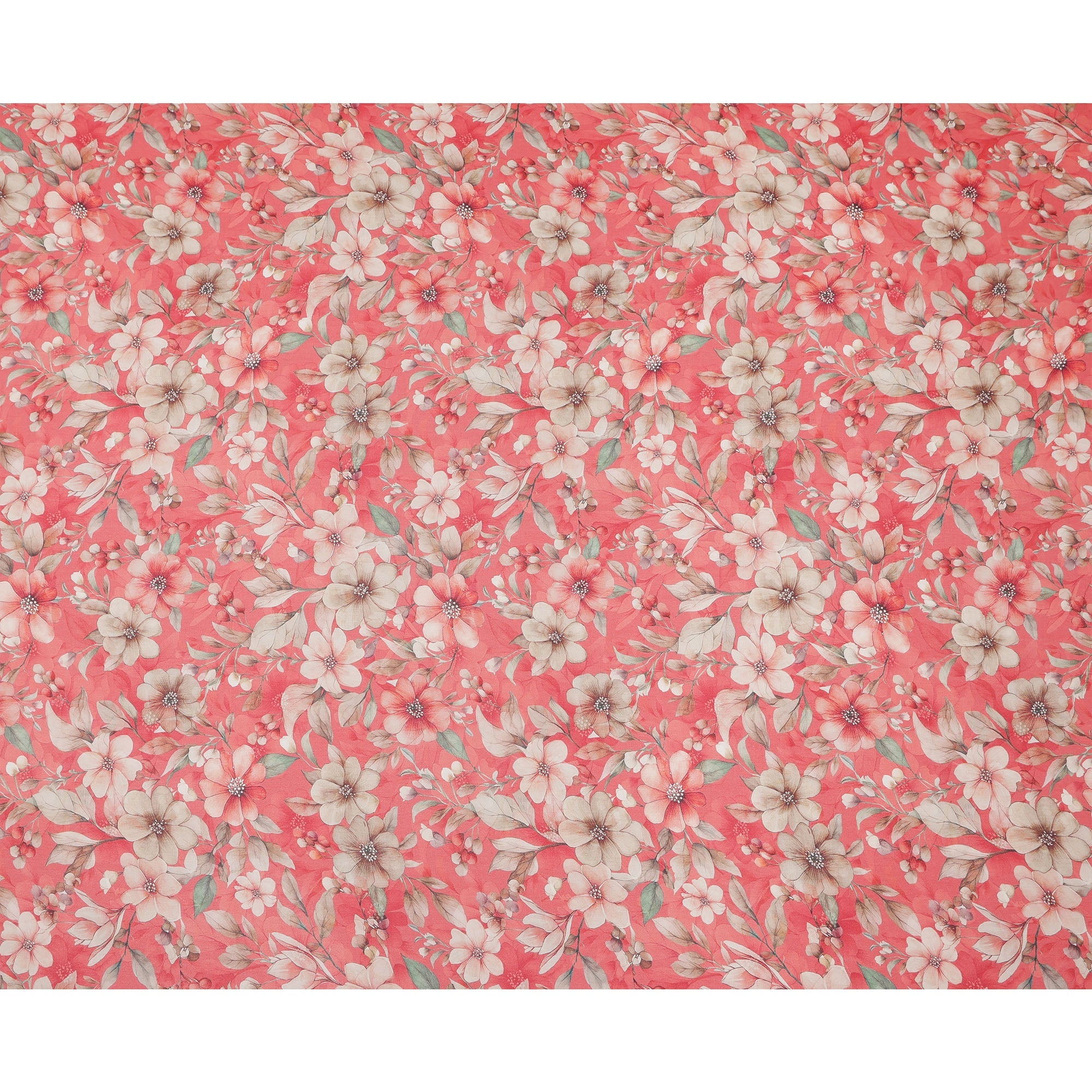 Coral Red and Beige Floral Printed Viscose Georgette Fabric with Soft Green Leaf Motifs and Delicate Bloom Design, 110 Cms Width, Made in India-D25877