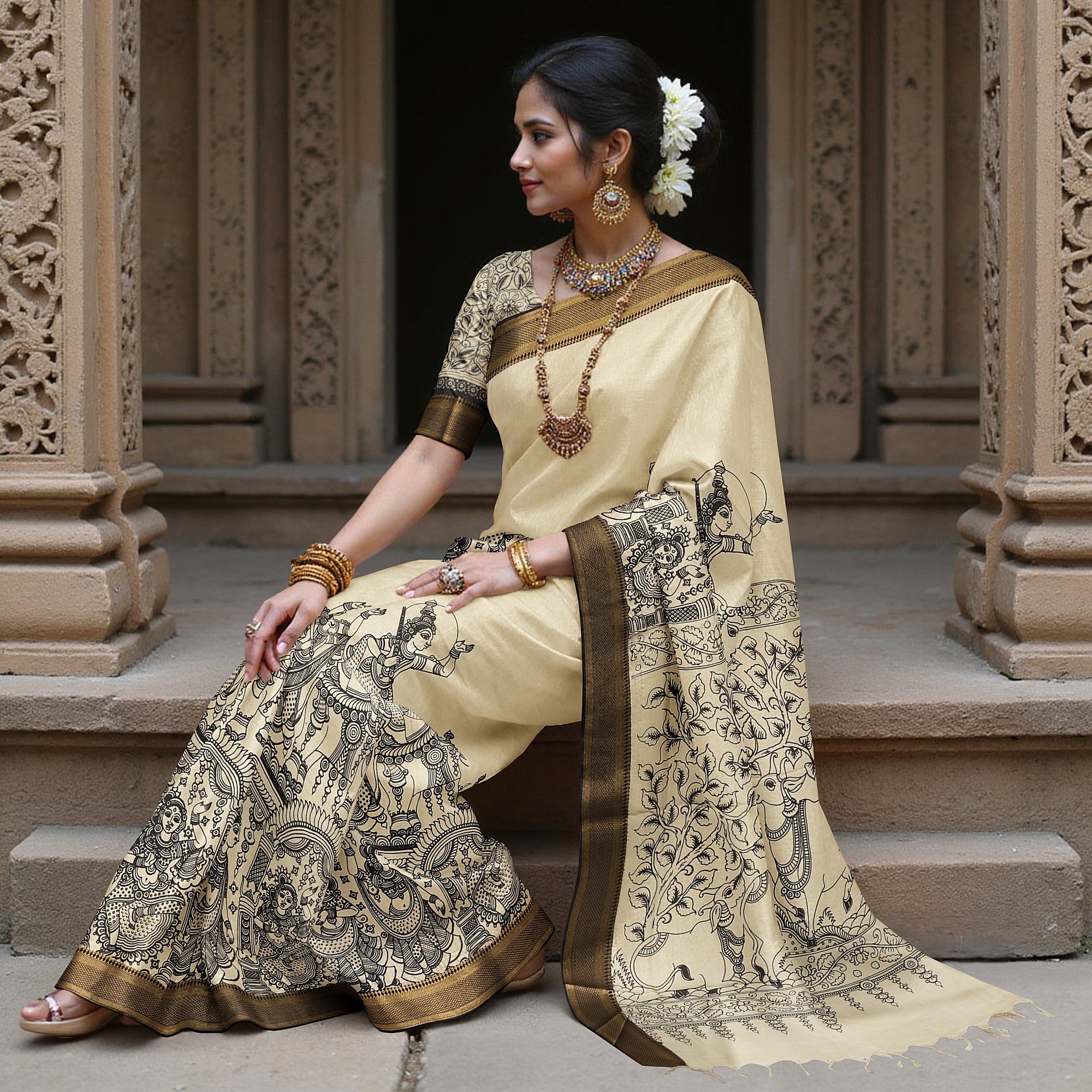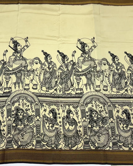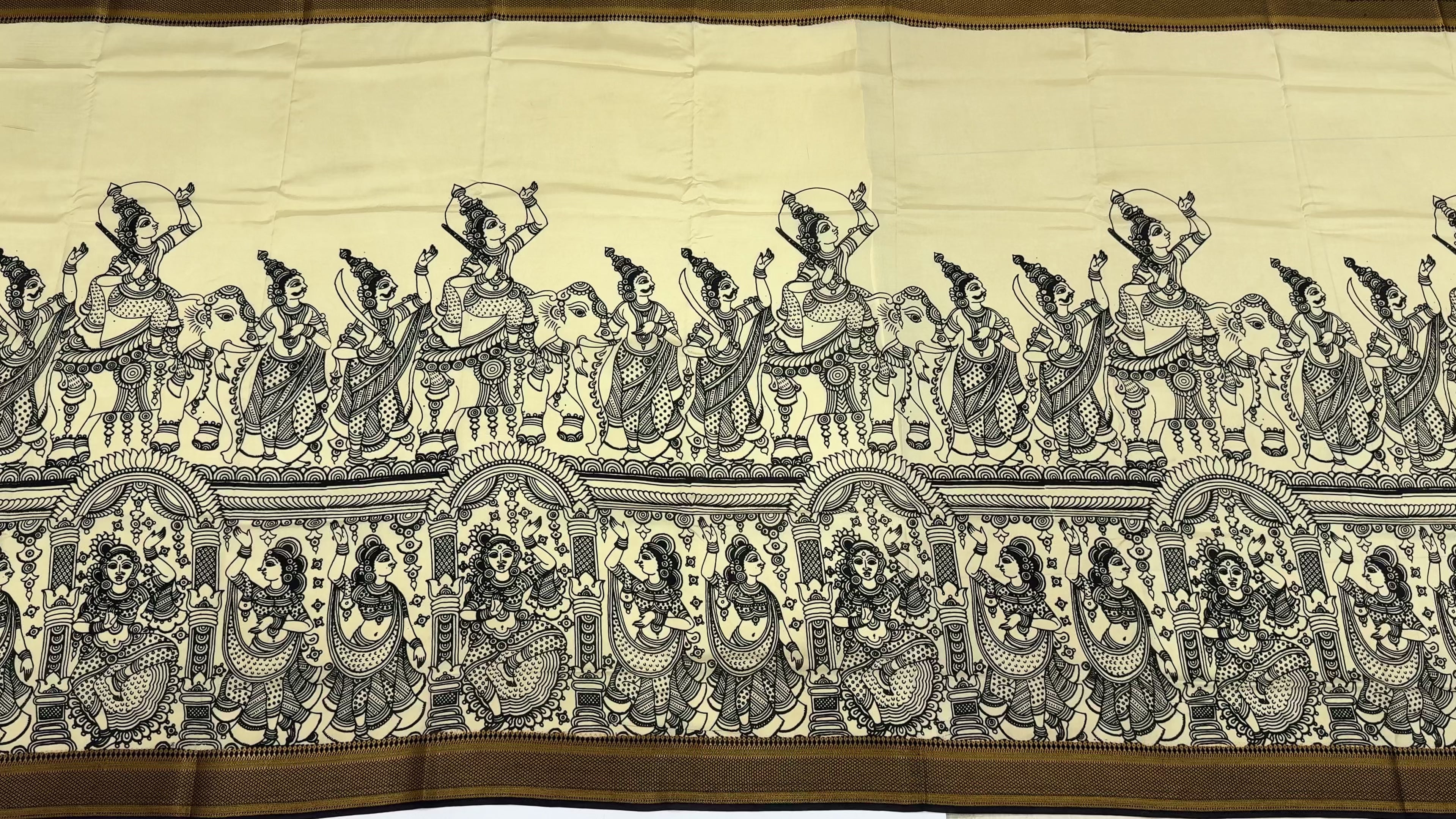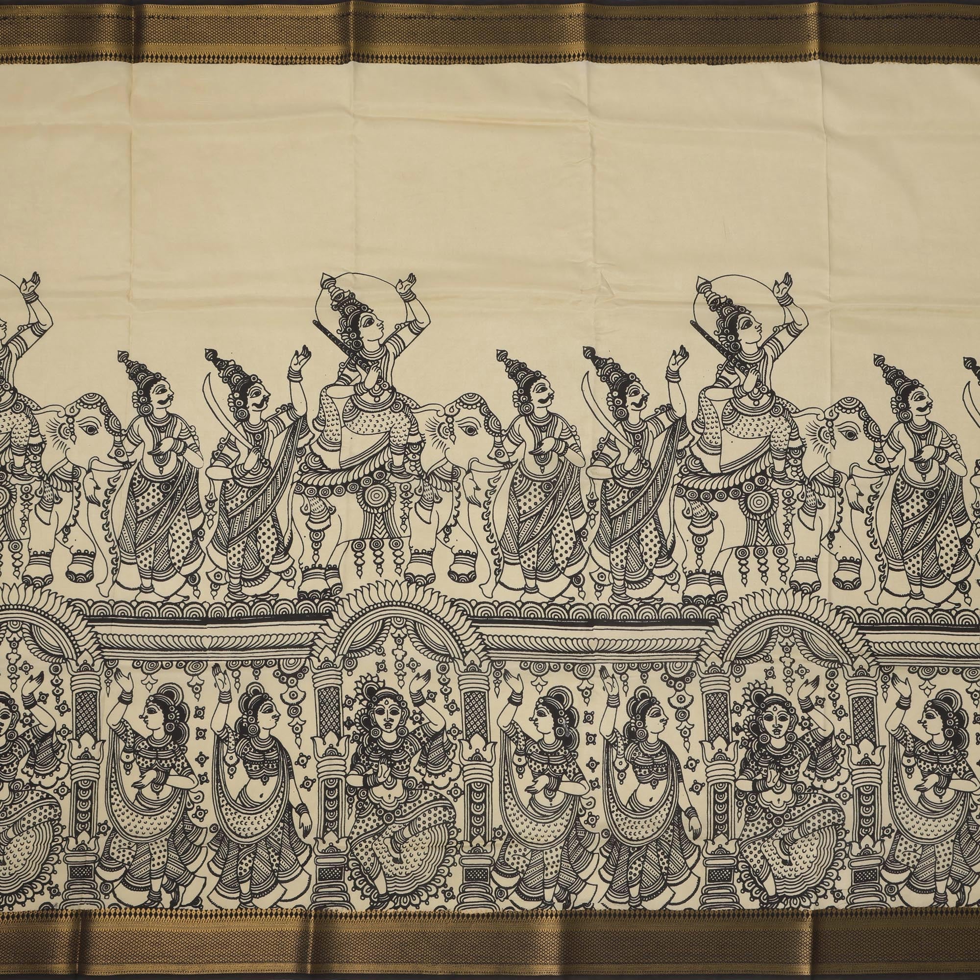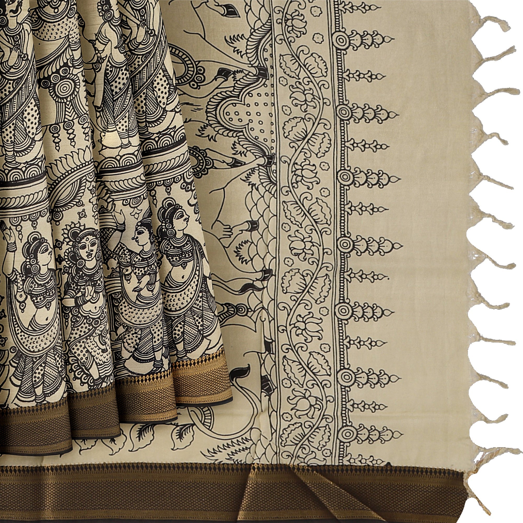 ساري كالامكاري حريري كريمي من بنغالور بنقوش أسطورية مرسومة يدويًا، عرض 110 سم، أصله: سري كالاهاستي، الهند، طوله 5.5 متر مع بلوزة - D22837
