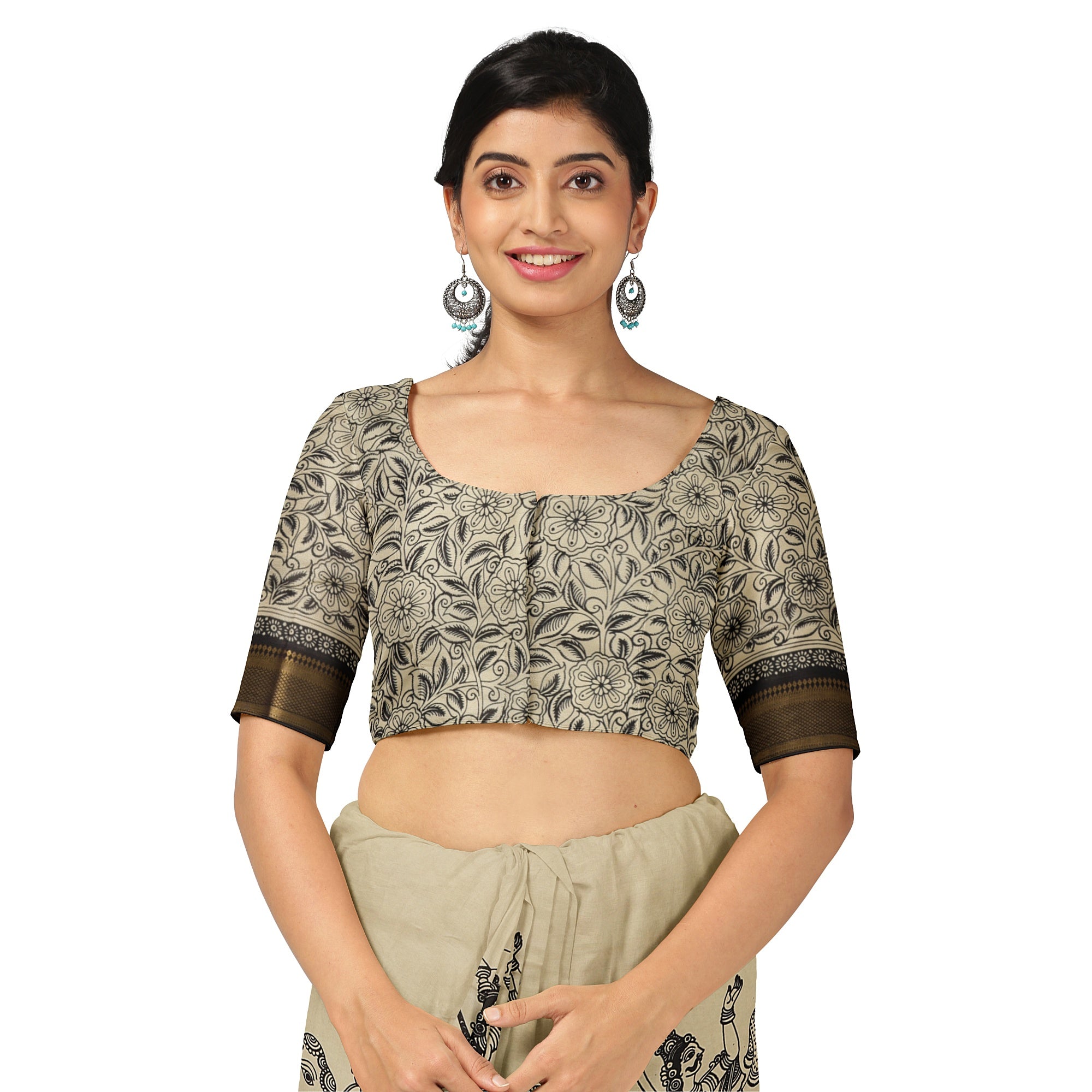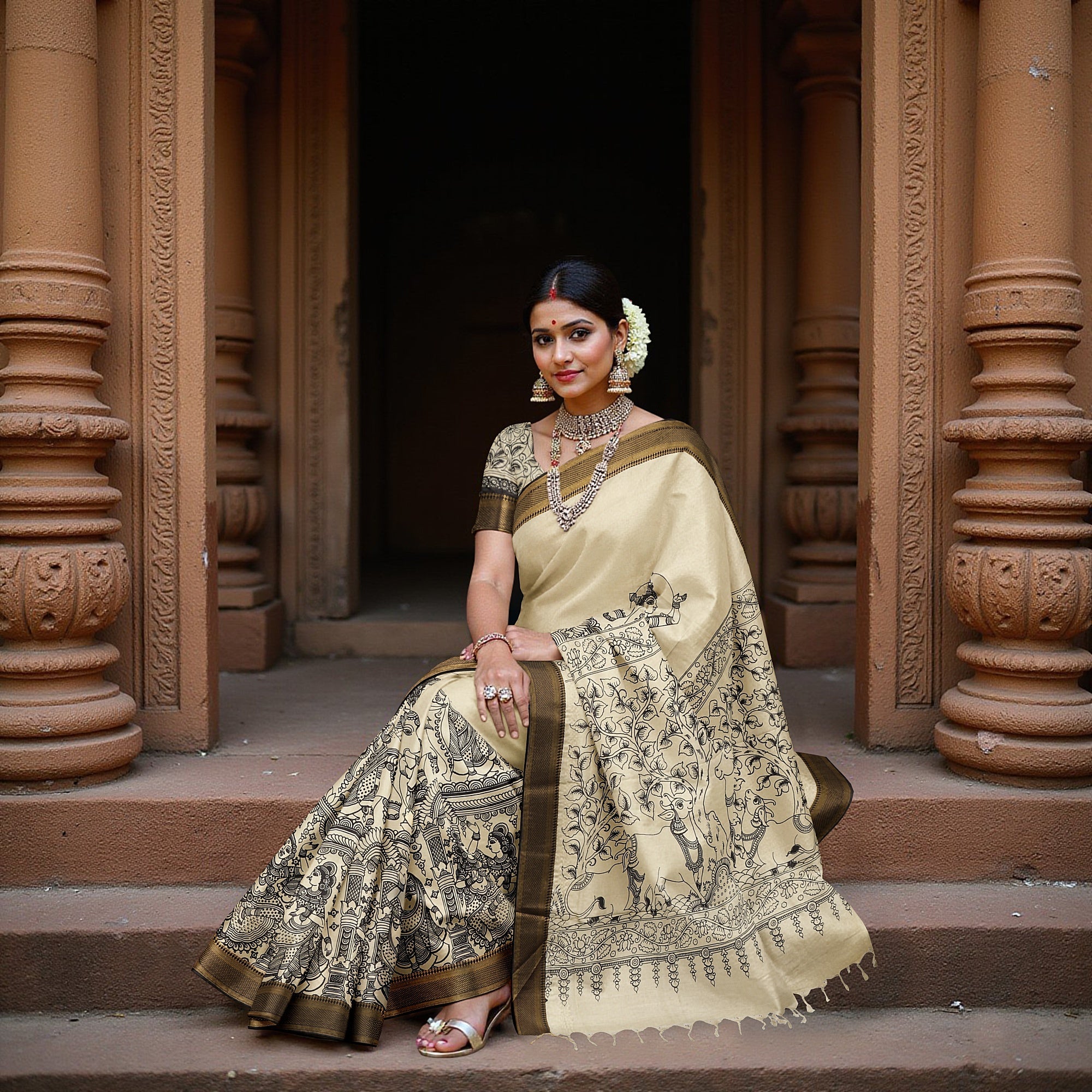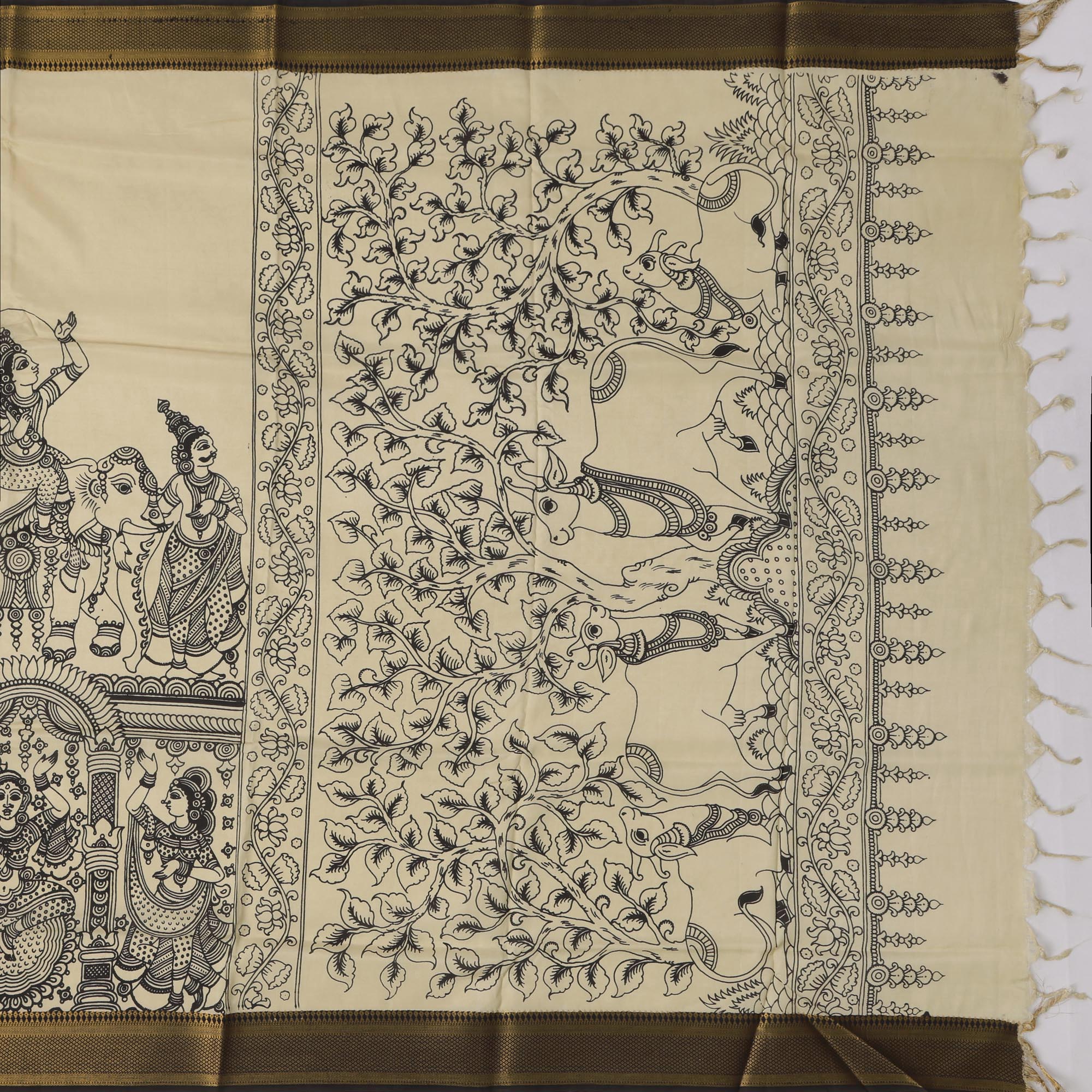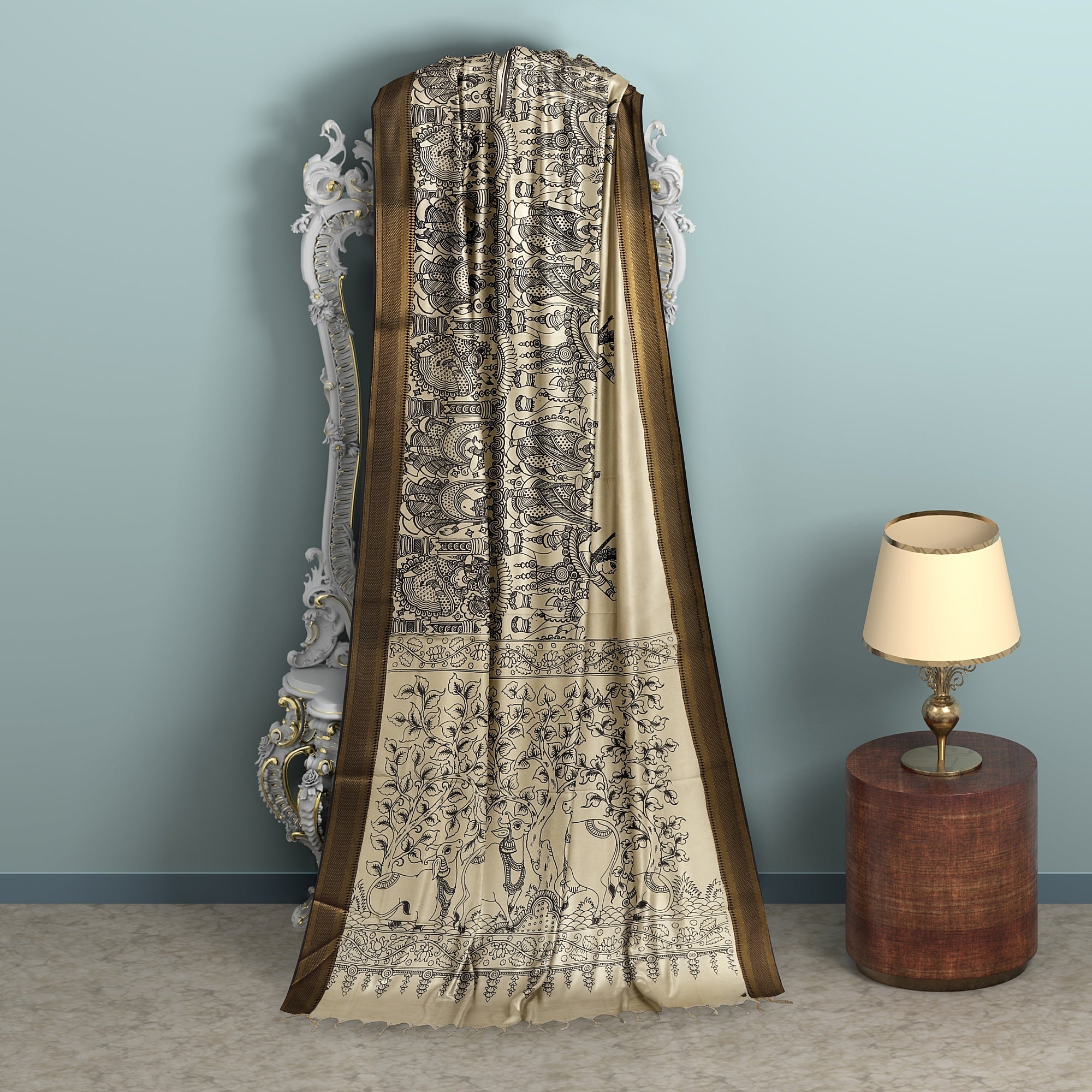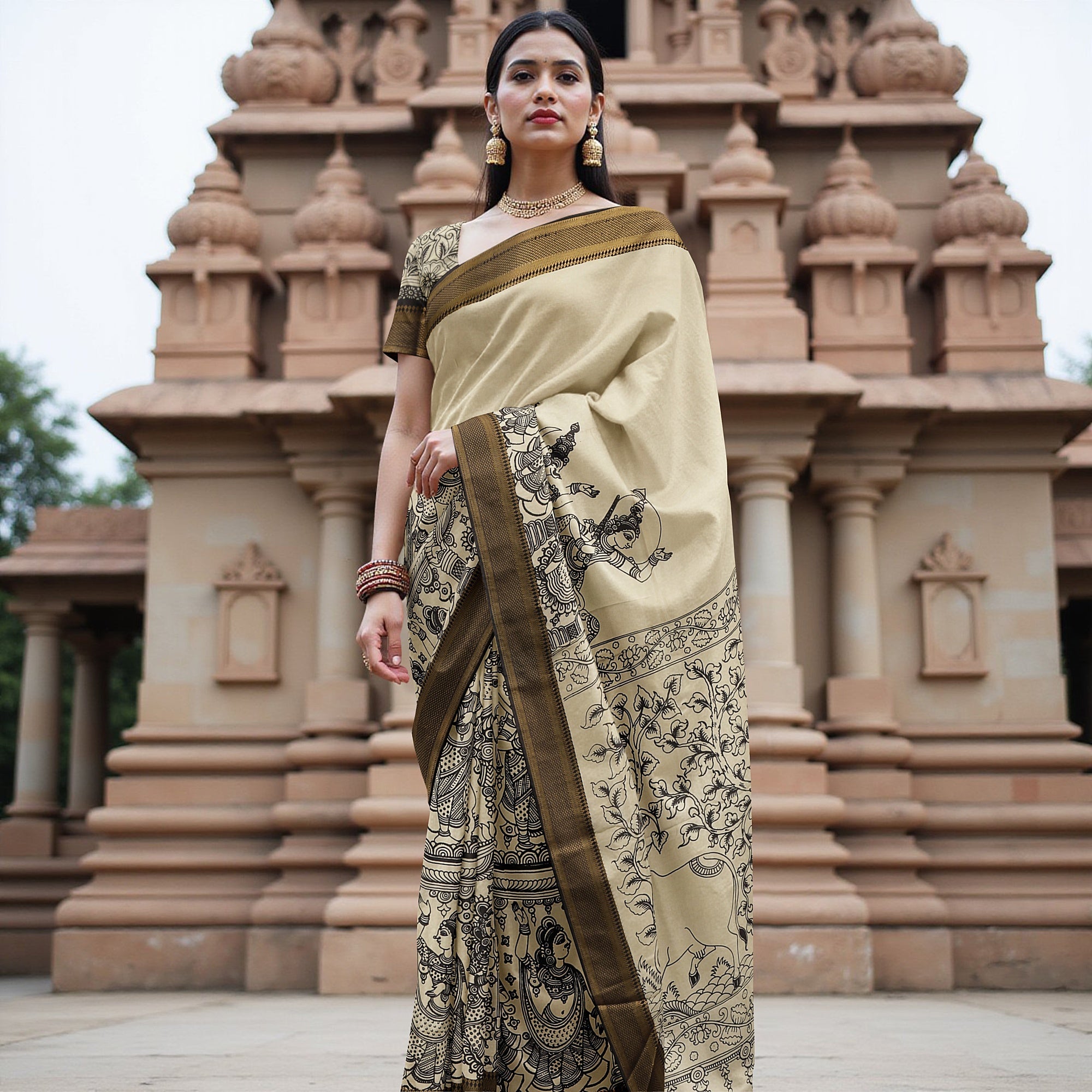 ساري كالامكاري حريري كريمي من بنغالور بنقوش أسطورية مرسومة يدويًا، عرض 110 سم، أصله: سري كالاهاستي، الهند، طوله 5.5 متر مع بلوزة - D22837