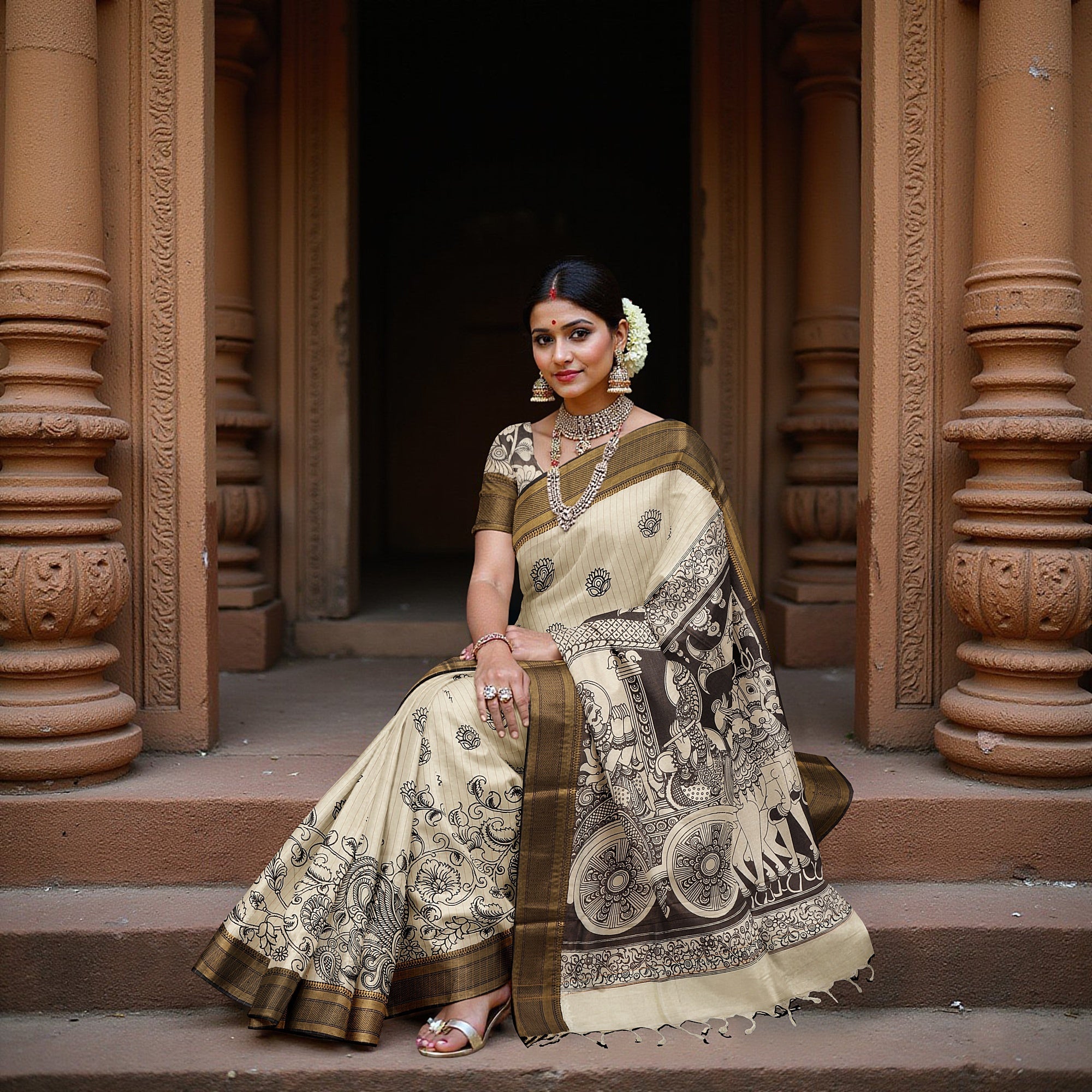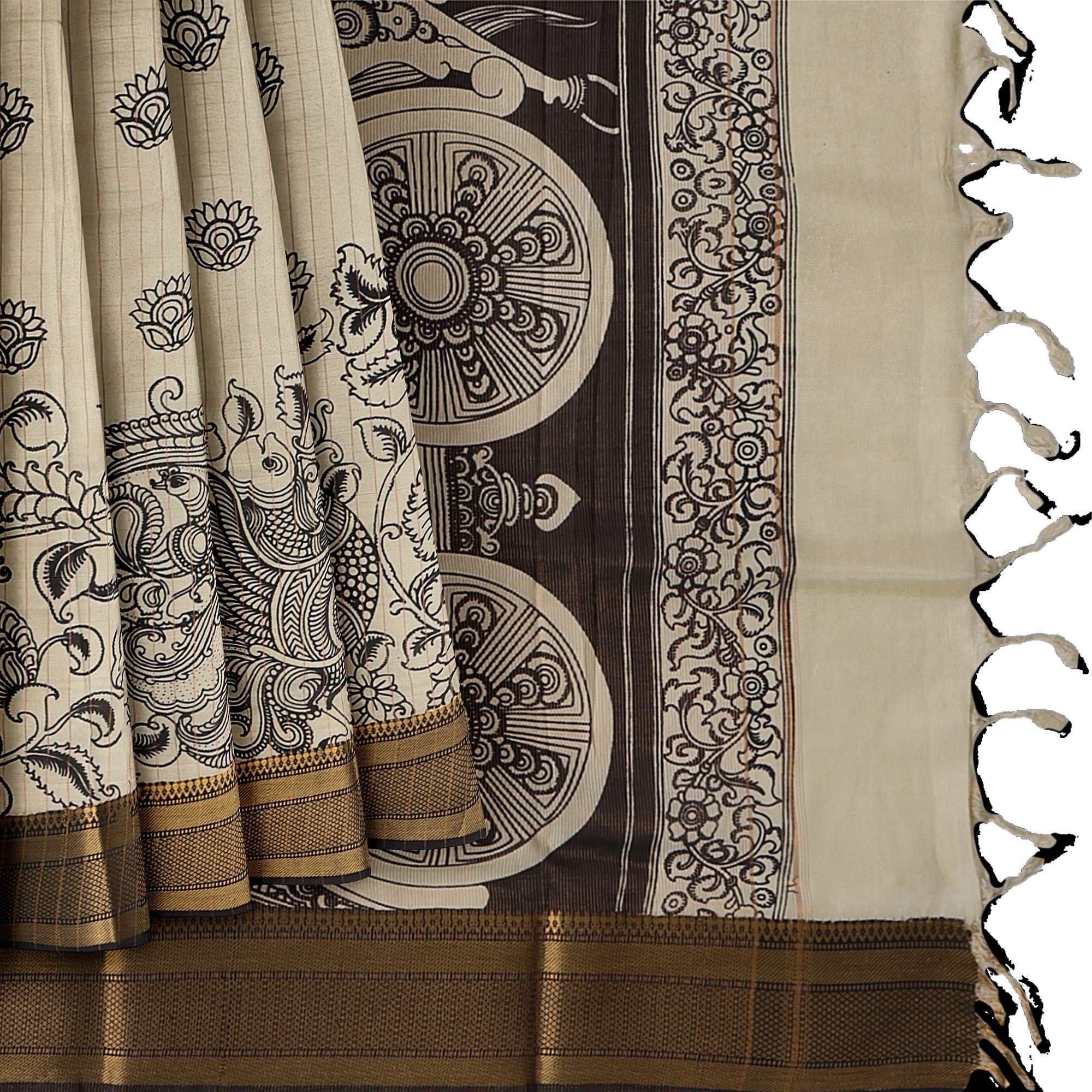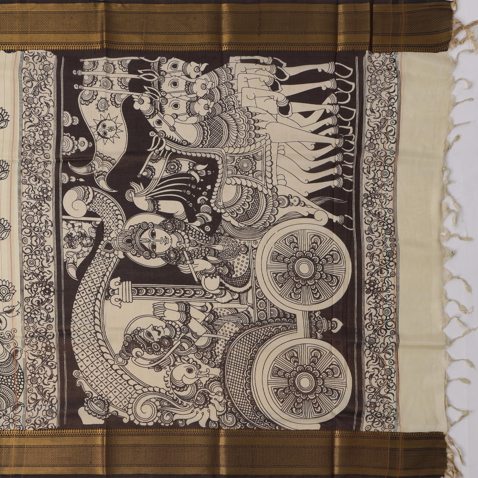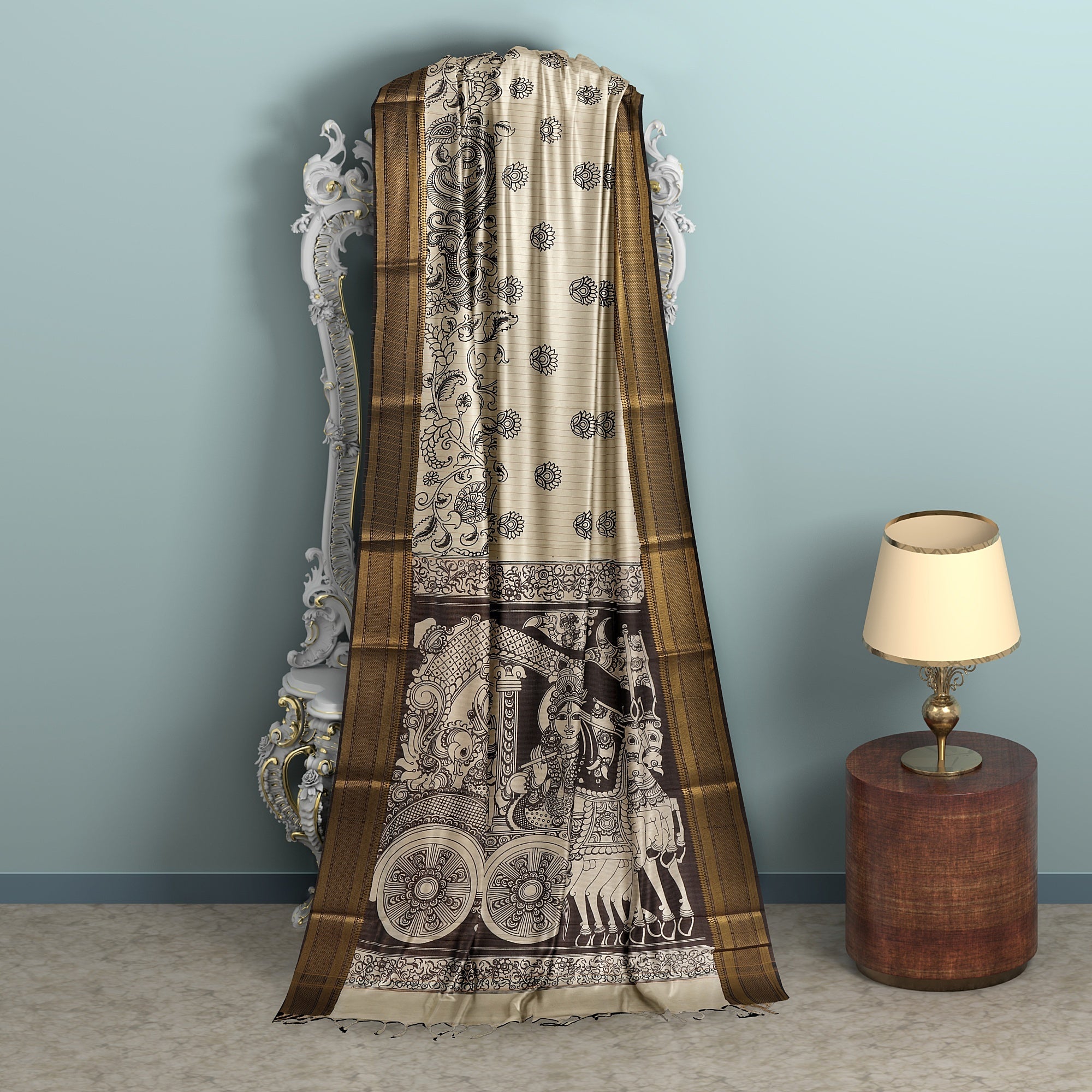 ساري كالامكاري حريري كريمي من بنغالور، مزين بمشاهد تقليدية مرسومة يدويًا، عرض 110 سم، أصله: سري كالاهاستي، الهند، طوله 5.5 متر مع بلوزة - D22834