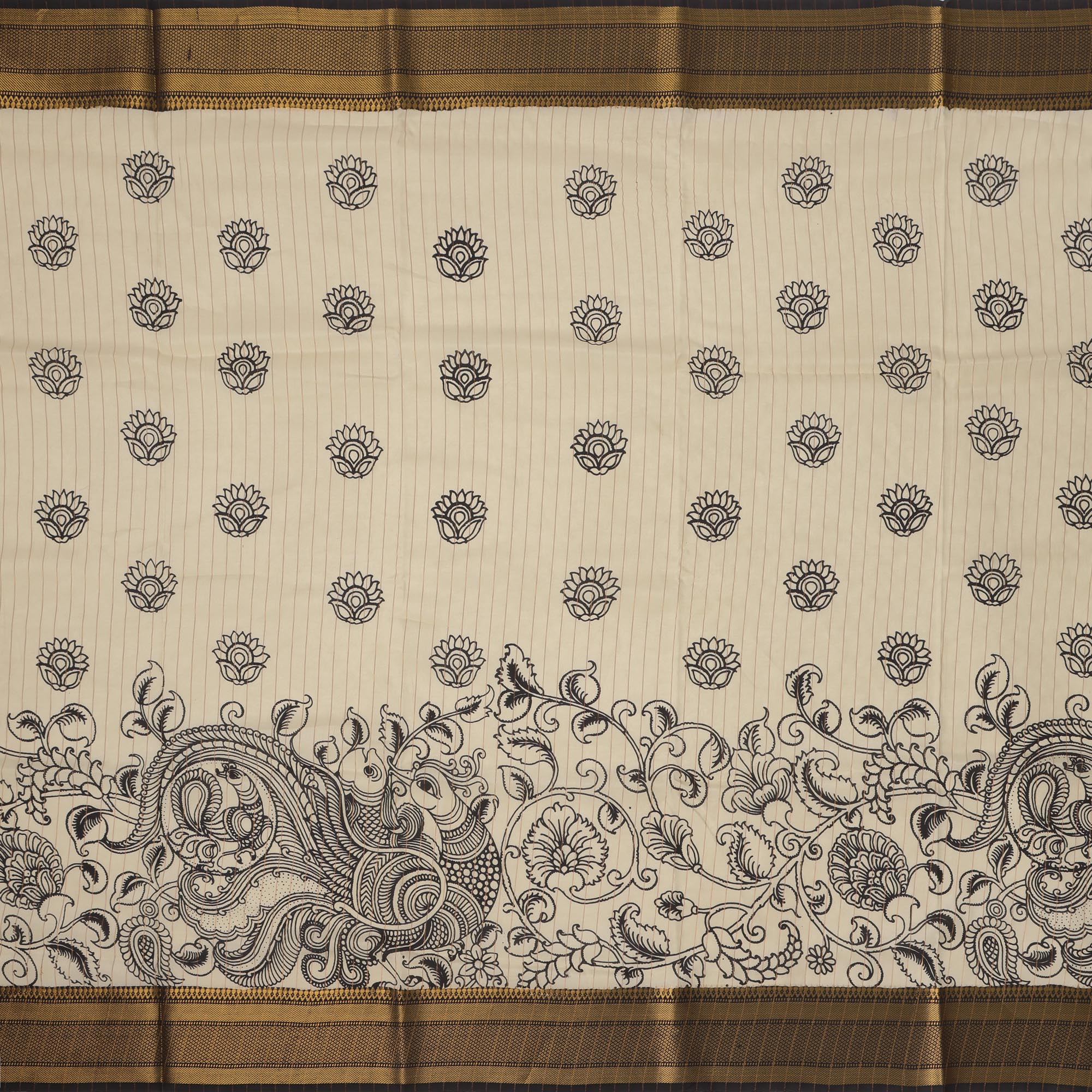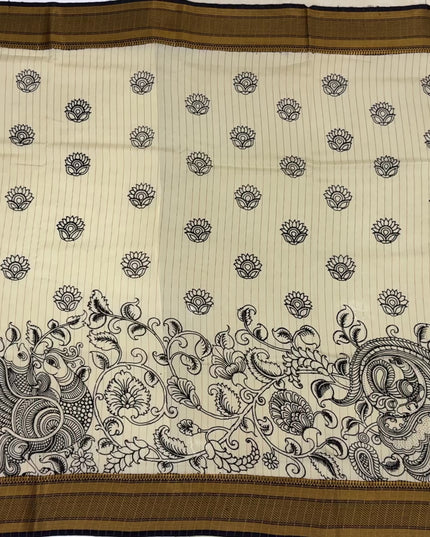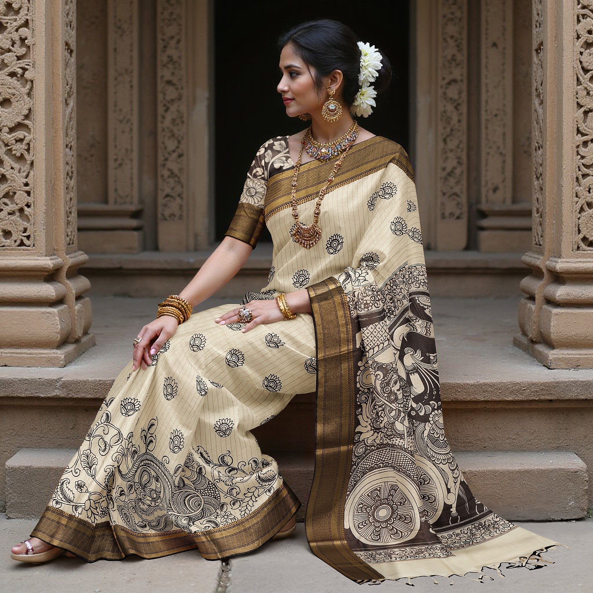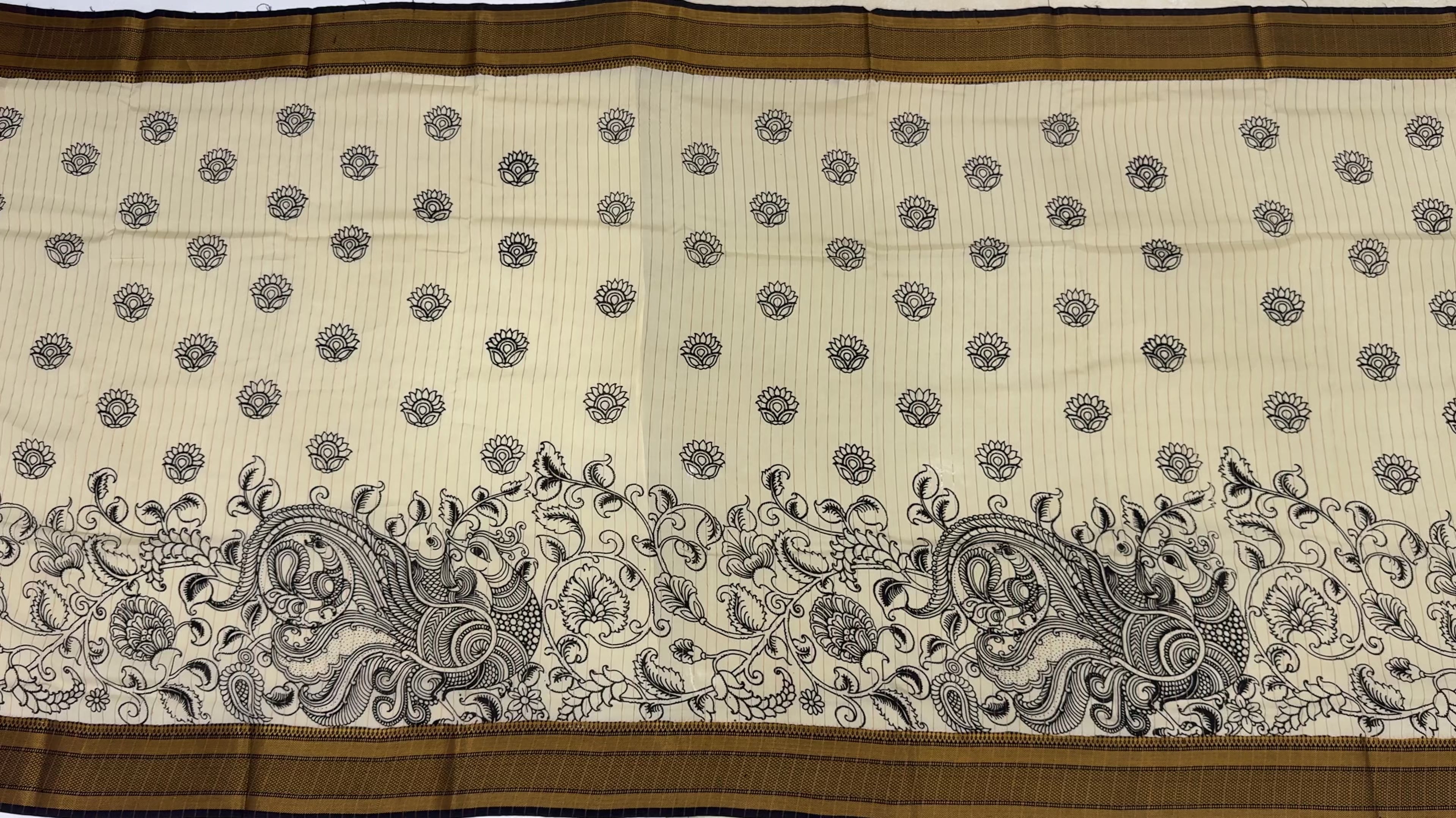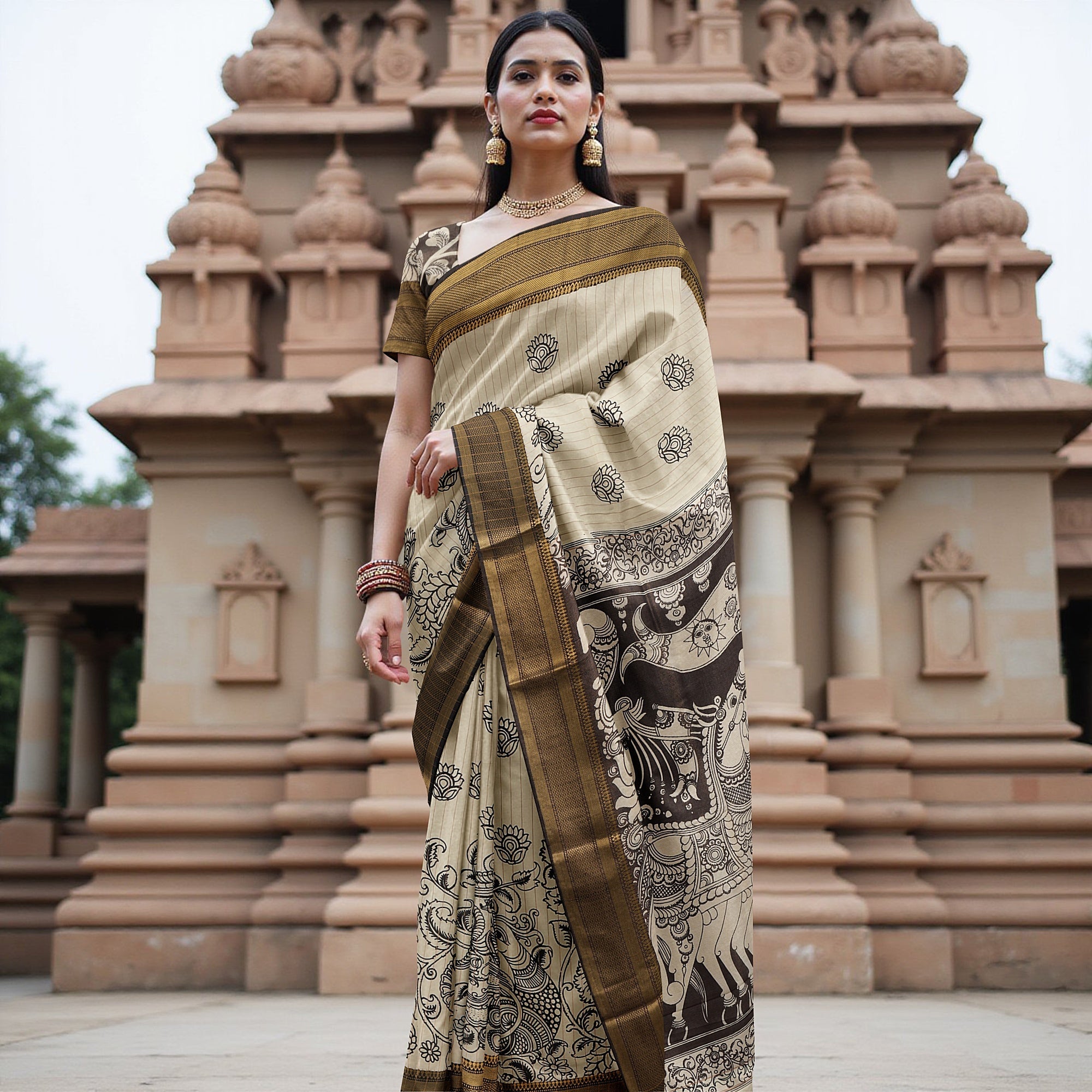 ساري كالامكاري حريري كريمي من بنغالور، مزين بمشاهد تقليدية مرسومة يدويًا، عرض 110 سم، أصله: سري كالاهاستي، الهند، طوله 5.5 متر مع بلوزة - D22834