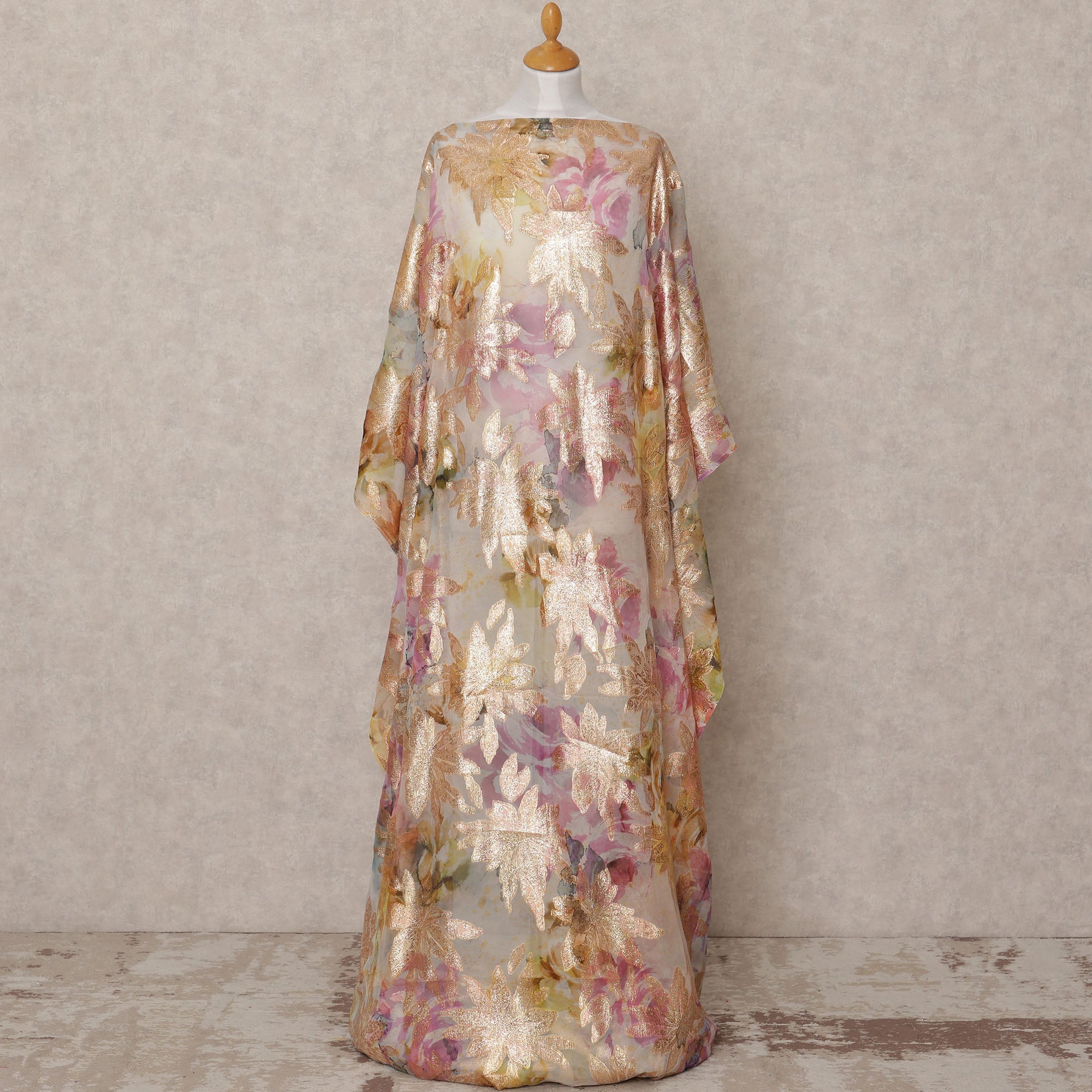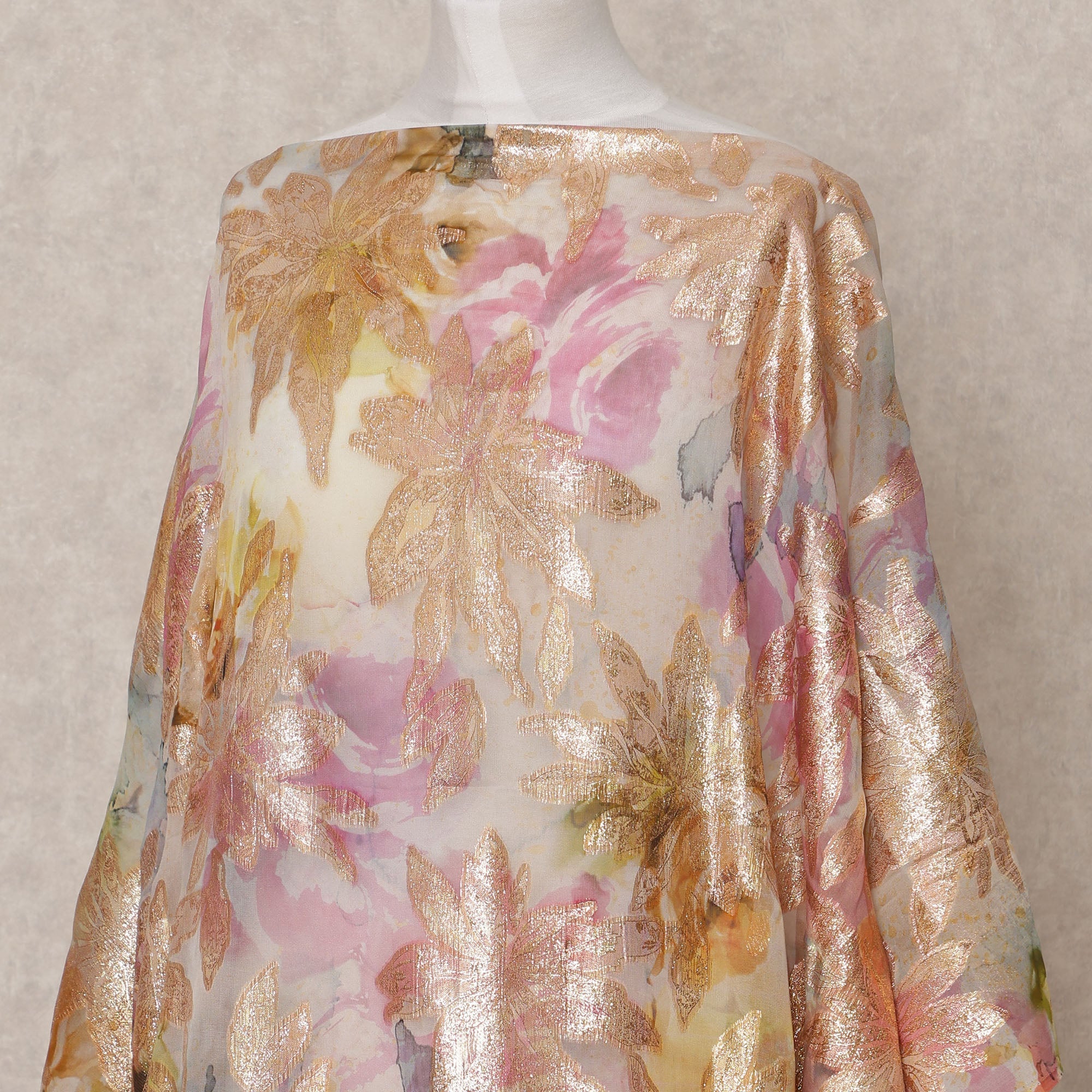 قماش ديراك شيفون حريري صومالي متعدد الأزهار بلون كريمي، مُزين بنقوش زهور لوريكس معدنية، يمزج بين درجات الباستيل الناعمة واللمسة... اقرأ أكثر اقرأ أكثر