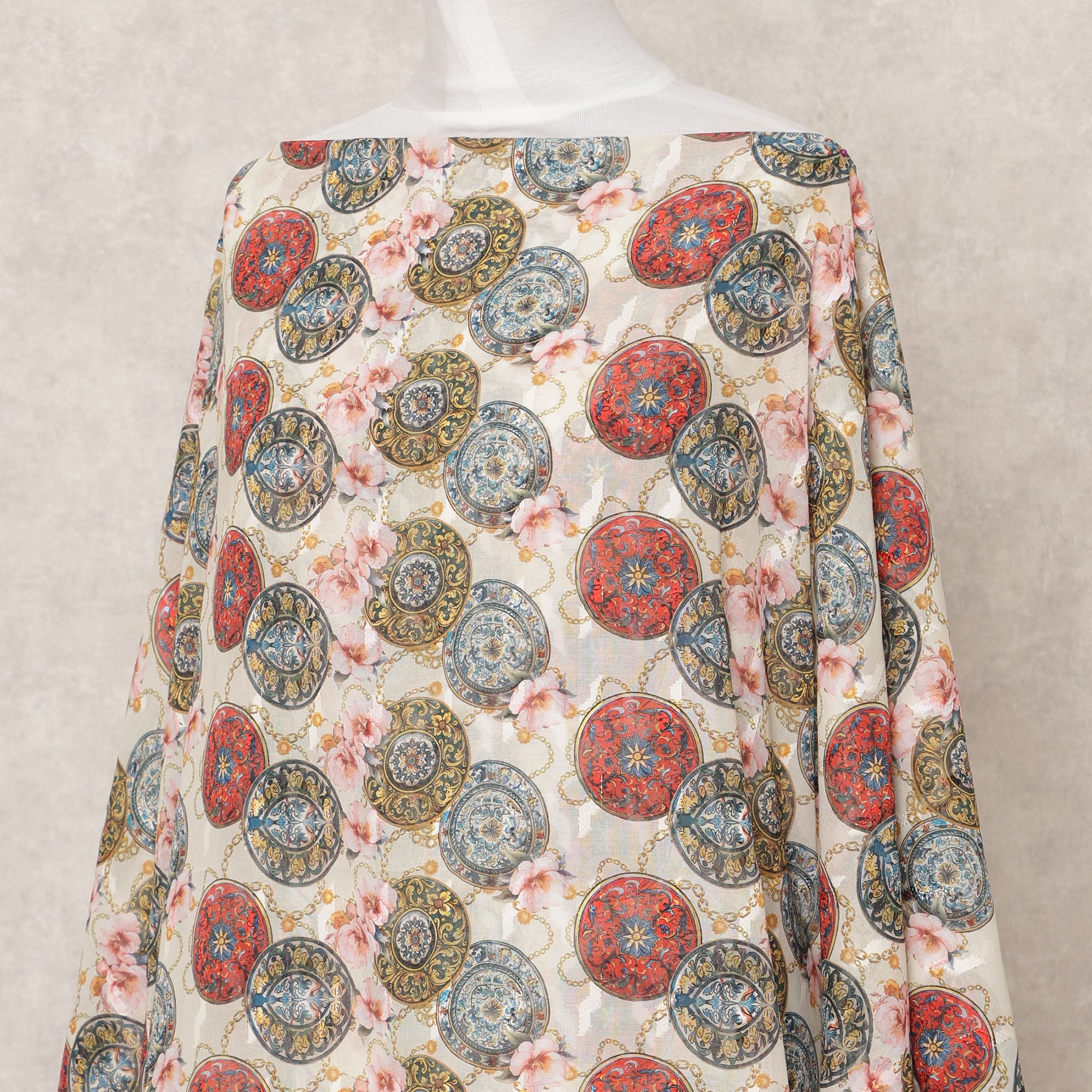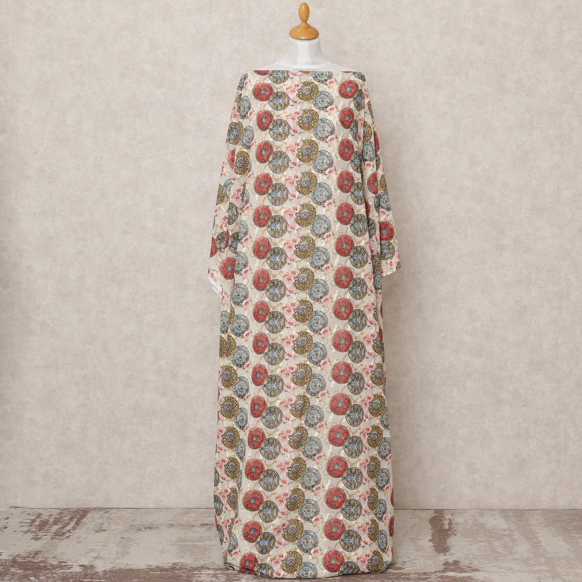 أضفِ لمسةً من الأناقة التقليدية إلى خزانة ملابسك مع هذا القماش القطني الصومالي الفوال الكريمي، المزين بزخارف عرقية دائرية بألوان الأحمر الصدئ والأخضر المائل للرمادي والأصفر الخردلي والأزرق الرمادي، ليعكس سردًا ثقافيًا غنيًا. صُنعت هذه القطعة، التي يبلغ طولها 3.5 متر، في الهند باستخدام قماش قطني ناعم ومسامي، يضمن لك راحةً طوال اليوم مع الحفاظ على مظهر انسيابي وانسيابي. تبرز الأنماط المتناسقة الزاهية بشكل جميل على قاعدة كريمية محايدة، مما يجعلها خيارًا ممتازًا للعبايات والحجابات والسترات والملابس العرقية الاحتفالية. بعرض 140 سم، يوفر هذا القماش خامةً واسعةً لإمكانيات تصميم متعددة، من التصاميم المنسدلة إلى المجموعات متعددة الطبقات. يعزز النسيج خفيف الوزن والطباعة عالية الجودة من مظهر القماش وسهولة ارتدائه. اشترِ عبر الإنترنت لإضافة لمسة فنية وحرفية هندية إلى مجموعتك التقليدية. تسوق عبر الإنترنت للحصول على قماش يضفي أصالةً ثقافية على أسلوبك الإبداعي.