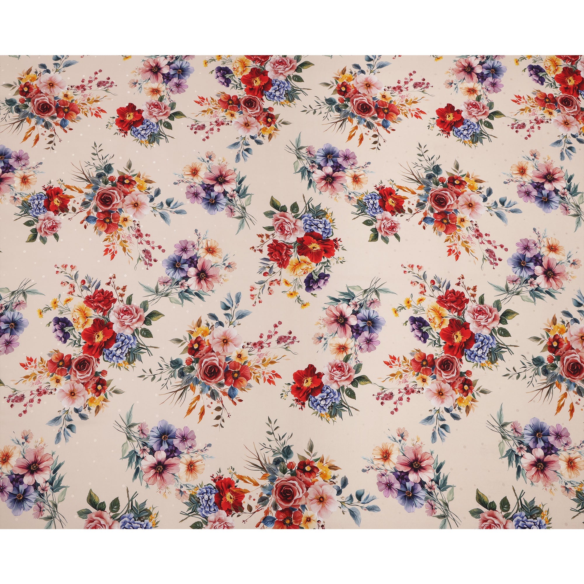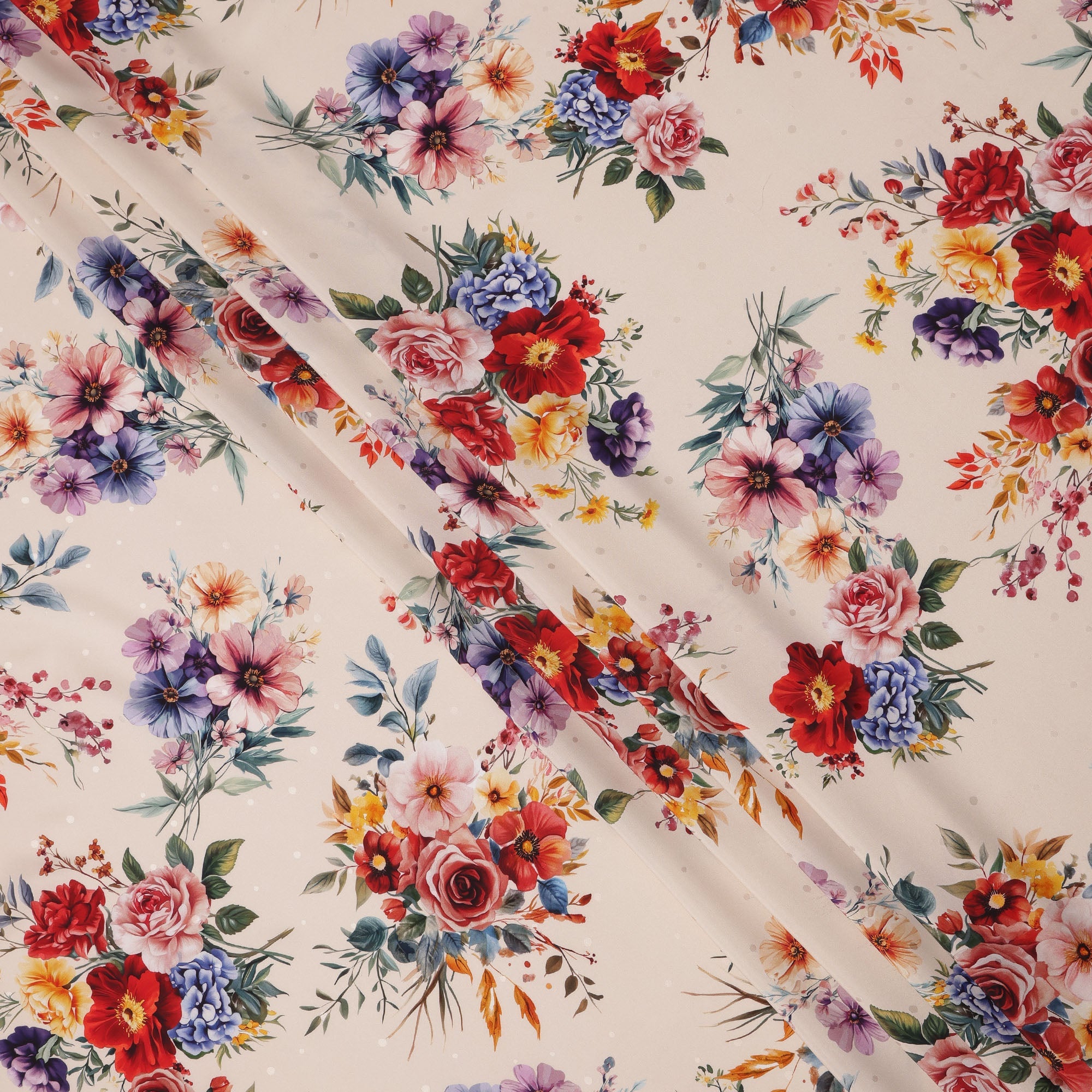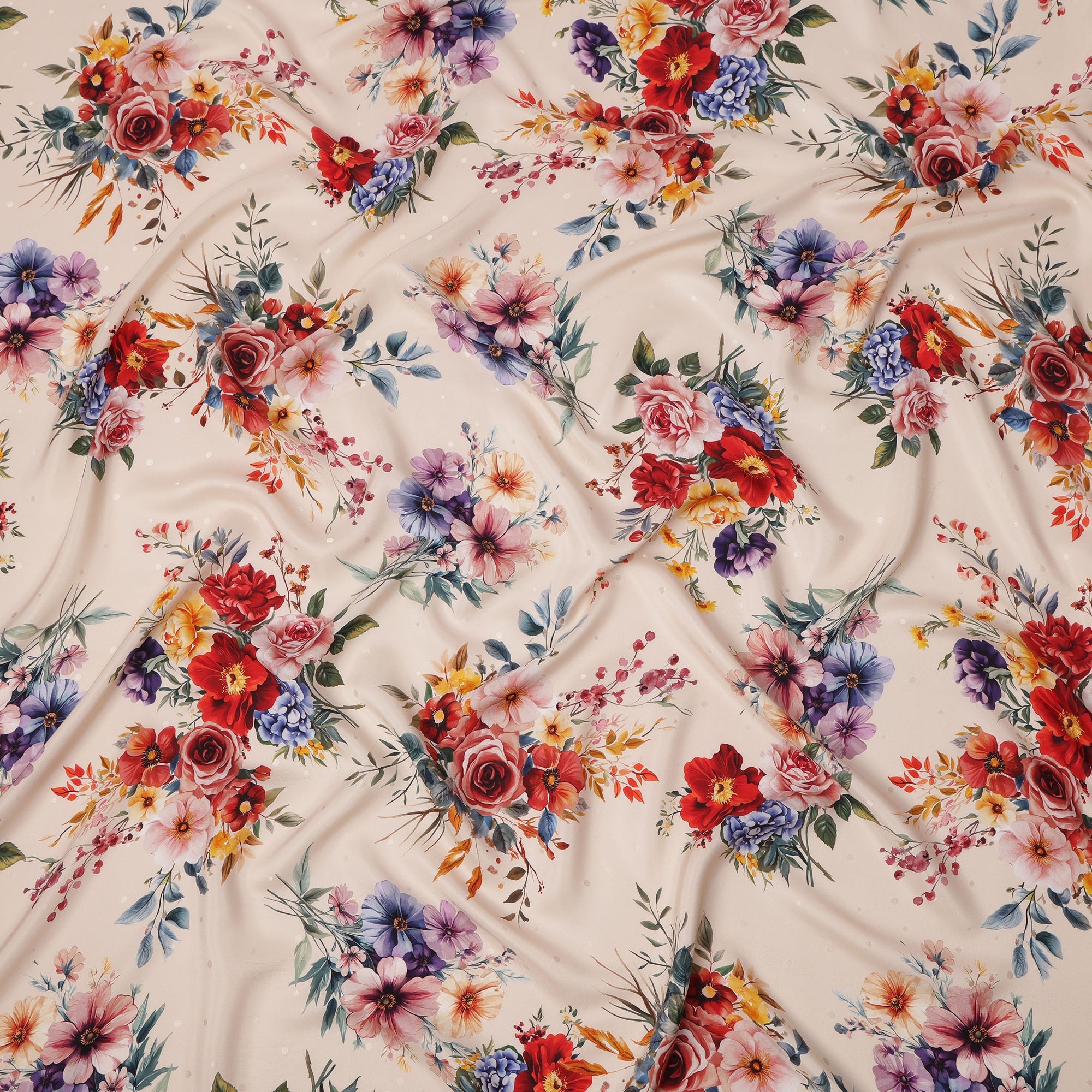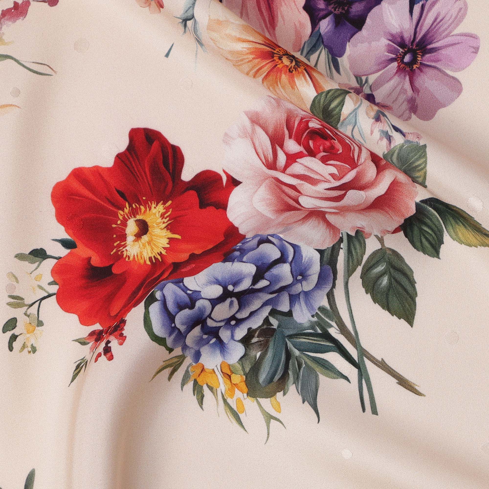 قماش ساتان حريري إيطالي فاخر مع طباعة باقة زهور متعددة الألوان باللون الكريمي