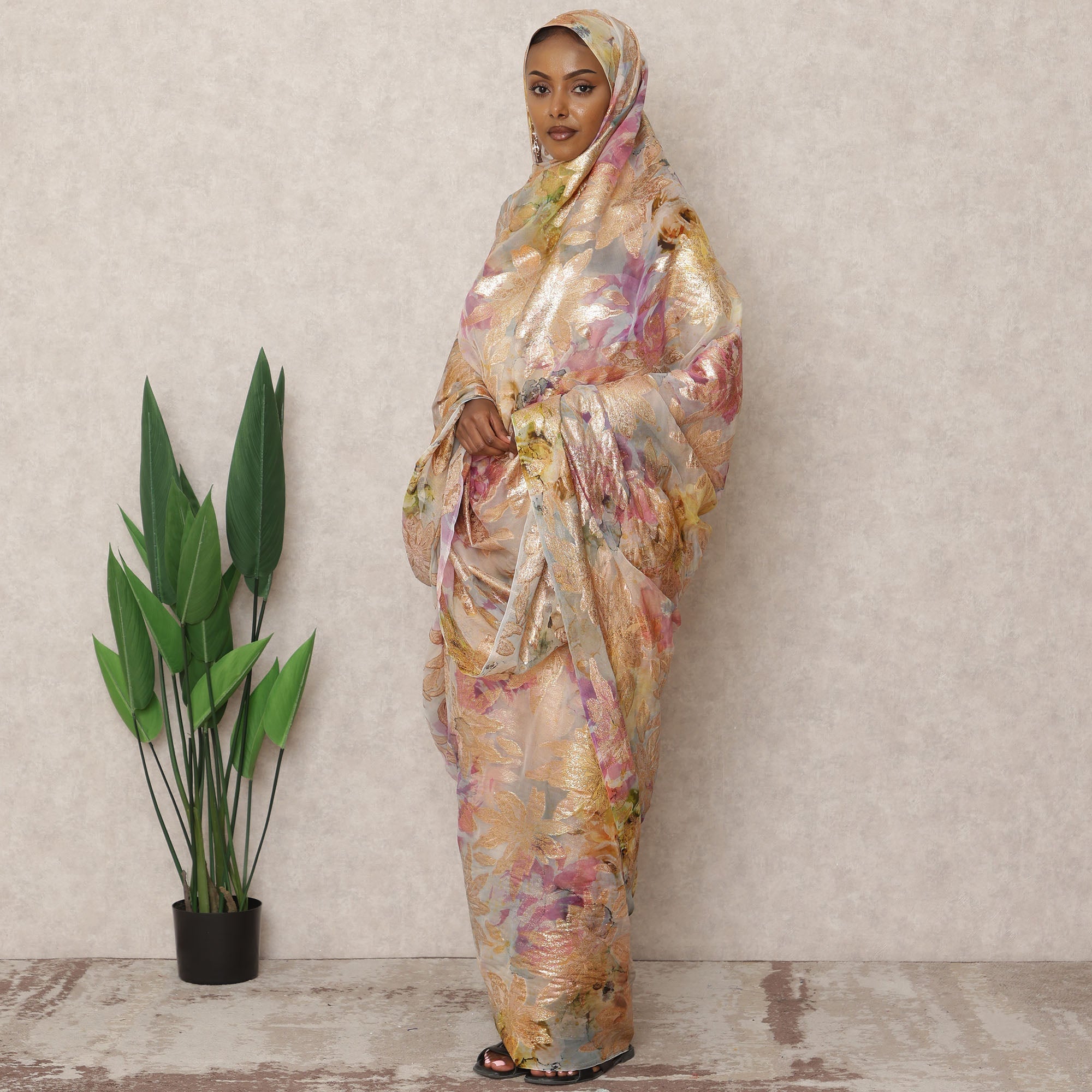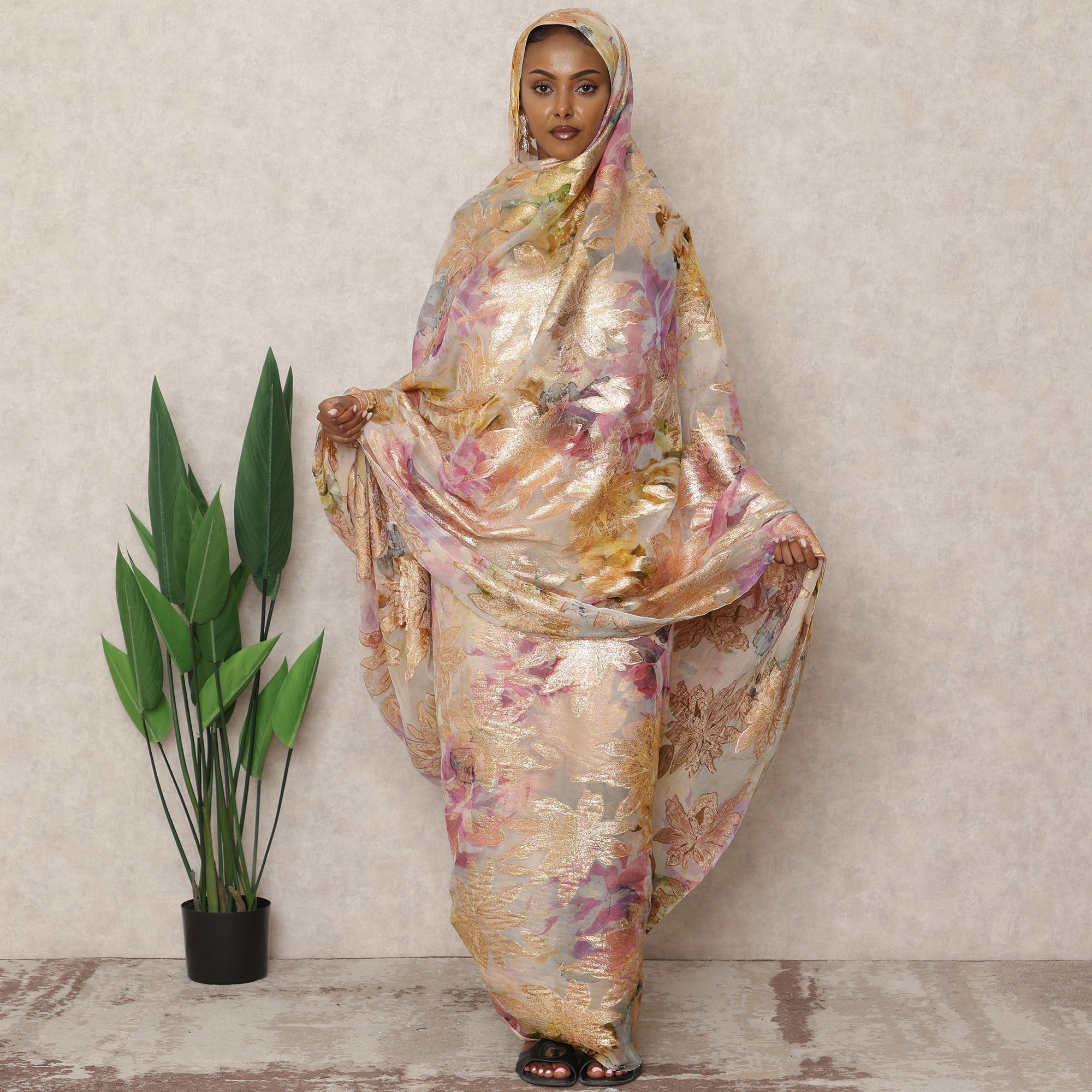 احتفلي بأناقة خالدة مع هذا الثوب السوداني الكريمي متعدد الألوان والمزين بنقشة زهور، والمصنوع من شيفون حريري خالص فاخر، ومُزين بتفاصيل لوركس معدنية لامعة. تتناغم لوحة الألوان الزهرية النابضة بالحياة، من الوردي الناعم والذهبي ودرجات الباستيل، ببراعة على القماش، مما يُضفي لمسة جمالية آسرة وأنيقة، مثالية للمناسبات الاحتفالية أو الاحتفالات الثقافية. هذه التحفة الفنية، بطول 4.5 متر وعرض 140 سم، تنساب بانسيابية، لتمنحكِ تنوعًا كبيرًا في الأناقة وسحرًا أنيقًا. صُنع في كوريا الجنوبية، ويتميز بنسيج خفيف الوزن يسمح بمرور الهواء، مما يضمن لكِ الراحة والأناقة، مما يجعله خيارًا لا يُقاوم لمن يبحثن عن ملابس تقليدية فاخرة بلمسة عصرية عبر الإنترنت.