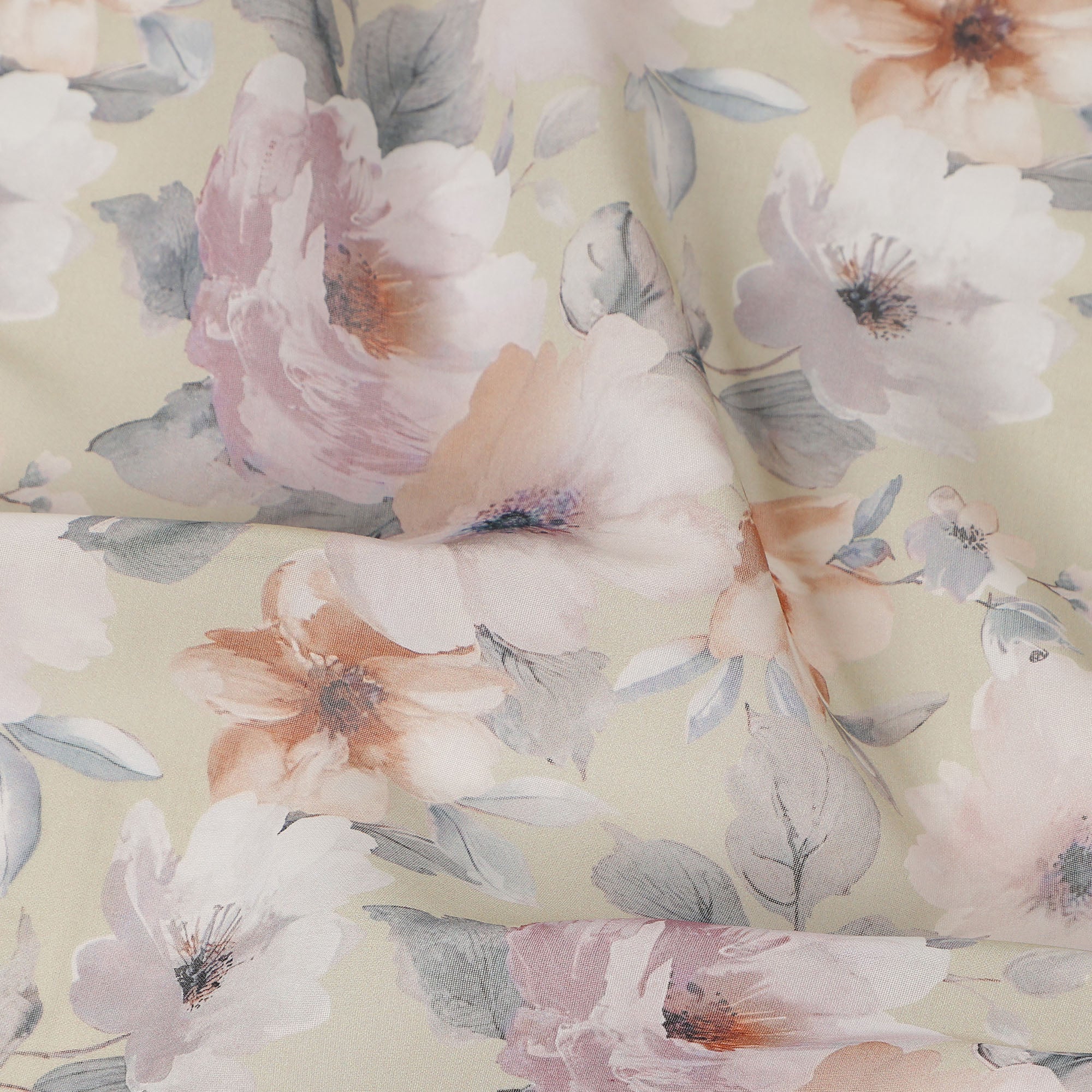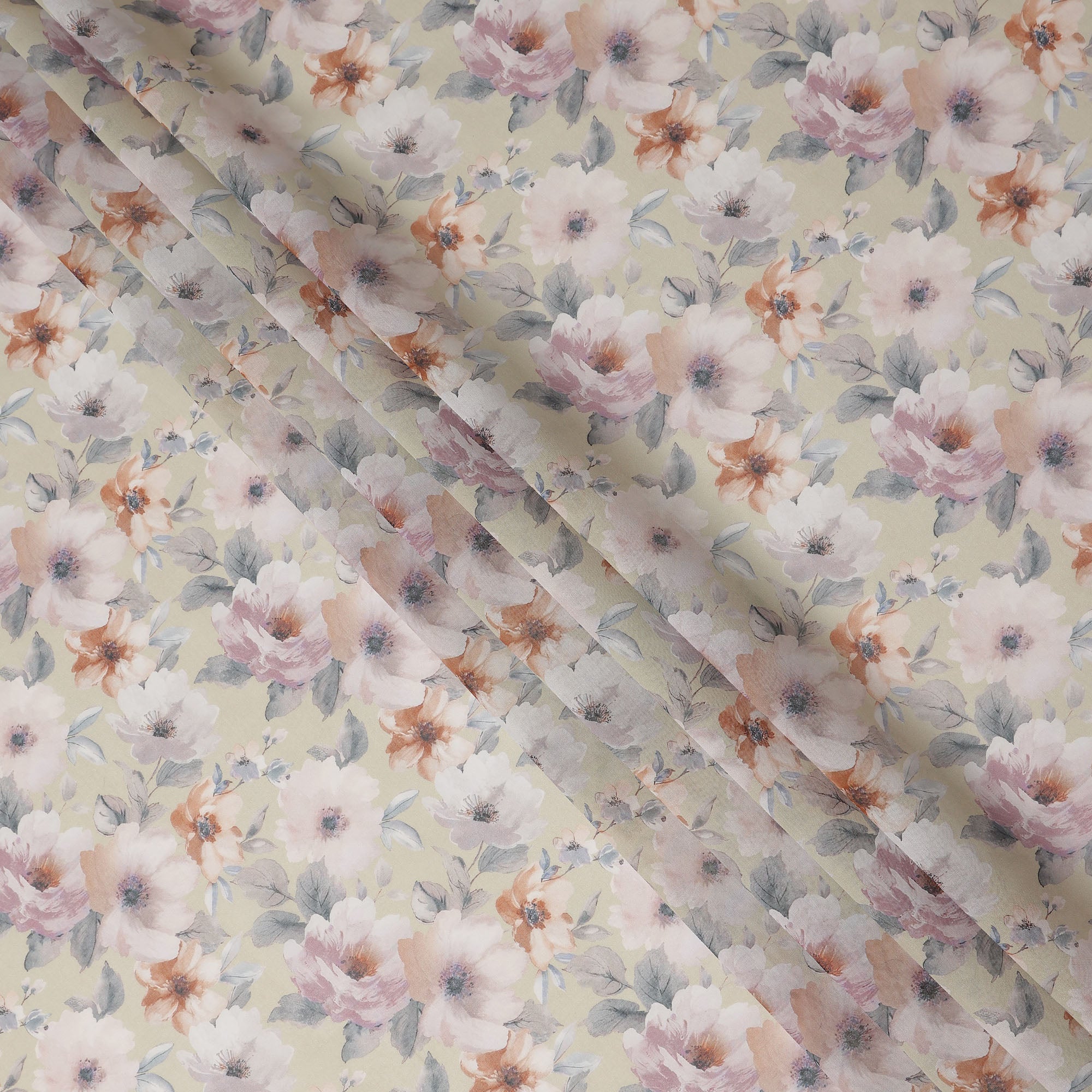 This cream pastel floral blossom printed cotton voile fabric features a soft cream base beautifully highlighted with delicate blush pink, warm peach, and muted lavender blossoms accented by subtle grey foliage, creating a light and graceful aesthetic. Crafted from lightweight and breathable cotton voile, it offers a smooth and airy texture that feels gentle against the skin while allowing elegant drape and fluid movement. With a generous 150 cms width, this fabric is ideal for dresses, blouses, tunics, scarves, and charming home décor accents. Perfect for designers, boutiques, and DIY sewing enthusiasts, it blends romantic floral style with everyday comfort and versatile usability for refined creations.