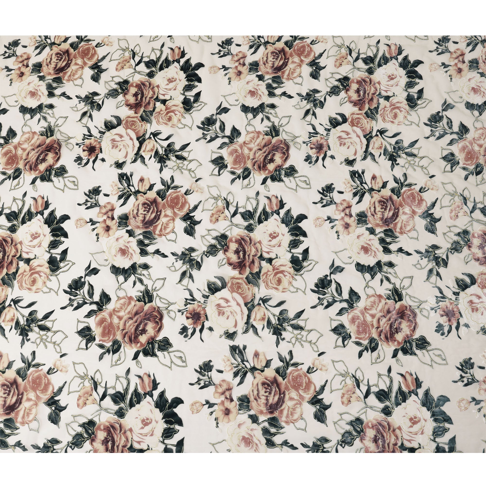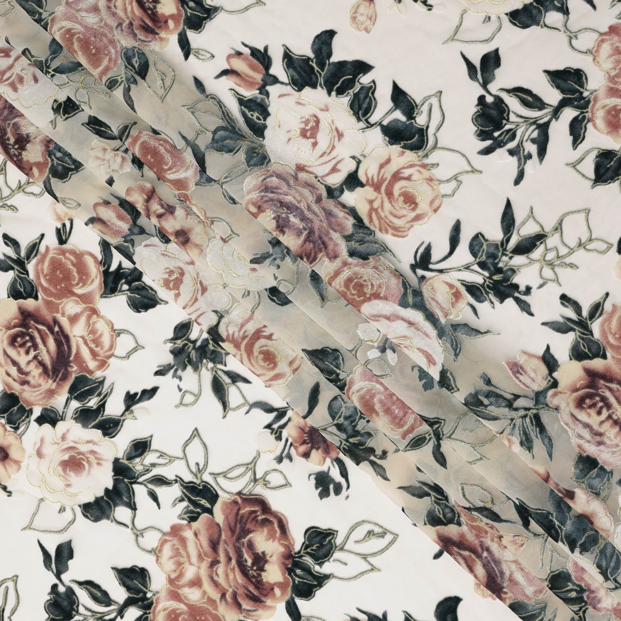 Cream Rose Floral Printed Silk Blended Velvet Fabric with Multi-Tone Detailing, 140 cm Width, Made in China-D26637