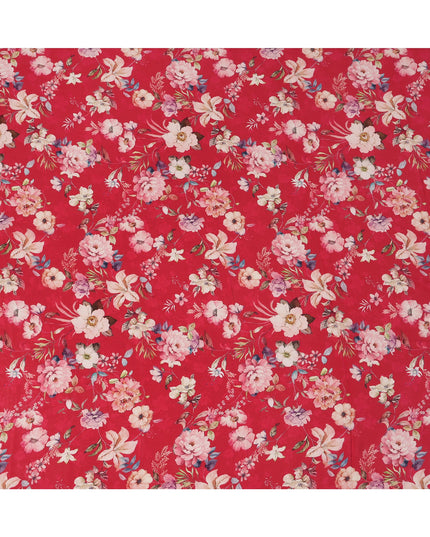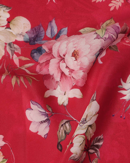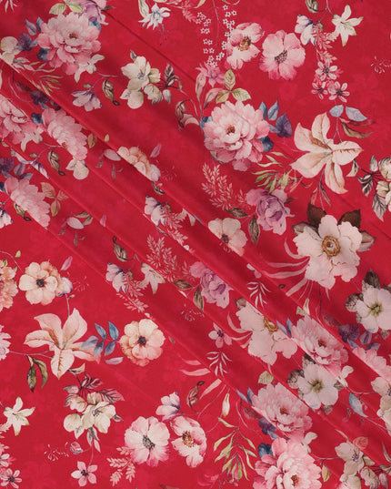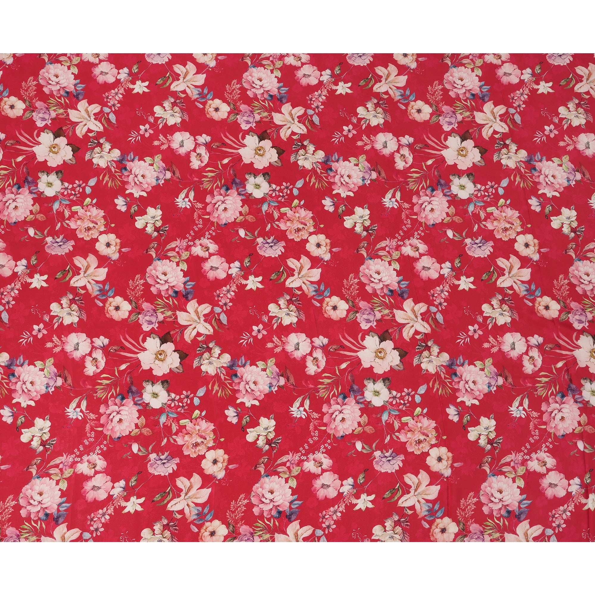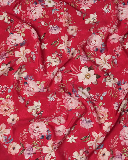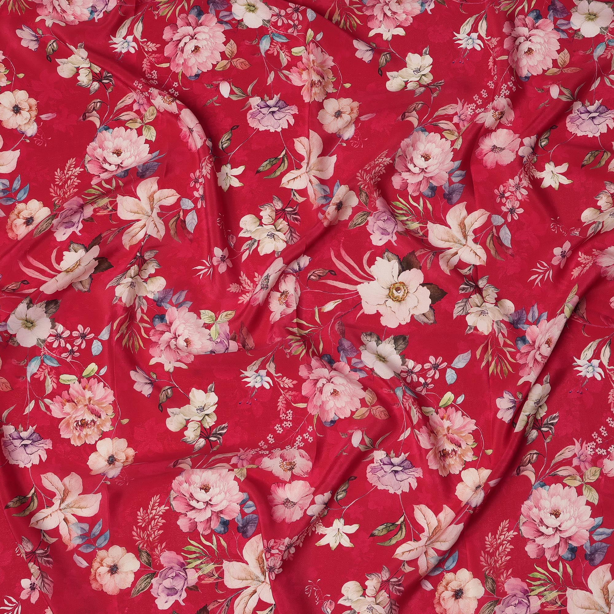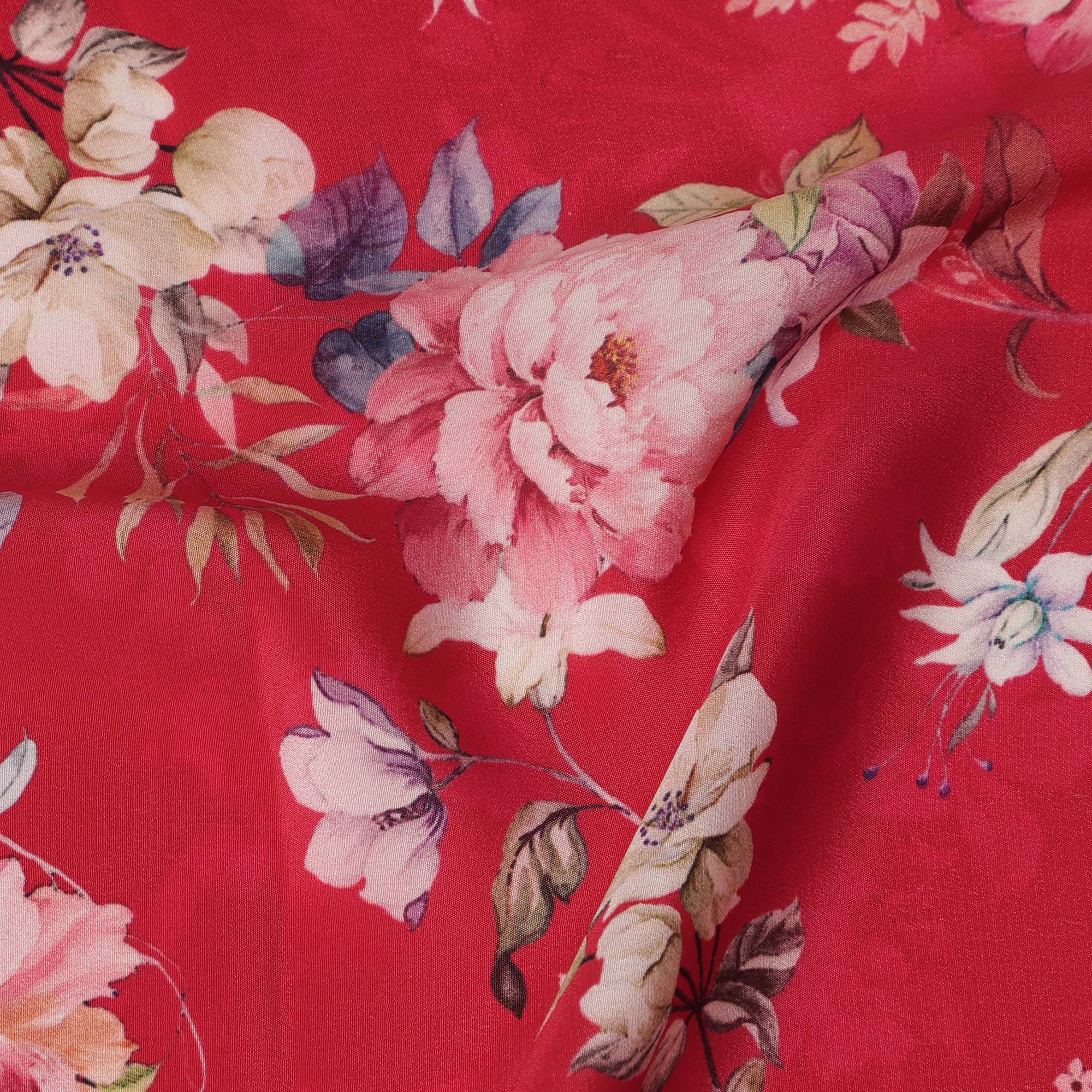 قماش كريب حريري أحمر قرمزي مطبوع عليه زهور بنقشة زهور الباستيل، عرض 110 سم، صنع في الهند - D23347