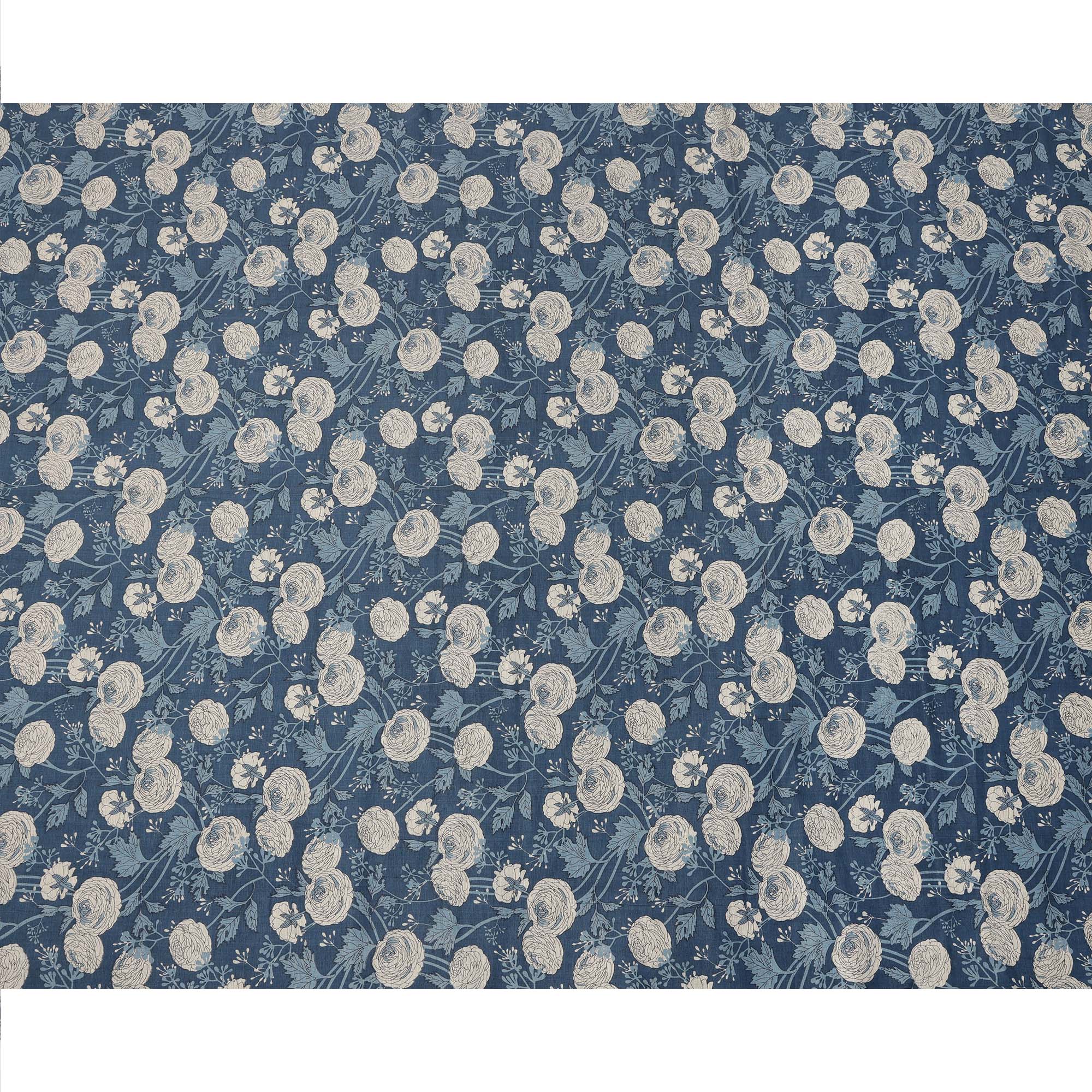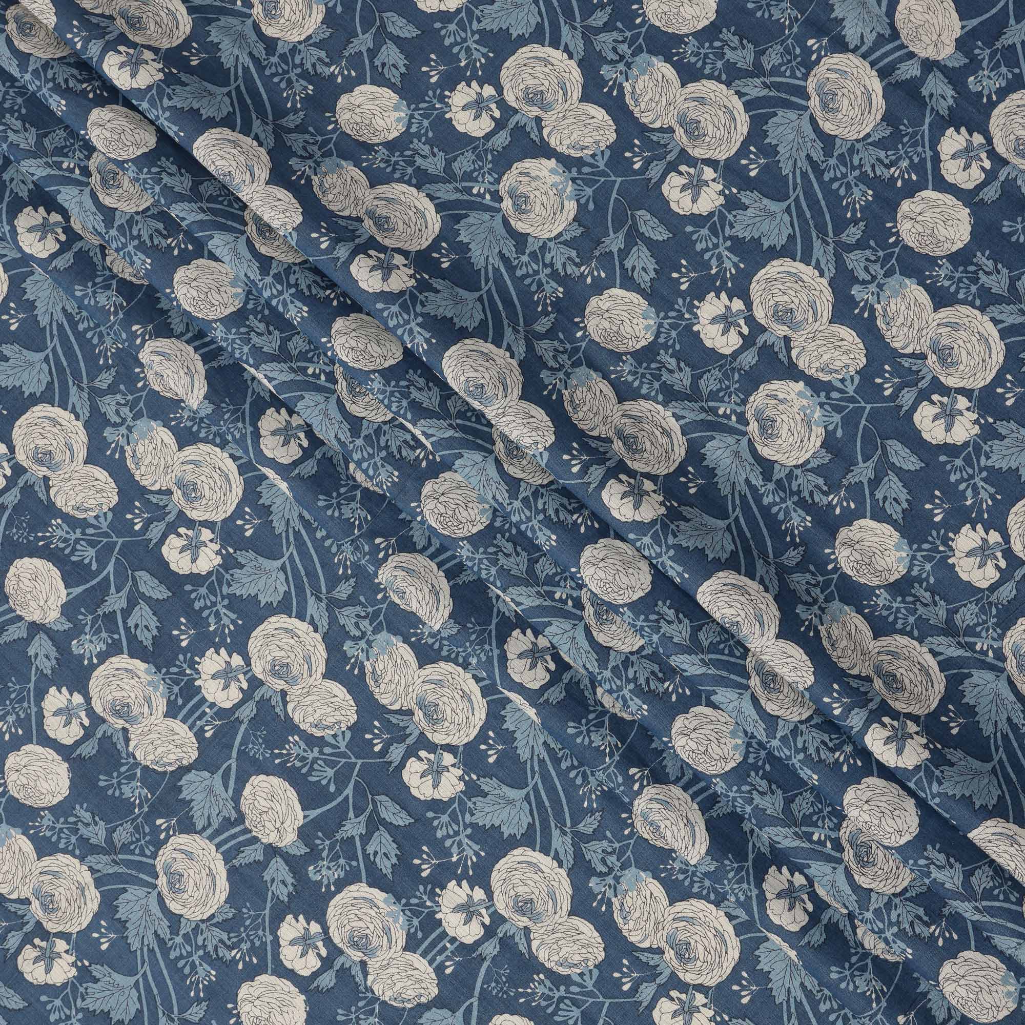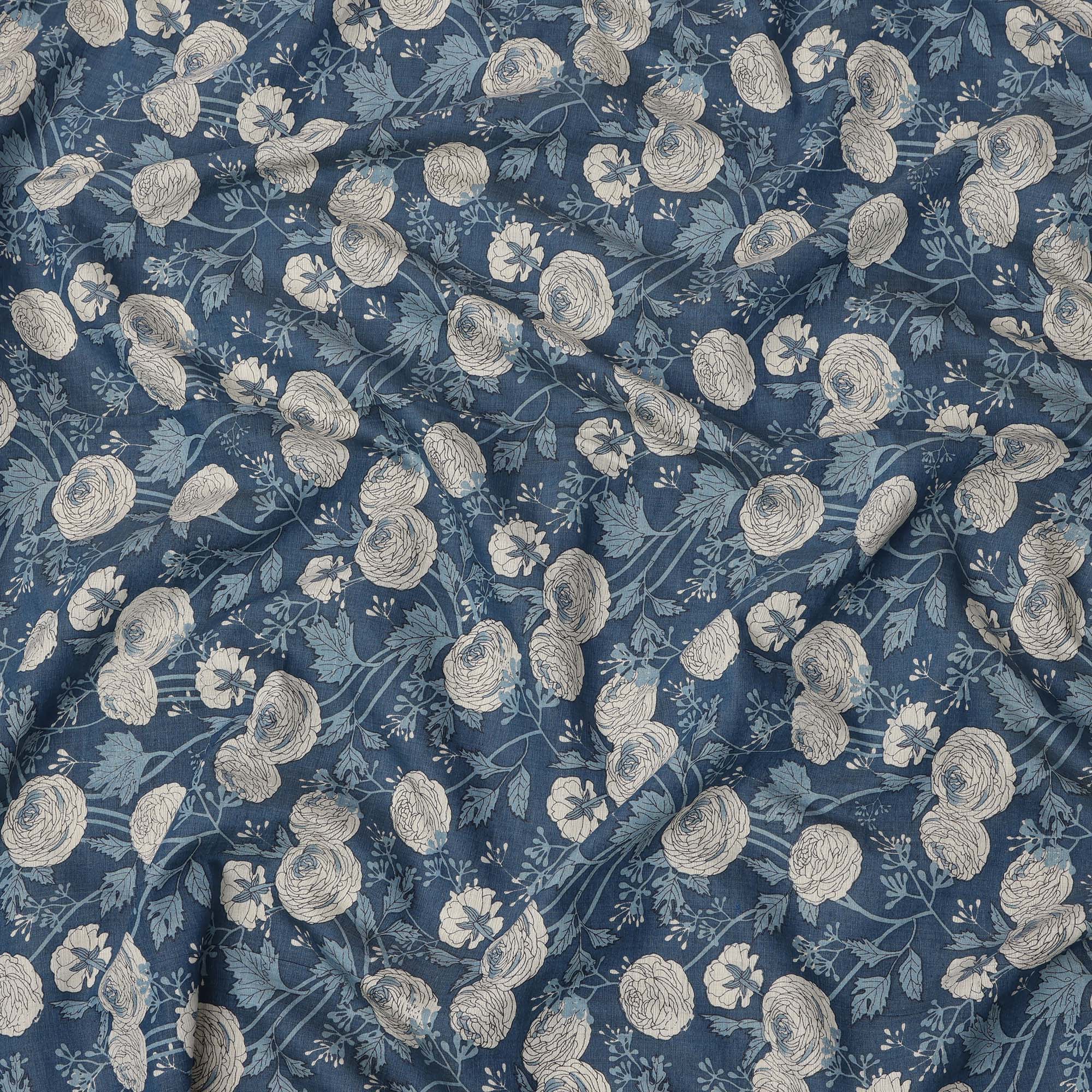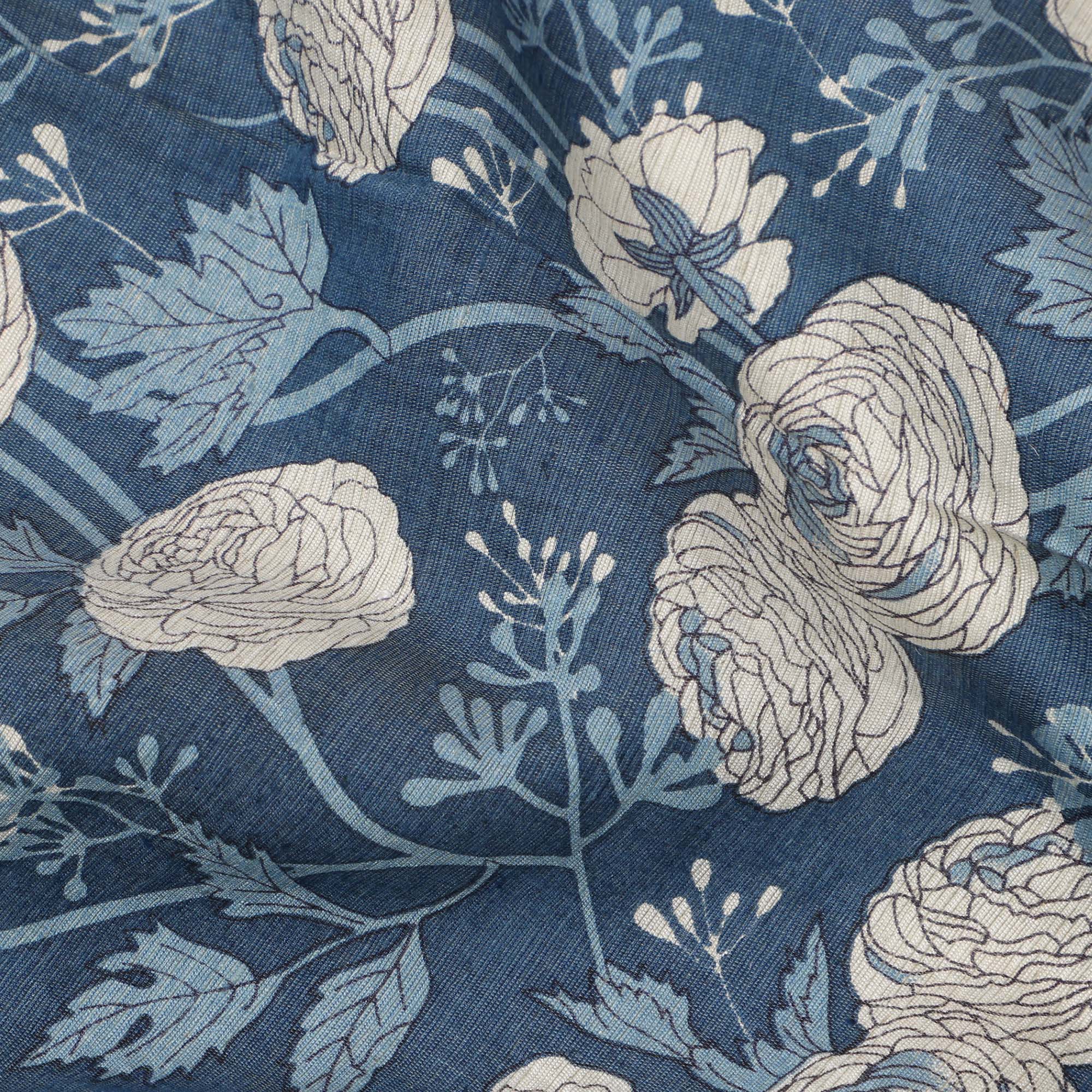 قماش قطني بقاعدة زرقاء داكنة مع رسومات نباتية باللونين البيج والأزرق، تصميم فني مرسوم يدويًا، عرض 110 سم، صنع في الهند - D23780
