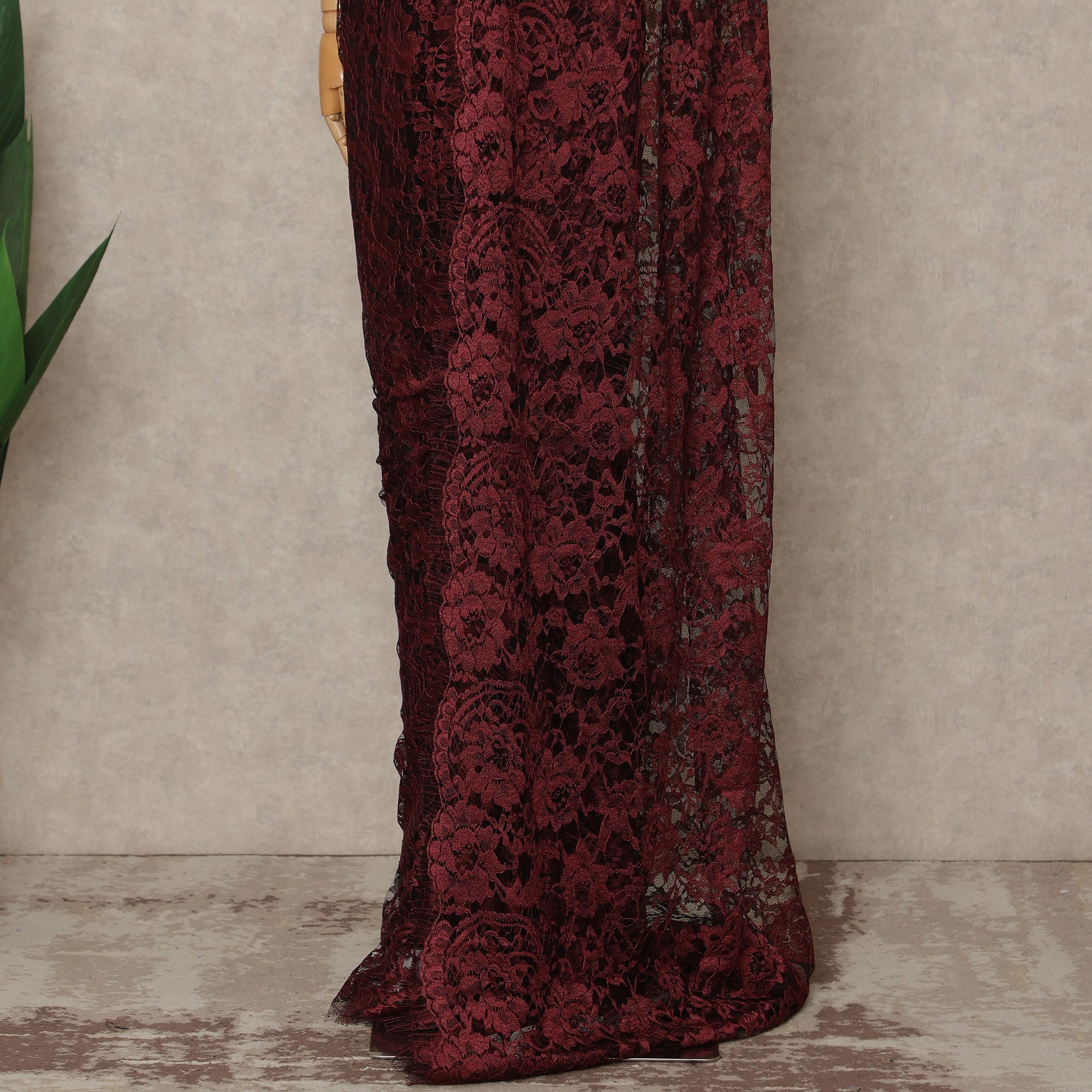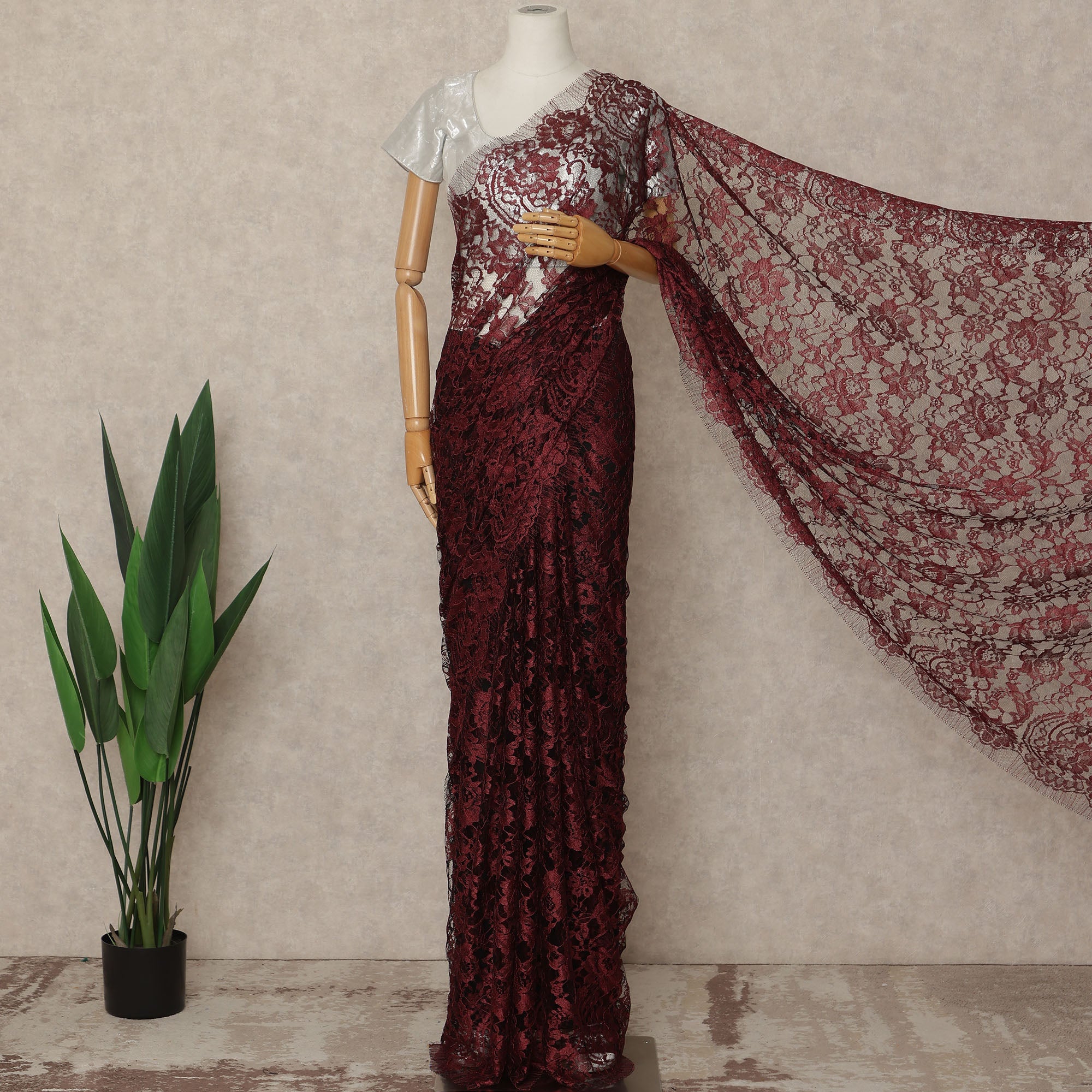Deep Maroon Premium French Chantilly Saree Lace Fabric 5.5 Meters x 110 Cms Width Elegant Floral Net Material From France Unstitched Blouse Not Included-D28159