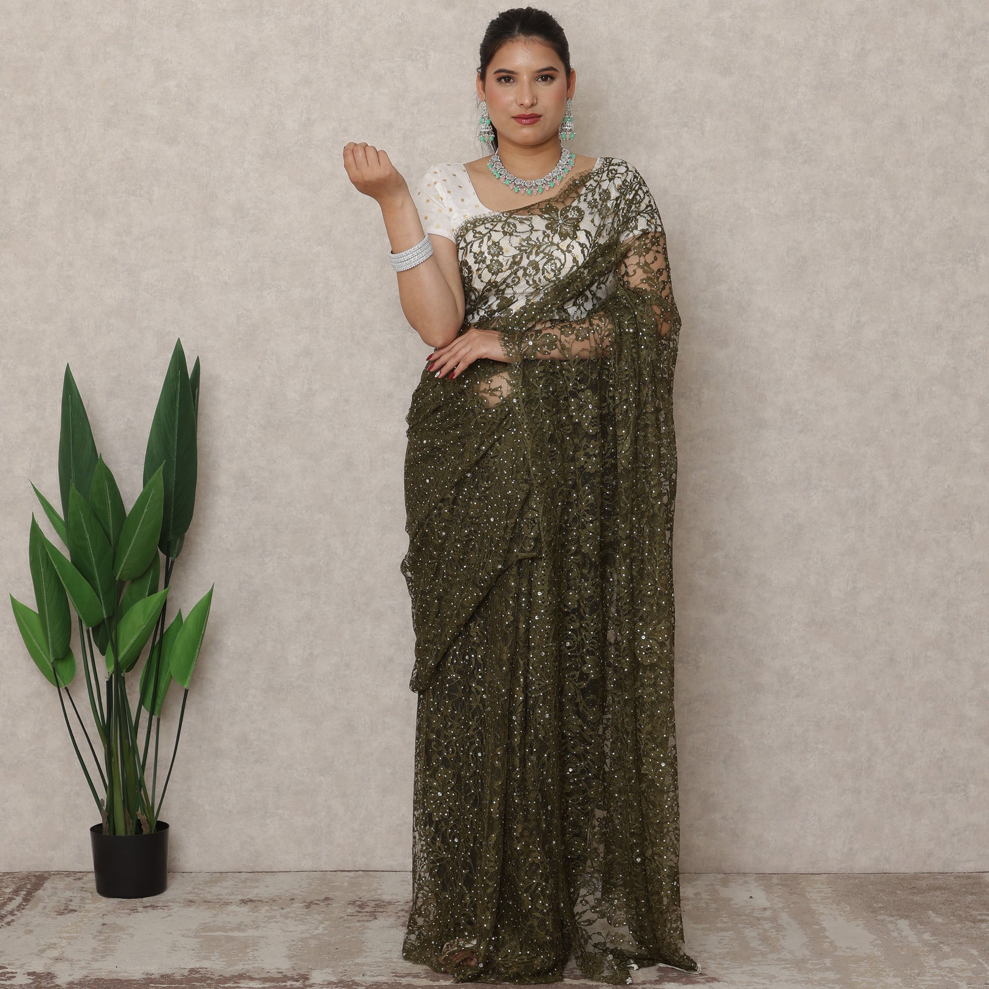 انطلقي في هالة من الفخامة الكلاسيكية مع هذا الساري الأخضر الزيتوني العميق، المصنوع بإتقان من دانتيل شانتيلي الفرنسي الأصيل والمزين... اقرأ أكثر اقرأ أكثر