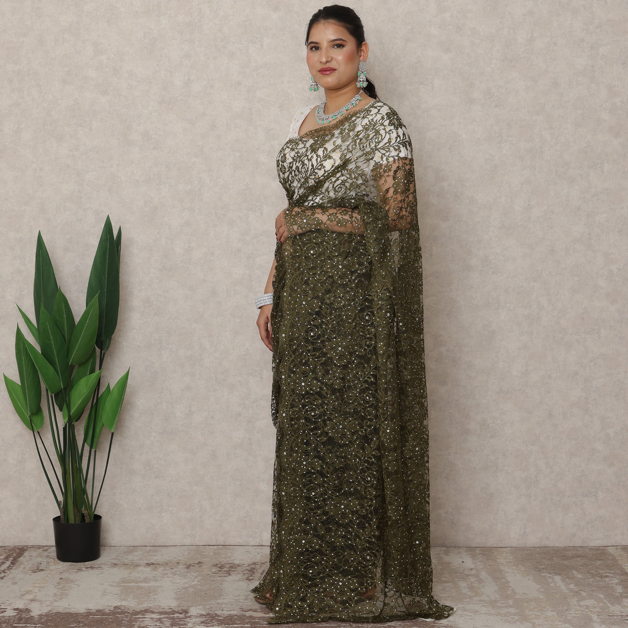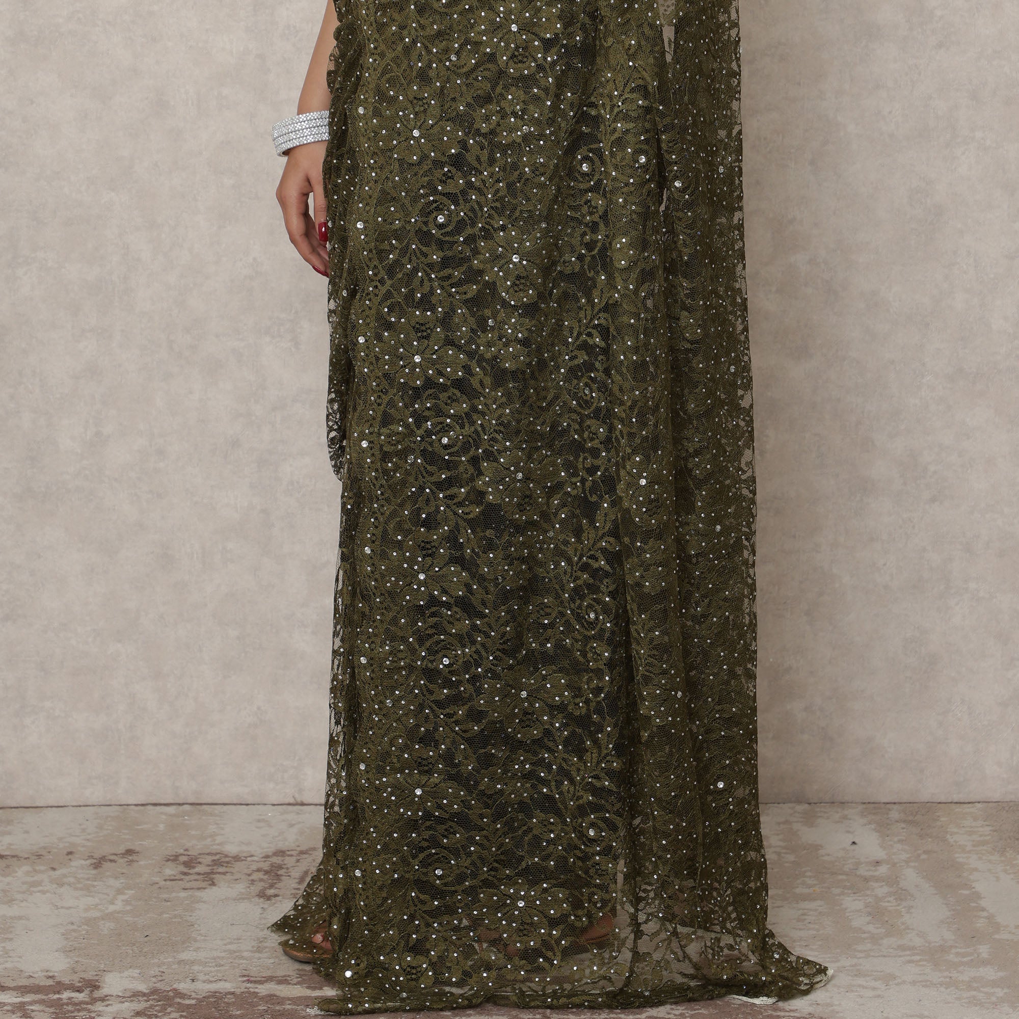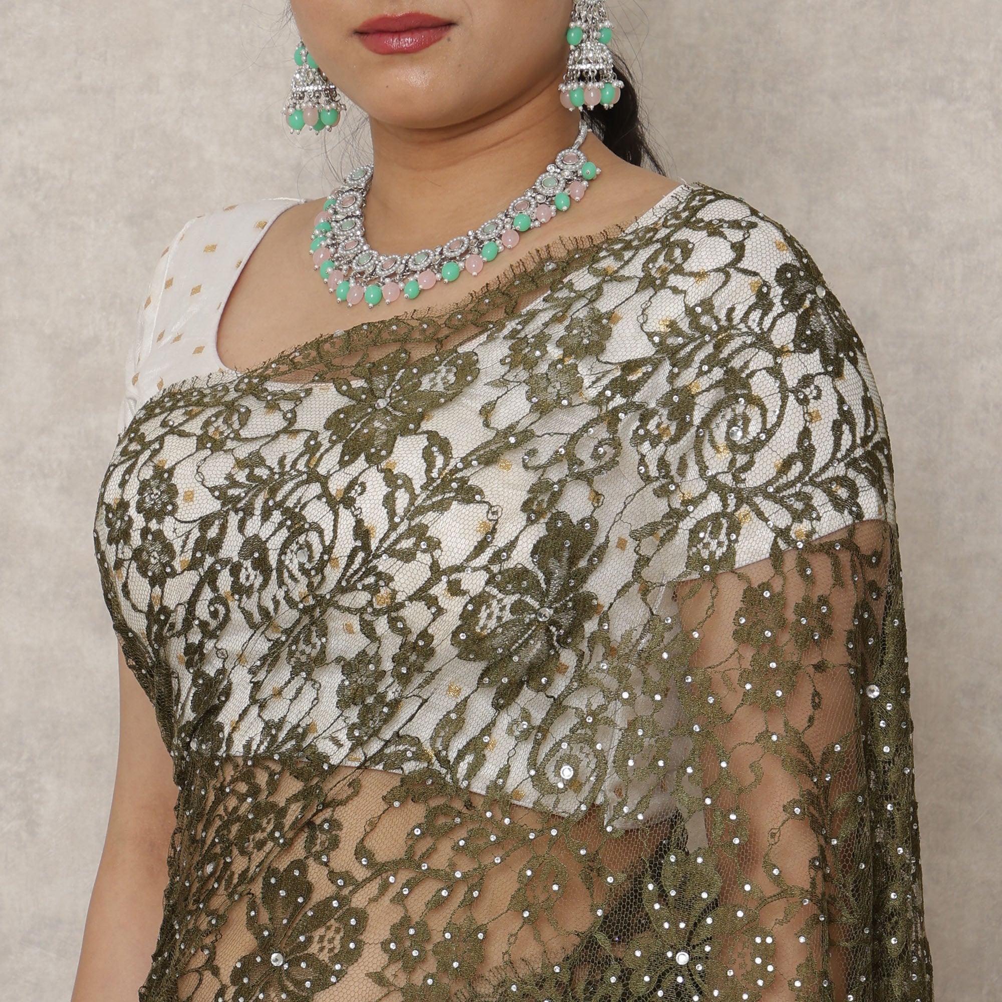 ساري فرنسي فاخر من الدانتيل الشانتيلي باللون الأخضر الزيتوني الغامق مع تطريز حجري، طول 5.5 متر، عرض 110 سم، صنع في فرنسا - D24429